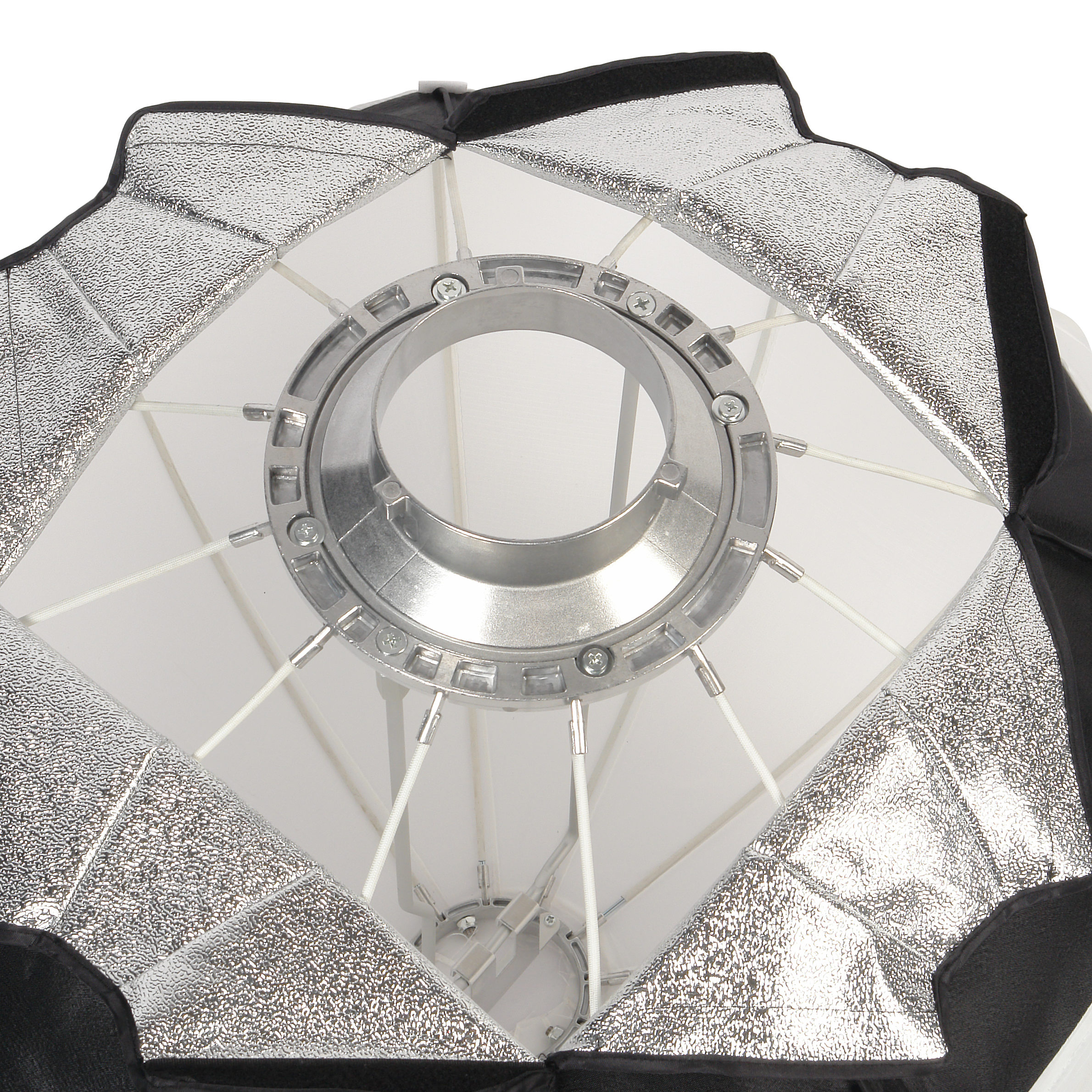 Легкая установка и быстрая разборка – софтбокс приводится в рабочее состояние одним движением руки и также легко разбирается. Каркас представляет собой два кольца, с зафиксированными 12 гибкими спицами. На одном из колец находится скоба, которая будет удерживать каркас в рабочем положении.