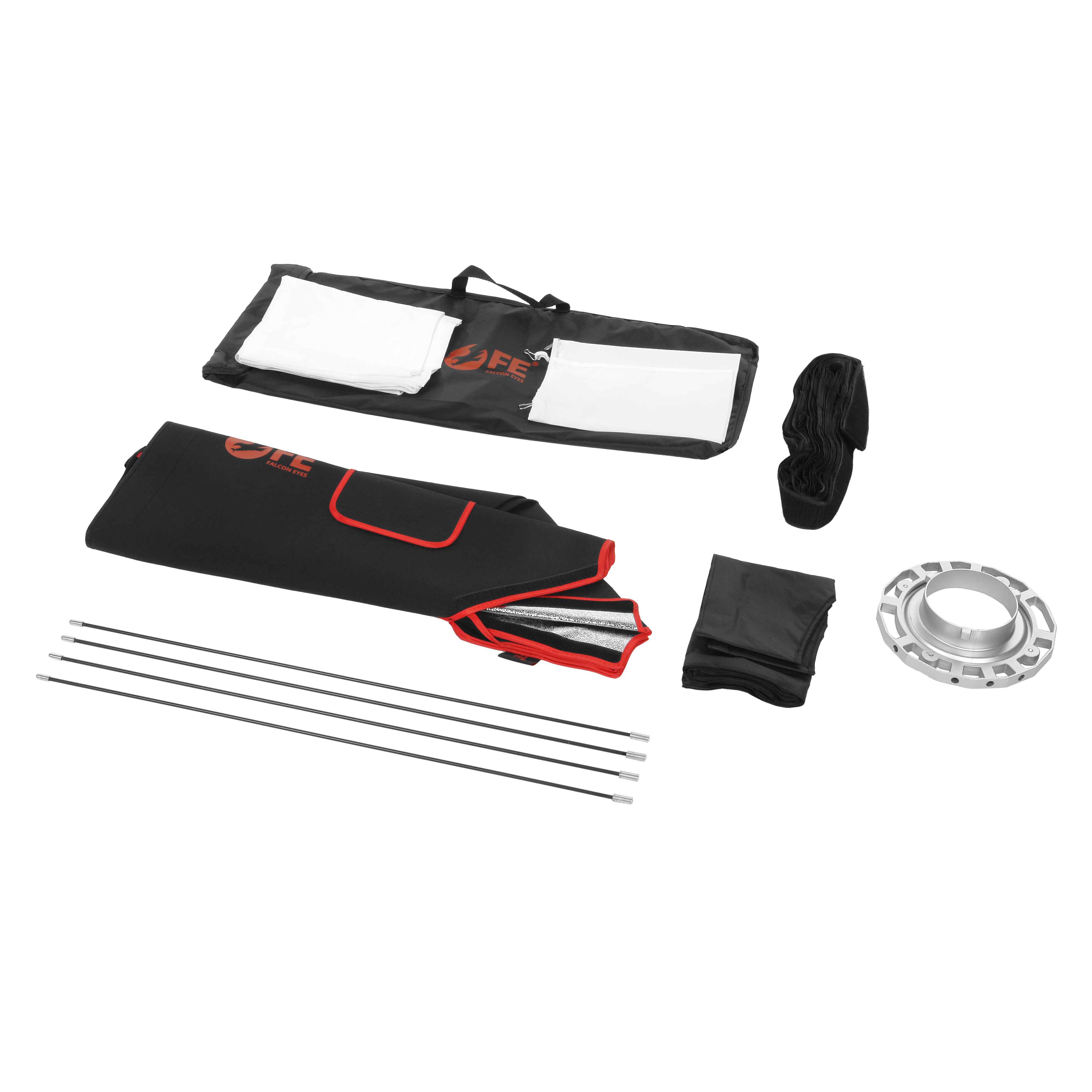 Несущий каркас помимо 4-х стальных спиц включает в себя литой алюминиевый адаптер со сменным байонетным кольцом на Bowens. Для установки софтбокса серии SBQ-SBII на осветительные приборы с другим байонетом можно использовать переходные кольца (приобретаются отдельно, диаметр 144 мм).