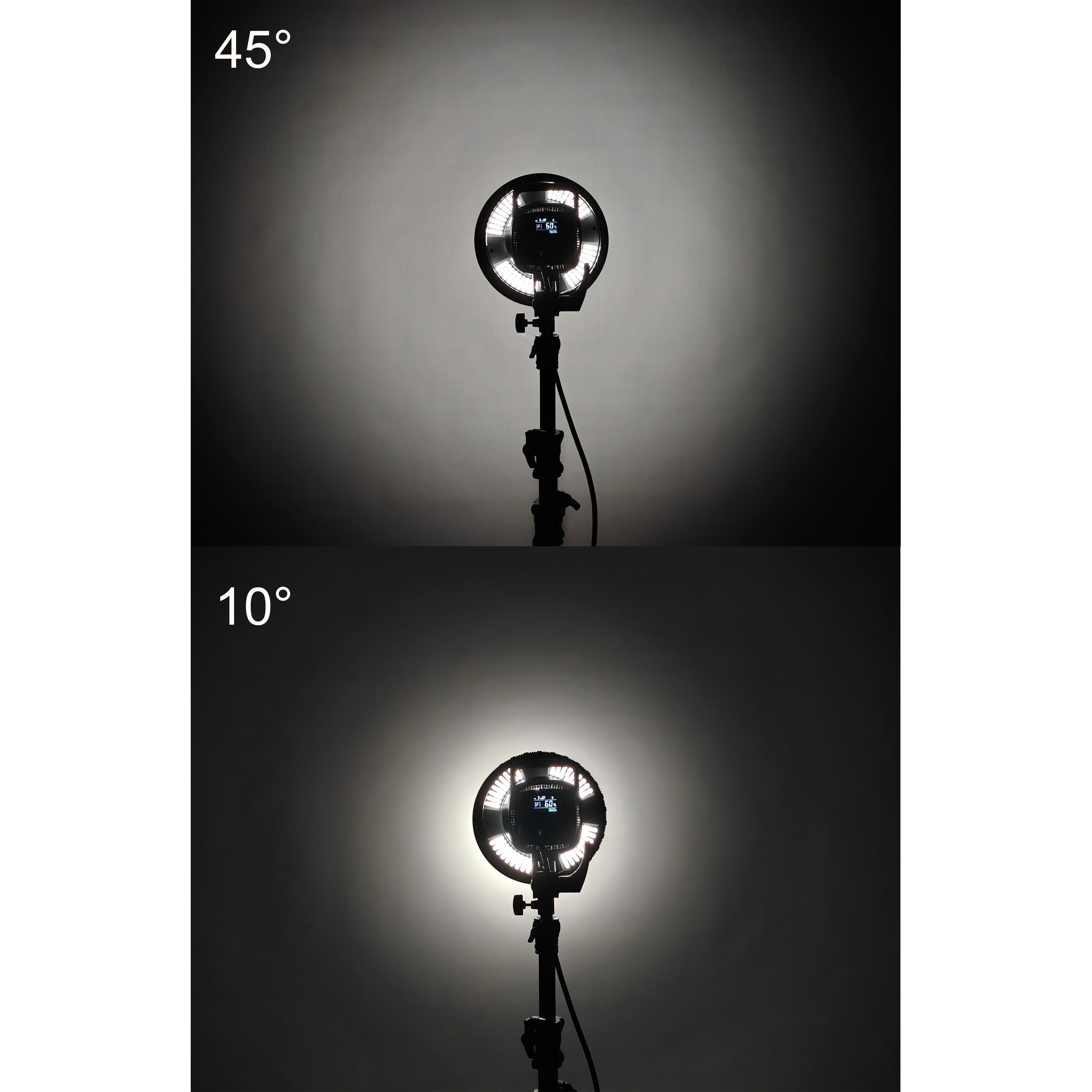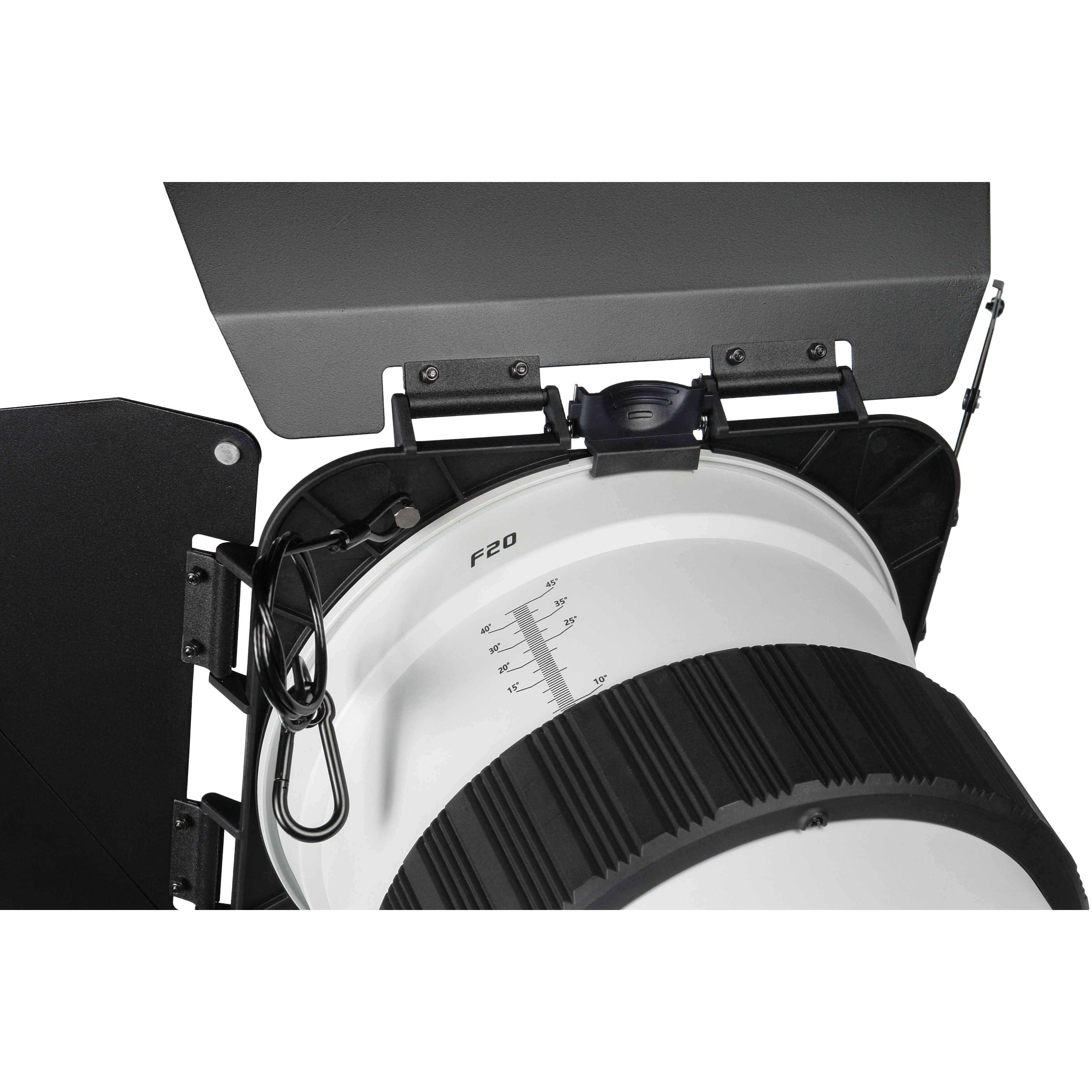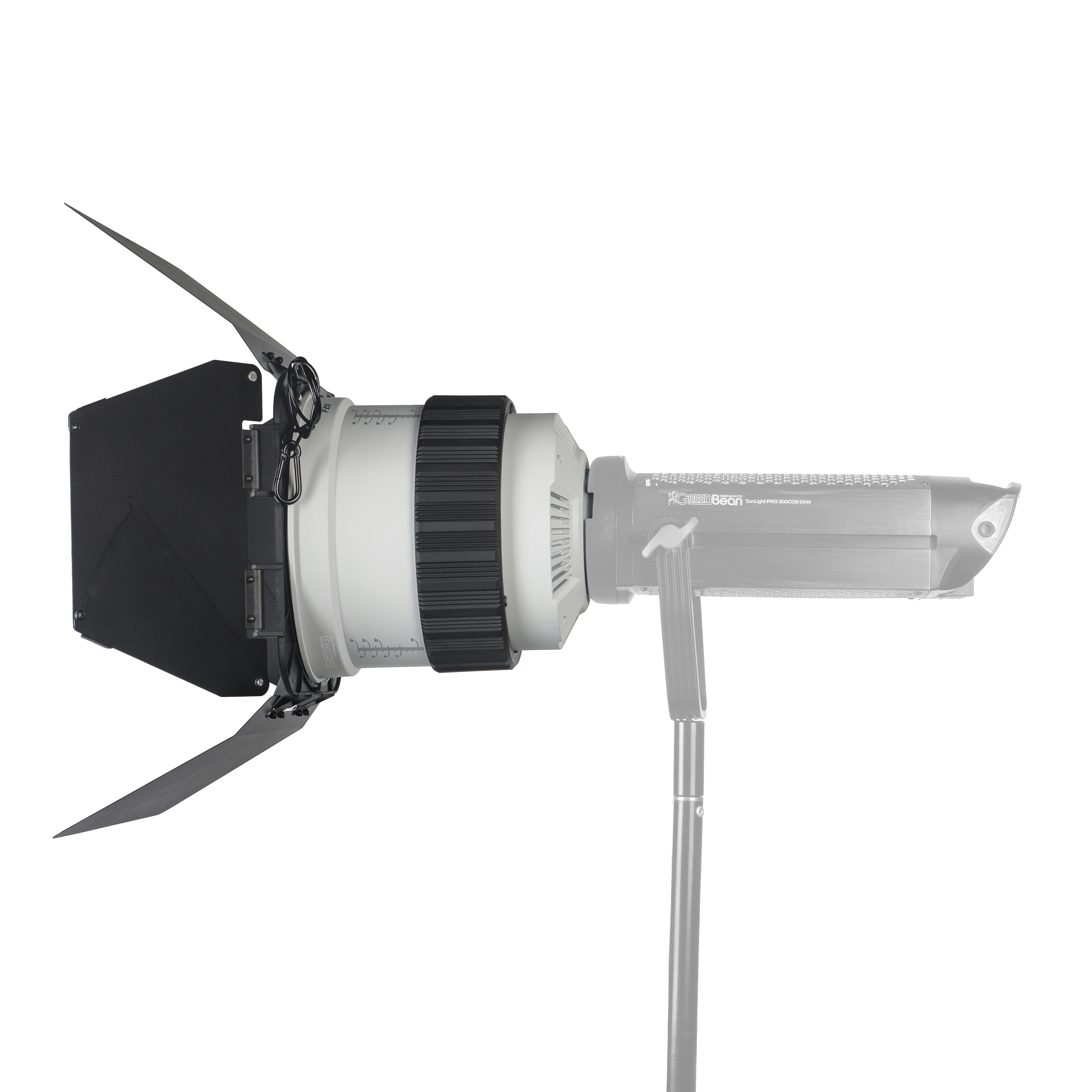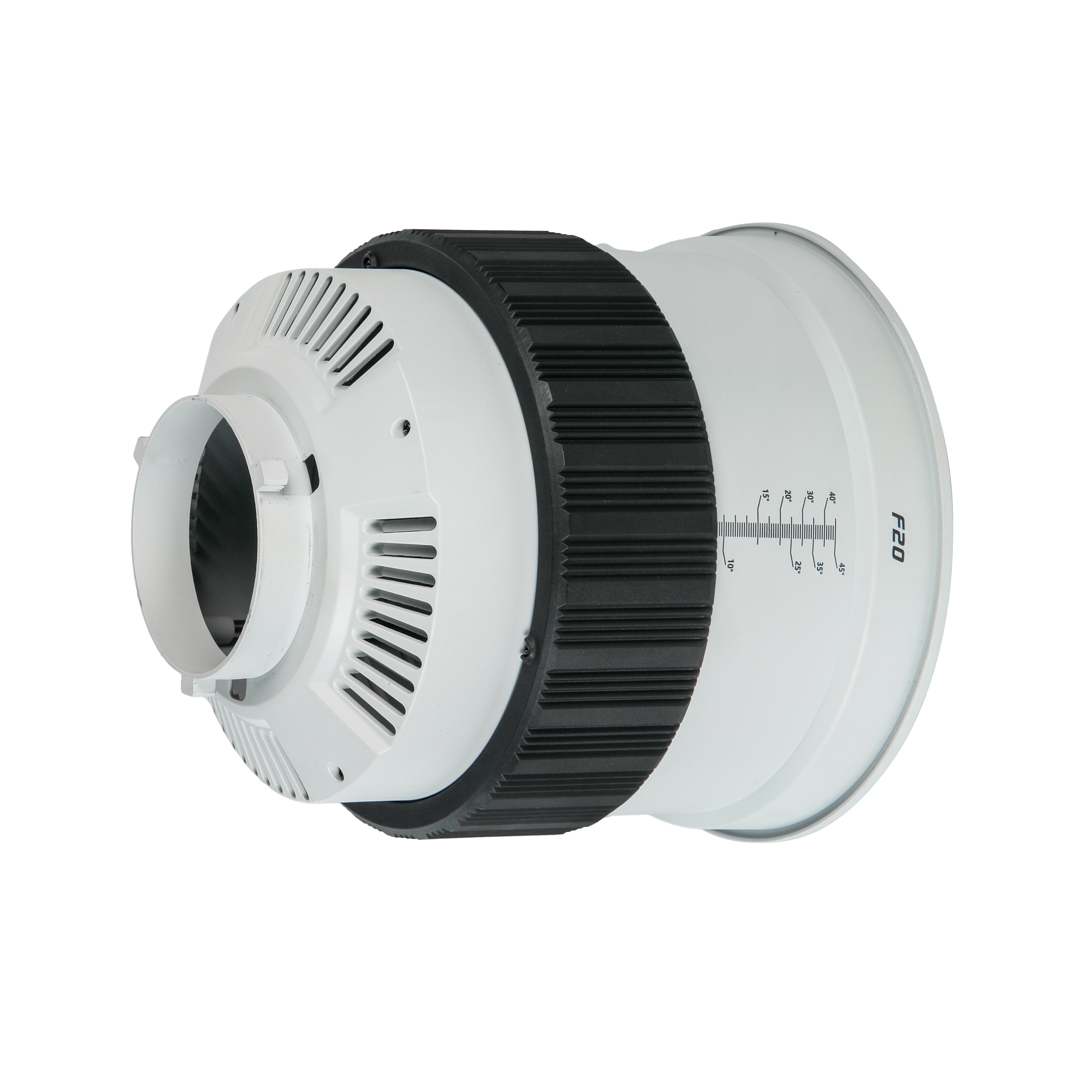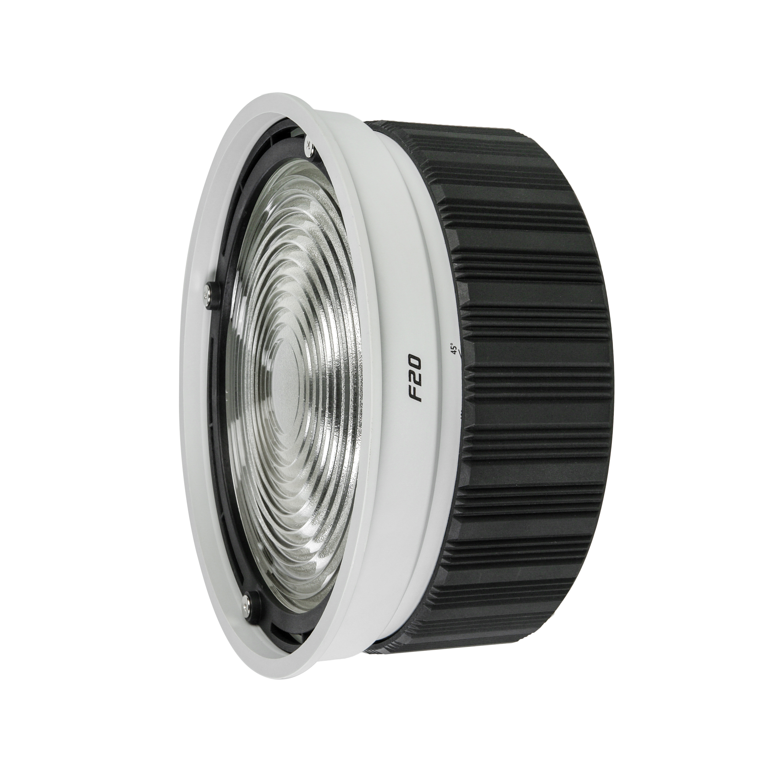 Оптическая насадка GreenBean ZoomMount F20 оснащена линзой Френеля диаметром 200 мм, позволяющей регулировать угол раскрытия светового луча от узкого пучка света (10°) до широкого потока (45°). Размер светового пятна изменяется плавным поворотом регулировочного кольца, снабженного удобной шкалой для точной установки нужного угла освещения.