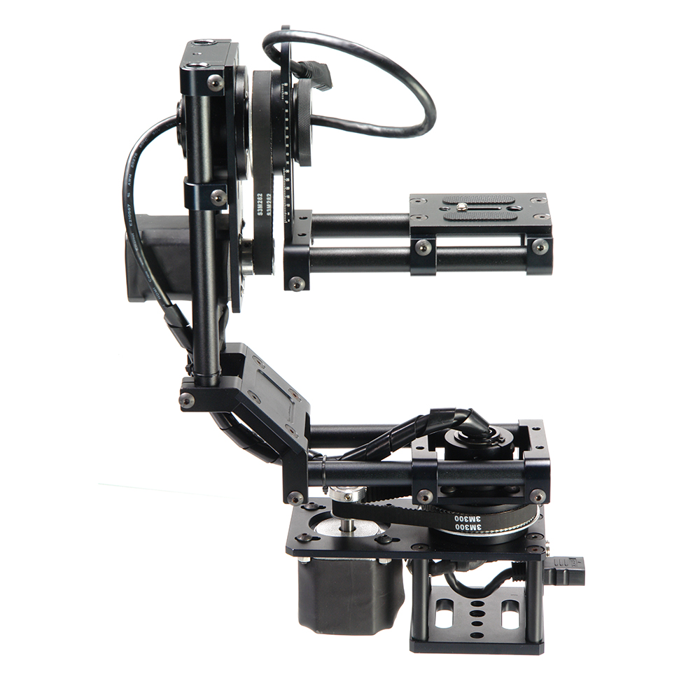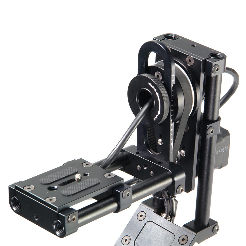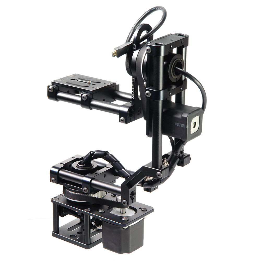 Шаговые двигатели высокой точности, обеспечивают поворот на 360˚, с плавной регулировкой скорости от 0 до 6 (8) об/мин. Управление движением осуществляется с помощью проводного пульта с аналоговым джойстиком (выходной сигнал плавно меняется в зависимости от угла отклонения рукоятки) и раздельными регуляторами скорости, для точного управления съемкой. Работает в режиме Timelapse. Функция памяти крайних положений и запуск автоматического движения по заданной траектории. Передача движения от двигателей к раме осуществляется с помощью зубчато-ременной передачи, обеспечивает точное движение без рывков и люфтов.