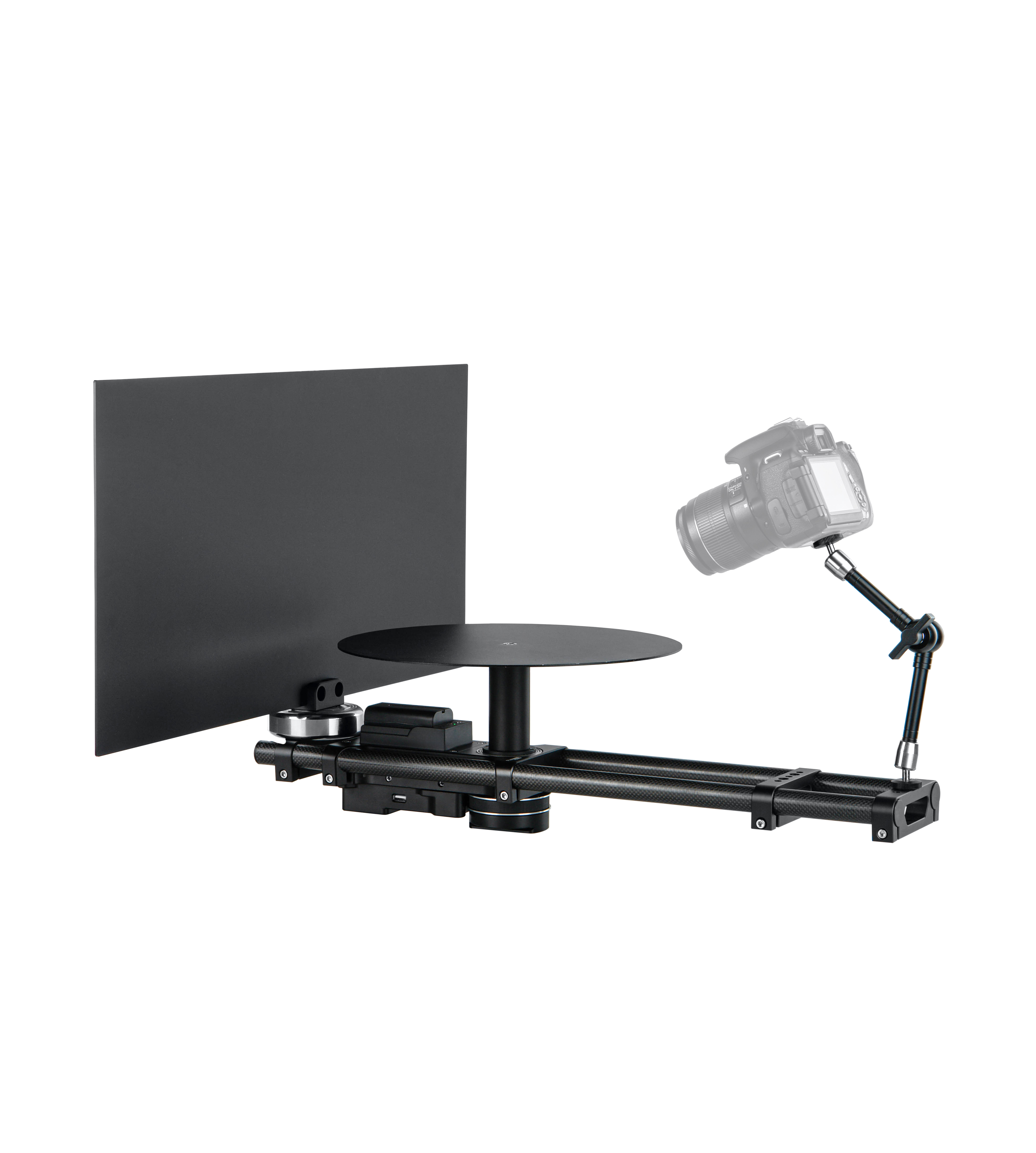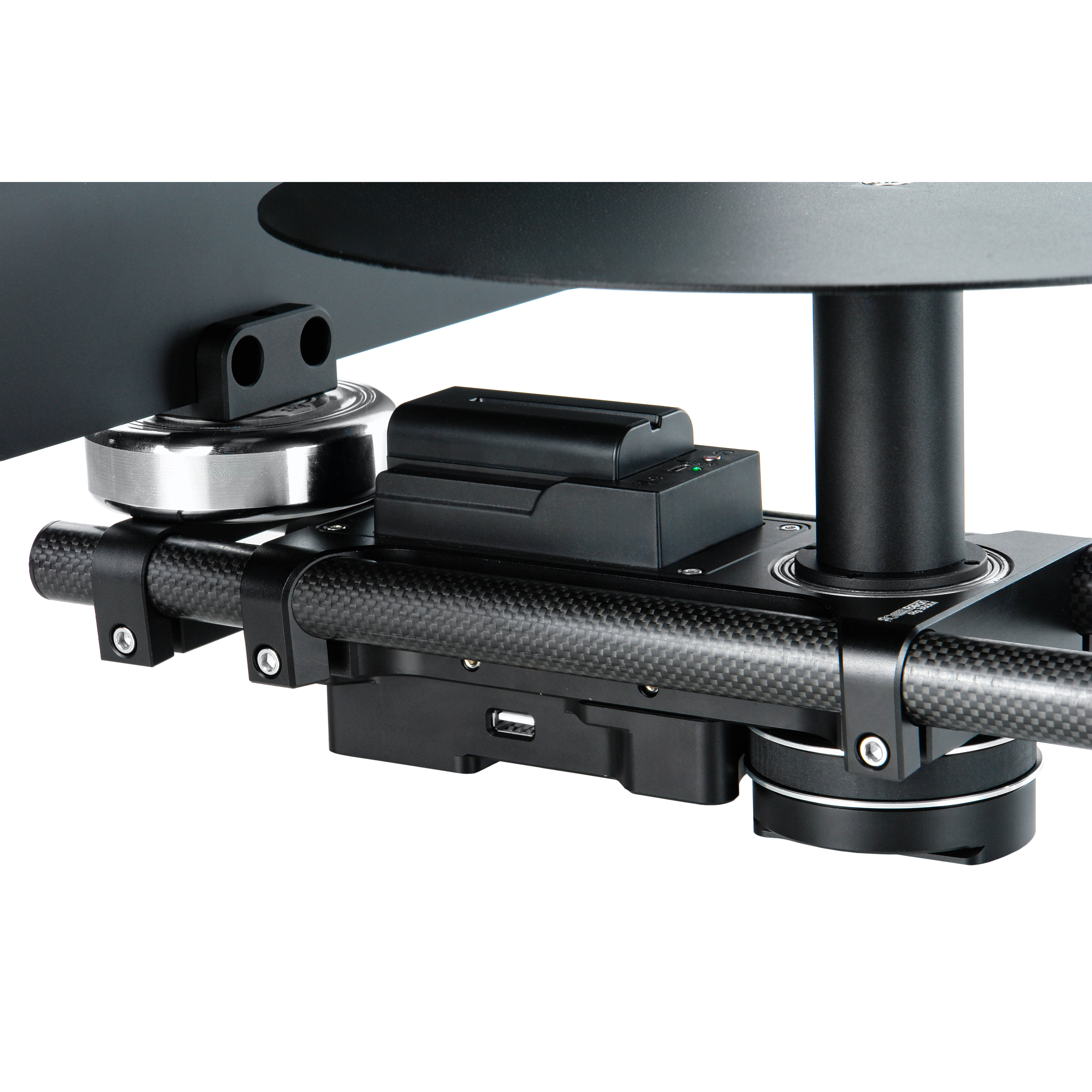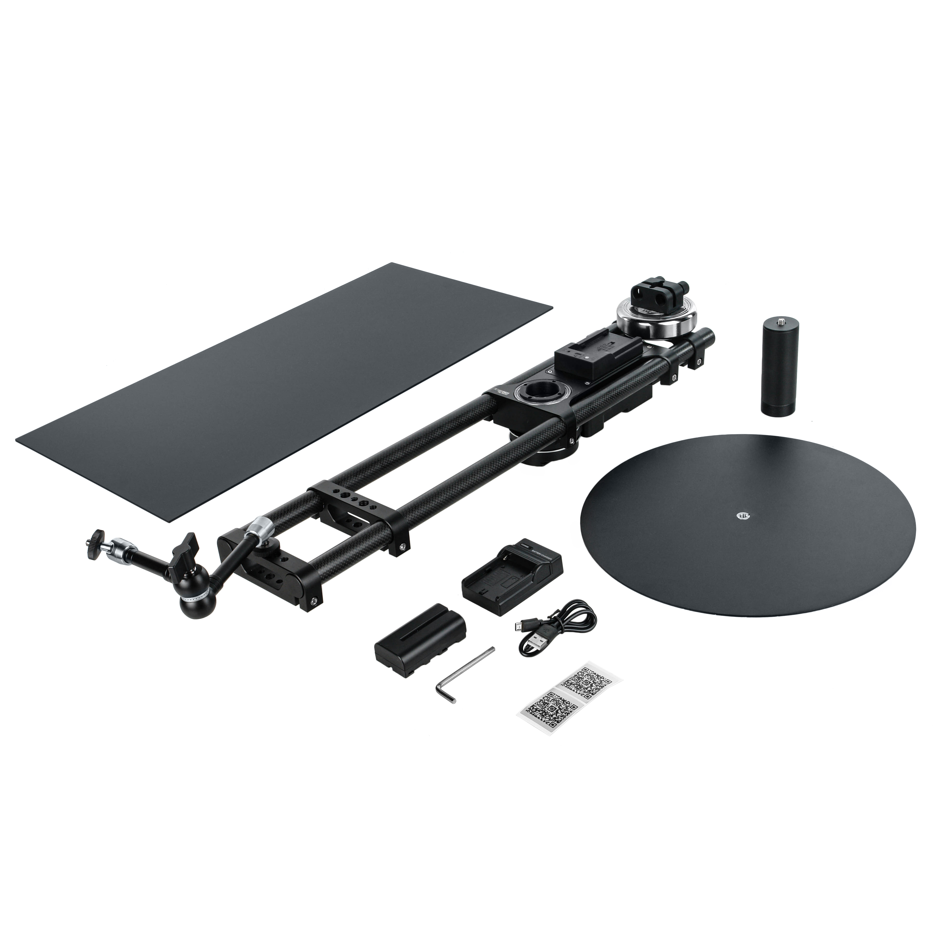 Длина направляющих 600 мм. Диаметр предметного стола 300 мм. Вращение всей конструкции производится электродвигателем постоянного тока, момент вращения от которого передается посредством зубчатого ремня. Это обеспечивает малый уровень шума и отсутствие вибраций и дерганий при движении камеры и фона. Зарядное устройство с USB-кабелем входит в комплект.