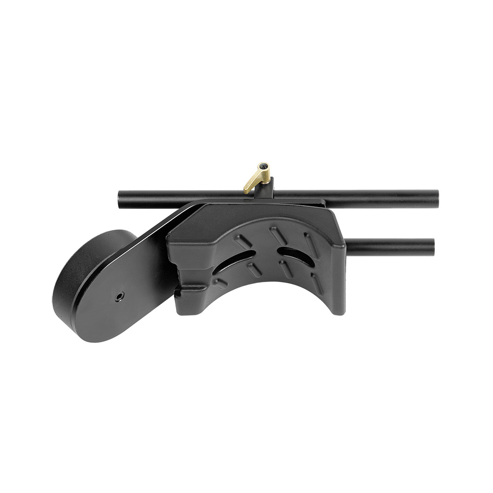 Плечевой упор оснащён съёмным стальным грузом-утяжелителем на винте и регулируемой накладкой из вспененного материала. Подобрать оптимальное положение камеры относительно глаза, отрегулировав плечевой упор, не составит труда для операторов с любым телосложением. Благодаря регулируемой скобе, положение суппортов плечевого упора может быть смещено относительно базовых суппортов (скоба имеет подвижные элементы смещающиеся по горизонтали и вертикали).
