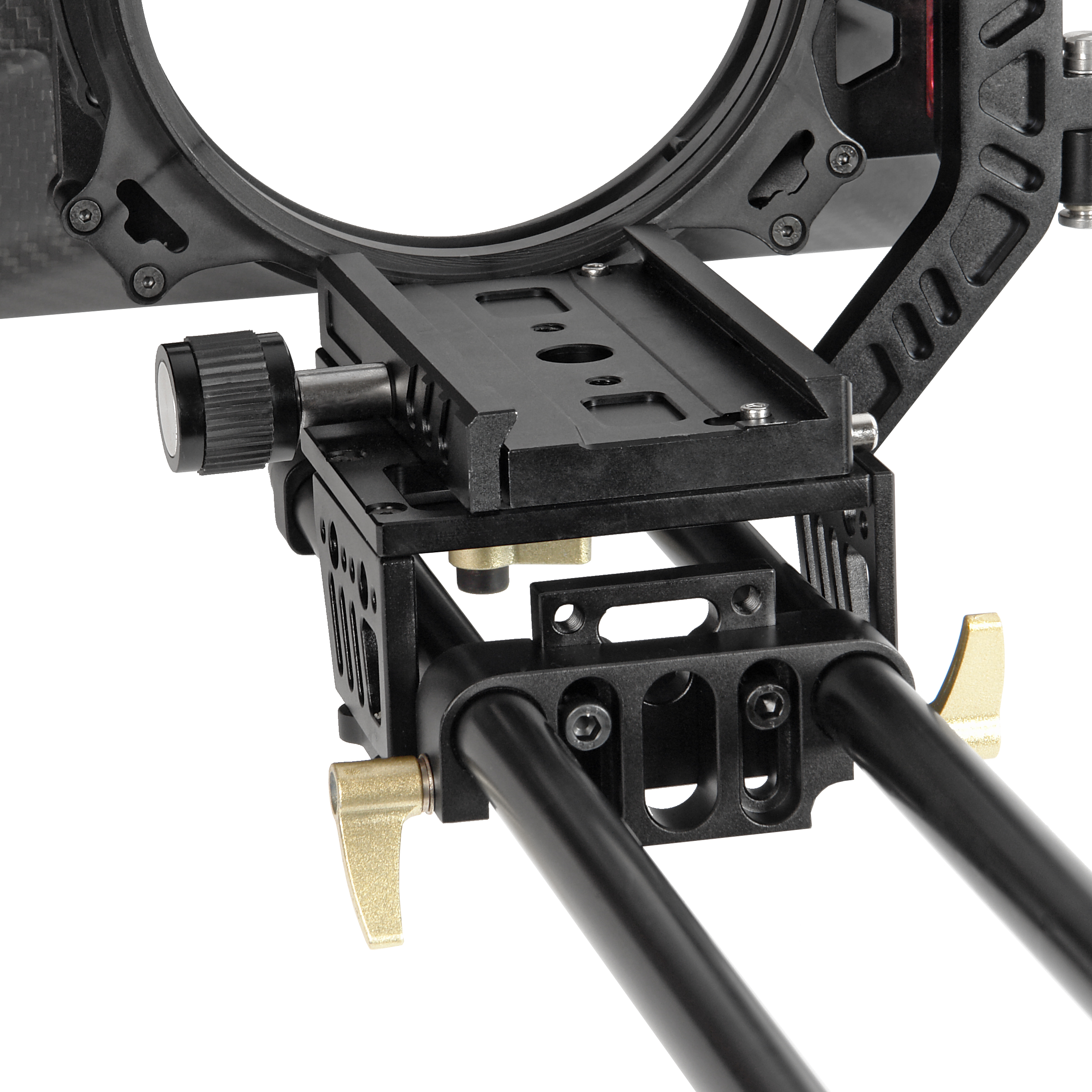 Установка камеры производится на базу (baseplate) с помощью быстросъёмной площадки. База может передвигаться вдоль суппортов и фиксироваться в выбранном положении на два винтовых фиксатора. Её также можно отрегулировать по высоте, для этого в комплекте предусмотрены шестигранные ключи. Быстросъёмная площадка Т-образной формы устанавливается в базу и фиксируется на винтовой фиксатор. Для предотвращения её выпадения из базы предназначен подпружиненный предохранитель с кнопкой. Ход движения площадки по базе составляет — 10 см. Сверху на площадке находятся две противоскользящие накладки, а для крепления камеры можно выбрать винт 1/4″ или 3/8″.