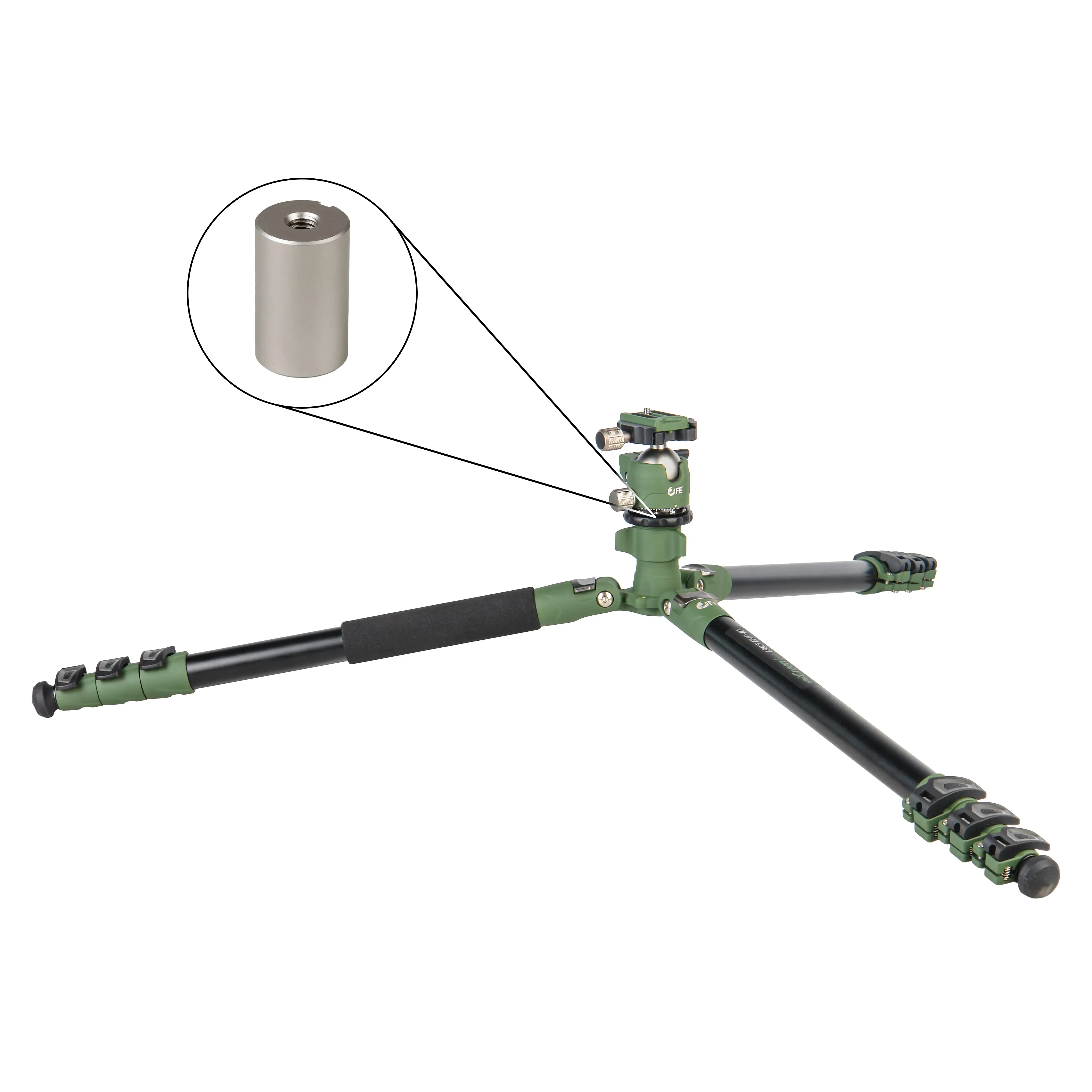 Для получения максимальной высоты монопода на съёмную ногу можно установить центральную колонну с шаровой головкой. Также возможен вариант с использованием входящей в комплект металлической вставки для монтажа головки с винтом непосредственно на ногу.