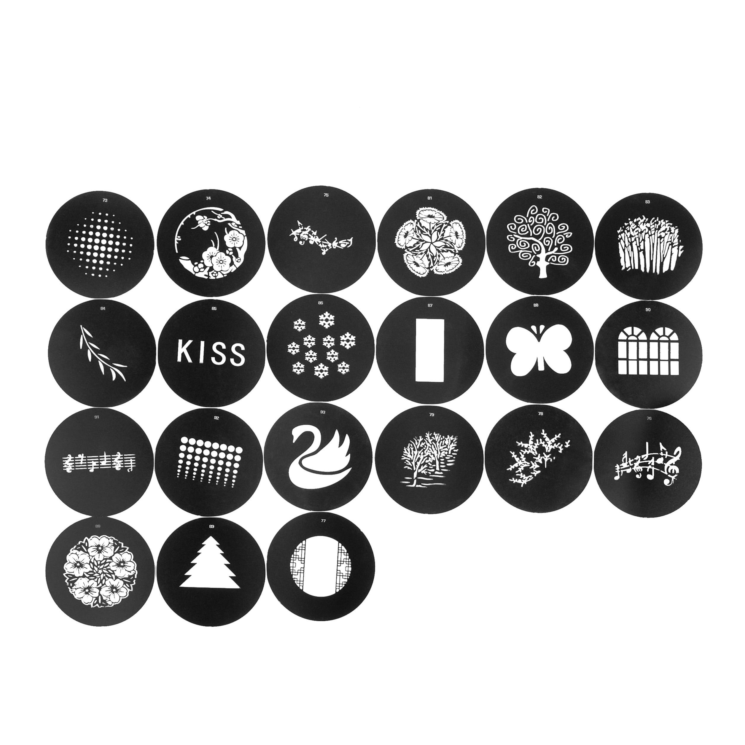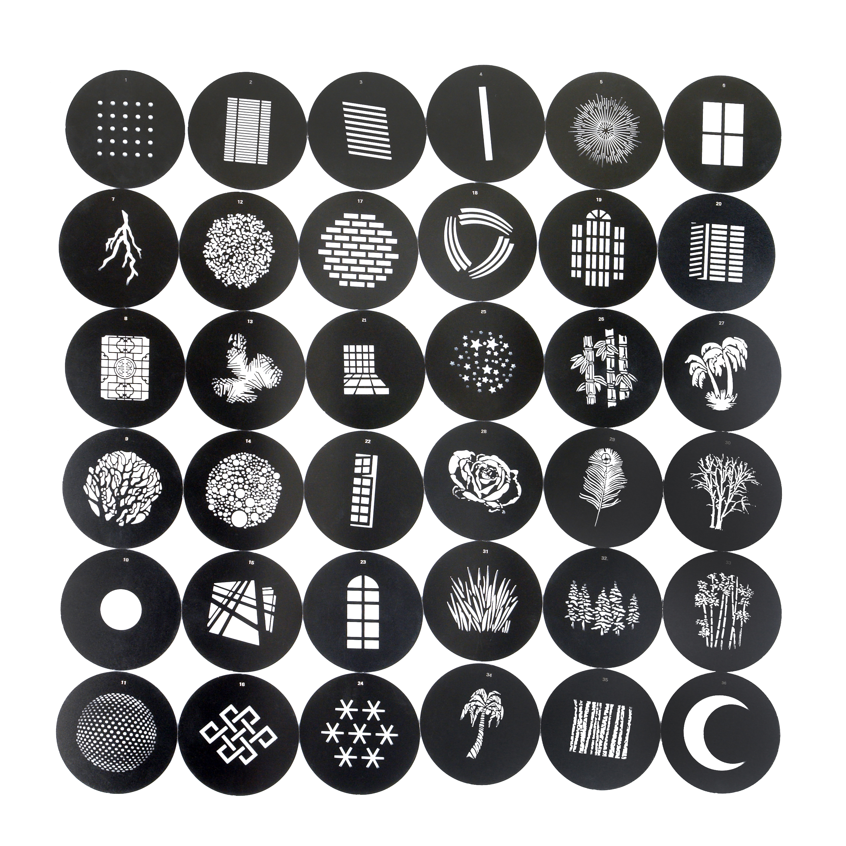 Маски ГОБО – модификаторы света, выполненные в виде пластины-трафарета Ø58 мм с перфорацией в виде различных рисунков: полос, точек, листьев, веток и др. Частично ограничивая световой поток от студийной вспышки или осветителя, маски формируют световой рисунок для создания творческих эффектов в фотографии или видеосъемке.