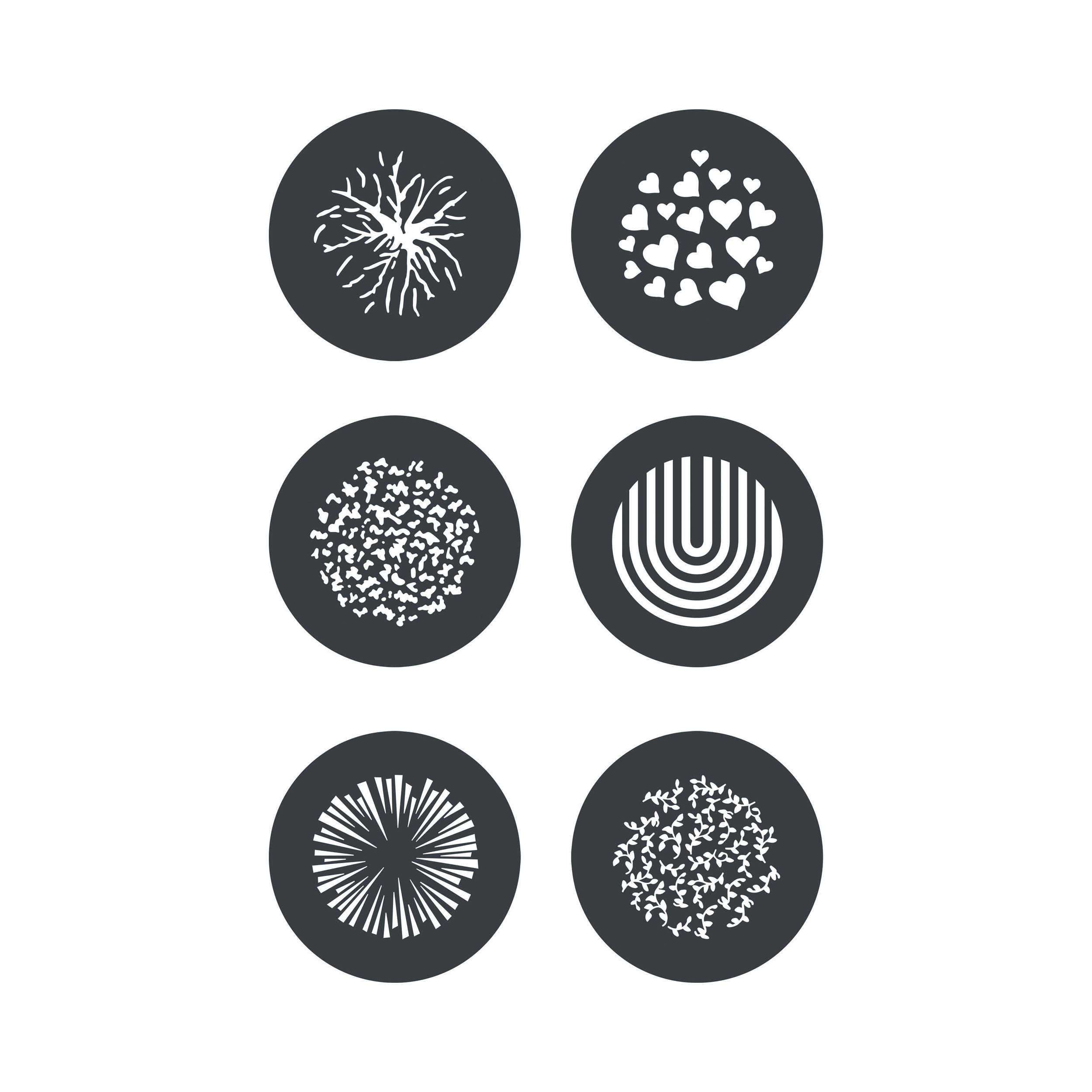 Godox Knowled GP-GS2 – набор из 6 износостойких металлических масок GOBO диаметром 148 мм для формирования светотеневого рисунка на фоне или объекте съемки.