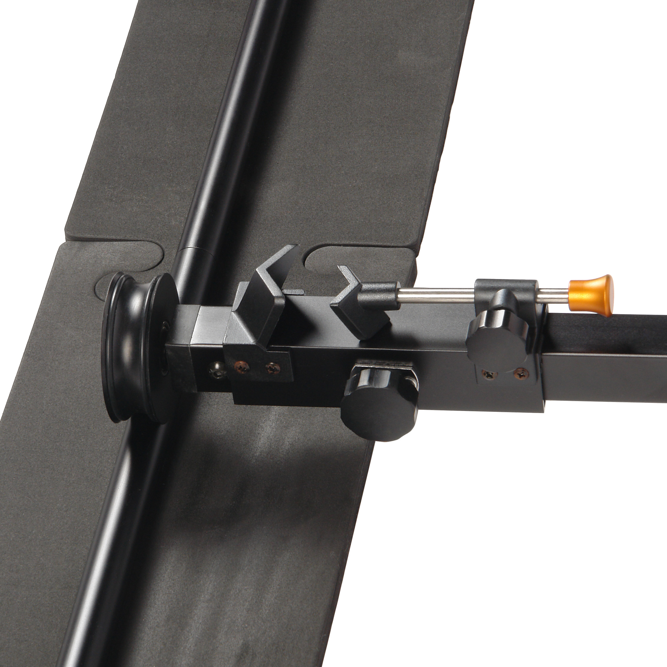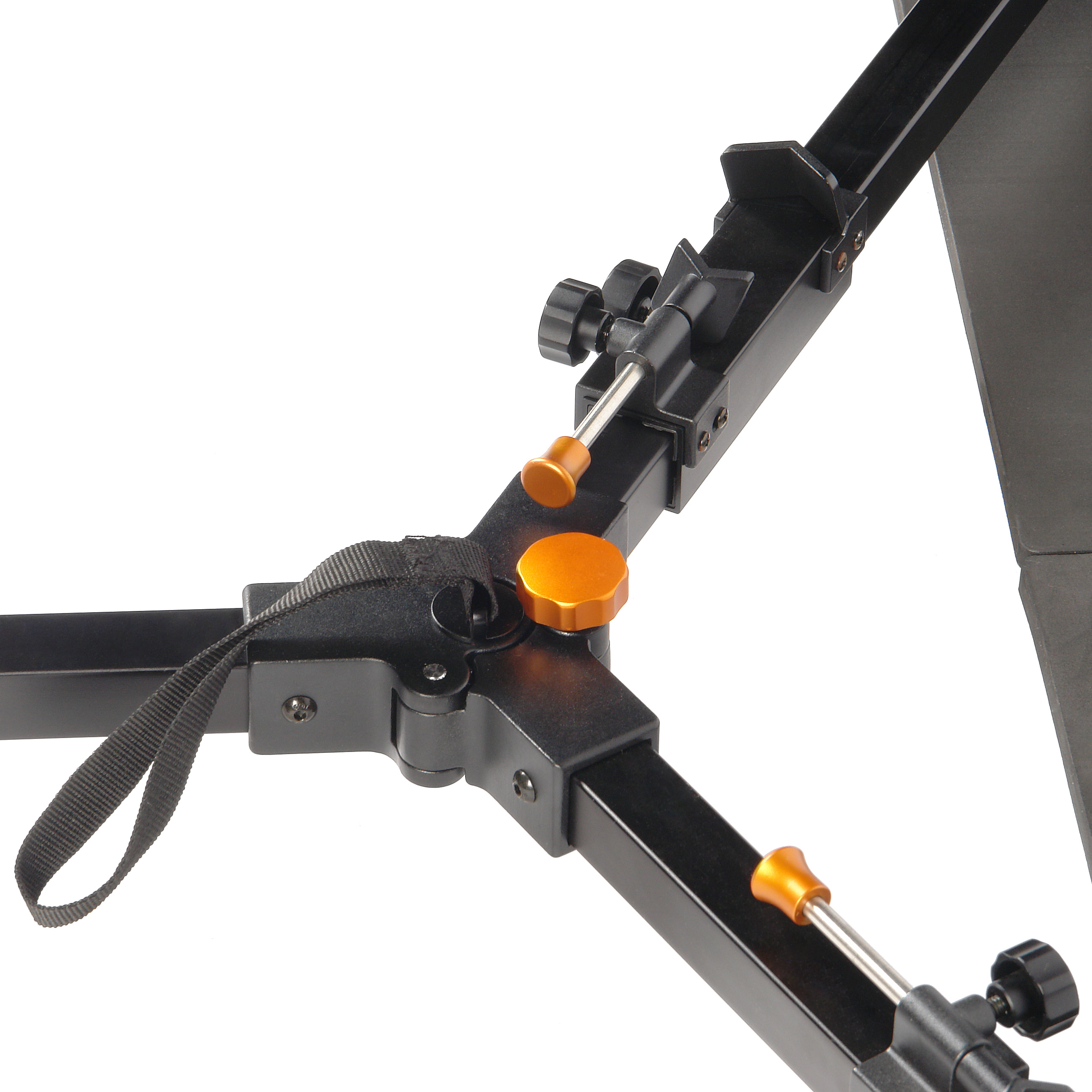 Тележка выполнена из металлического квадратного профиля 25х25 мм и подходит для штативных треног большого веса. Система совместима с большинством профессиональных видеоштативов. Ножки штатива закрепляются непосредственно на тележке или вставляются шипами в комплектные резиновые подпятники и фиксируются на тележке струбцинами.