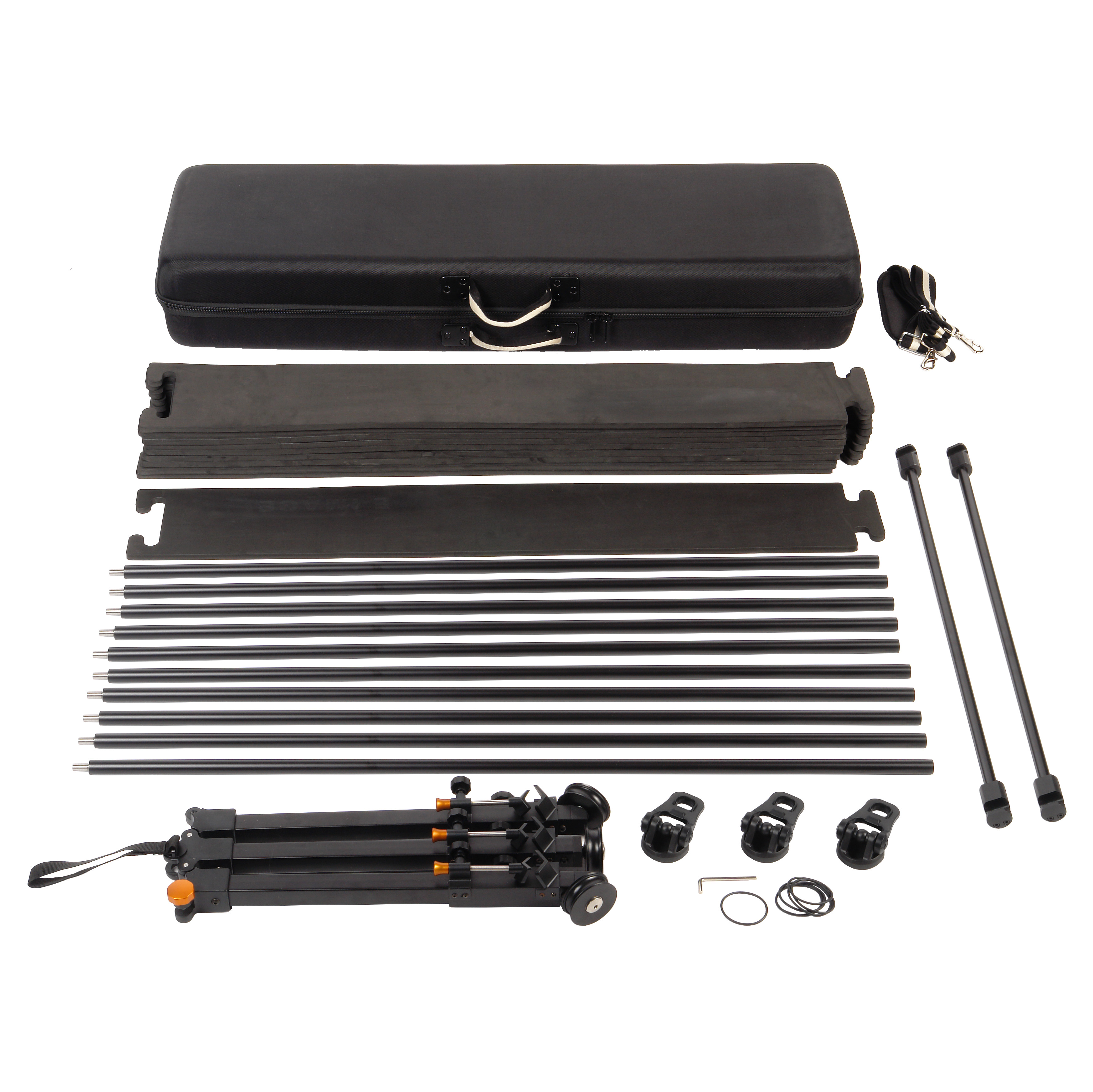 Для удобства хранения и транспортировки в комплект входит прочный кейс с жесткими стенками, двумя ручками для транспортировки и наплечным ремнем. В небольшой кейс 103х34х18 см полностью помещается весь комплект, вес которого вместе с кейсом не превышает 11.4 кг.