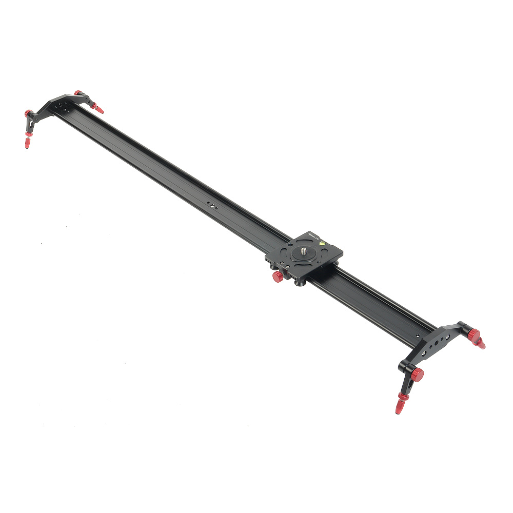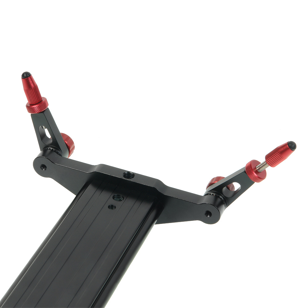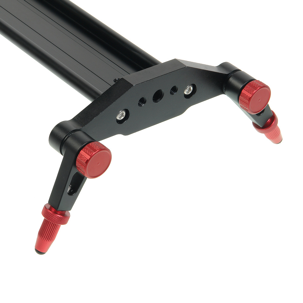 Поворотные ножки оборудованы подпружиненными зажимами с зубчатым соединением, благодаря этому слайдер выдерживает большие нагрузки с гарантированной устойчивостью. Ножки раскладываются в пределах 360 градусов, позволяя хранить слайдер в футляре без снятия ножек. На концах ножек находятся выкручивающиеся нескользящие резиновые наконечники, которые обеспечивают точное выравнивание слайдера по уровню горизонта, а пузырьковый уровень на площадке поможет проверить настройку.