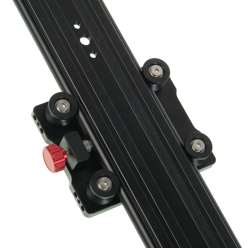 На каретке находится винт диаметром 3/8" и отверстия с резьбой диаметром 1/4" и 3/8" для установки вспомогательного оборудования. Сверху на каретке расположен пузырьковый уровень, который поможет выставить слайдер по горизонту. Винтовой фиксатор позволит зафиксировать каретку в определенном положении, а резиновые упоры на торцах каретки предотвратят жесткие удары в крайних положениях.