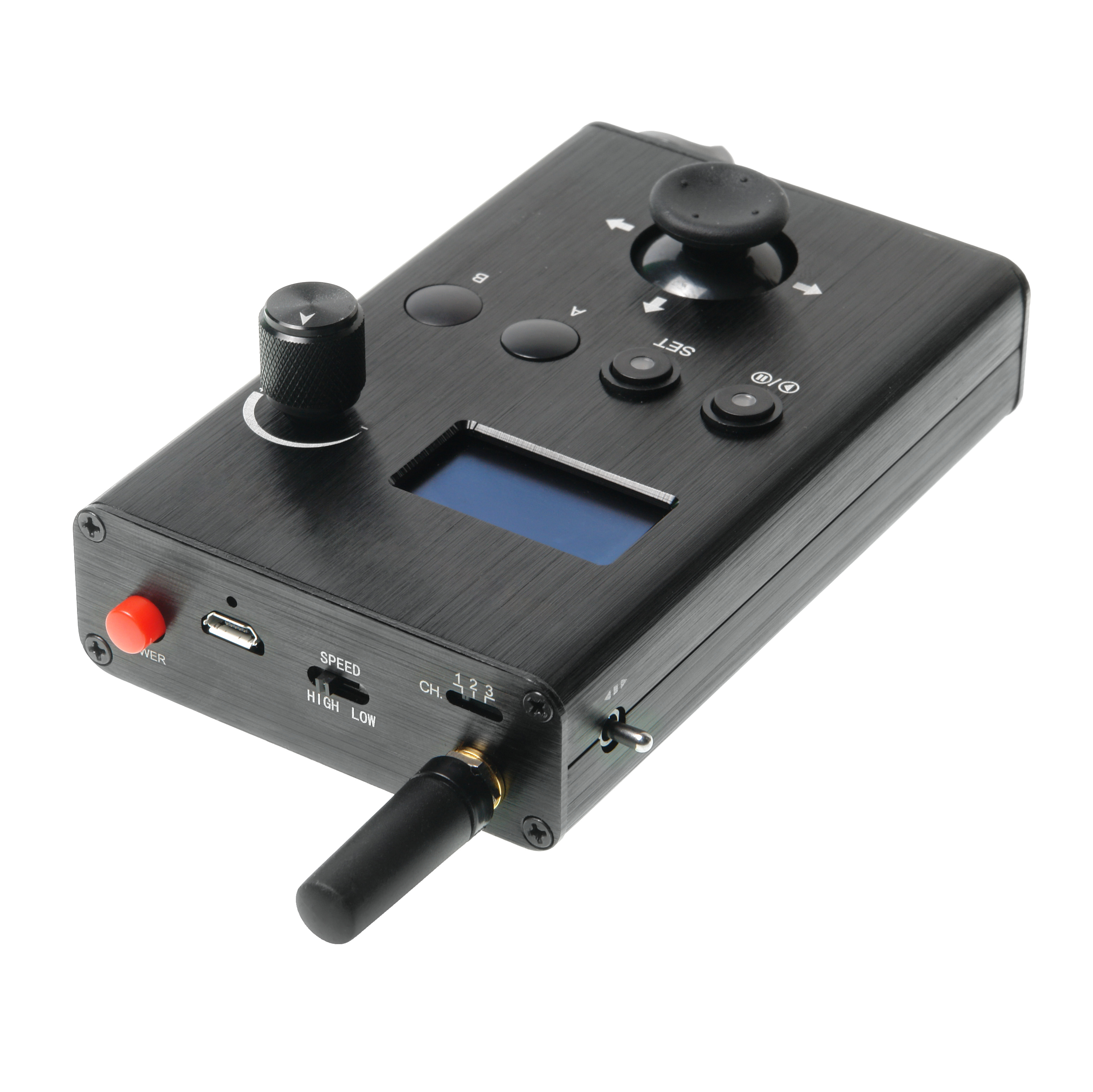 Регулировка скорости движения камеры и выбор режимов движения осуществляется с помощью пульта дистанционного управления с несущей радиочастотой 2,4 ГГц, на любом из трех имеющихся рабочих каналов. Пульт позволяет управлять движением как в ручном режиме с помощью джойстика, так и полностью автоматически в предварительно запрограммированном пользовательском режиме. Пульт имеет полностью металлическую конструкцию устойчивую к внешним воздействиям. Вся информация выводится на яркий OLED дисплей. Дисплей отражает следующую информацию: скорость движения, дистанция движения камеры, цикл движения, интервал, заряд аккумулятора. Возможности не ограничиваются видеосъемкой –