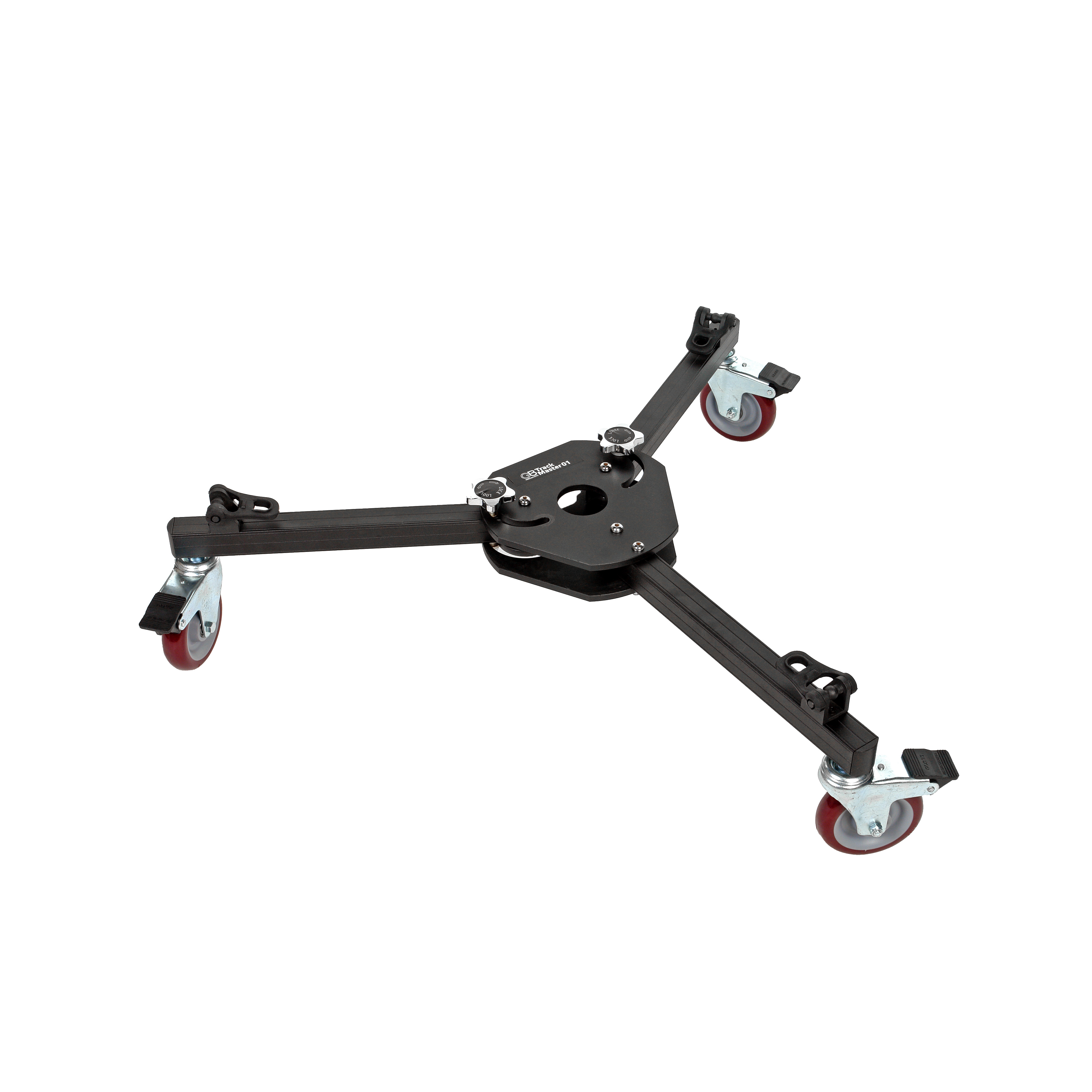 GreenBean TrackMaster 01 – складная операторская тележка профессионального исполнения, предназначена для установки крупных и тяжелых штативов и стоек, нагрузка на тележку составляет до 200 кг. Расстояние от середины основания до середины отверстия под шипы (радиус крепления для штатива) составляет 92 см.