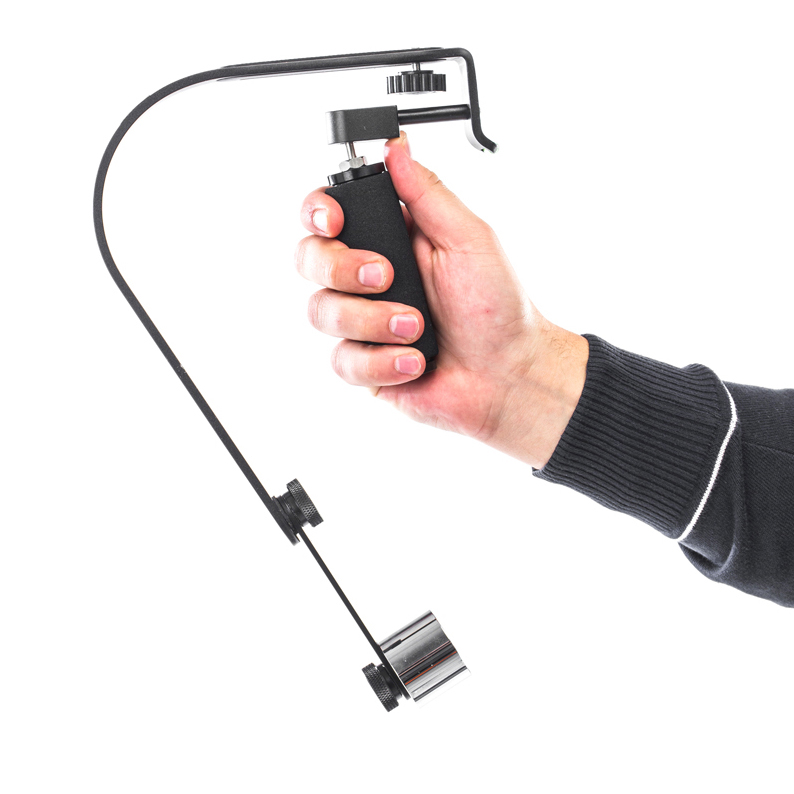 Стабилизатор STAB 100 предназначен для обеспечения мягкой и плавной съемки при работе с камерой на весу. Используется при съемке динамичных сцен в движении, подъеме по лестнице, слежении за объектом и т. д. Конструкция и малый вес STAB 100 обеспечивают комфортную работу оператора и не вызывают усталости при продолжительной съемке. Во время работы можно касаться камеры, это не отразится на результатах съемки праздника или свадьбы. С его помощью вы можете вести видеосъемку на iPhone или любой другой смартфон — просто закрепите его с помощью держателя на основание STAB 100.