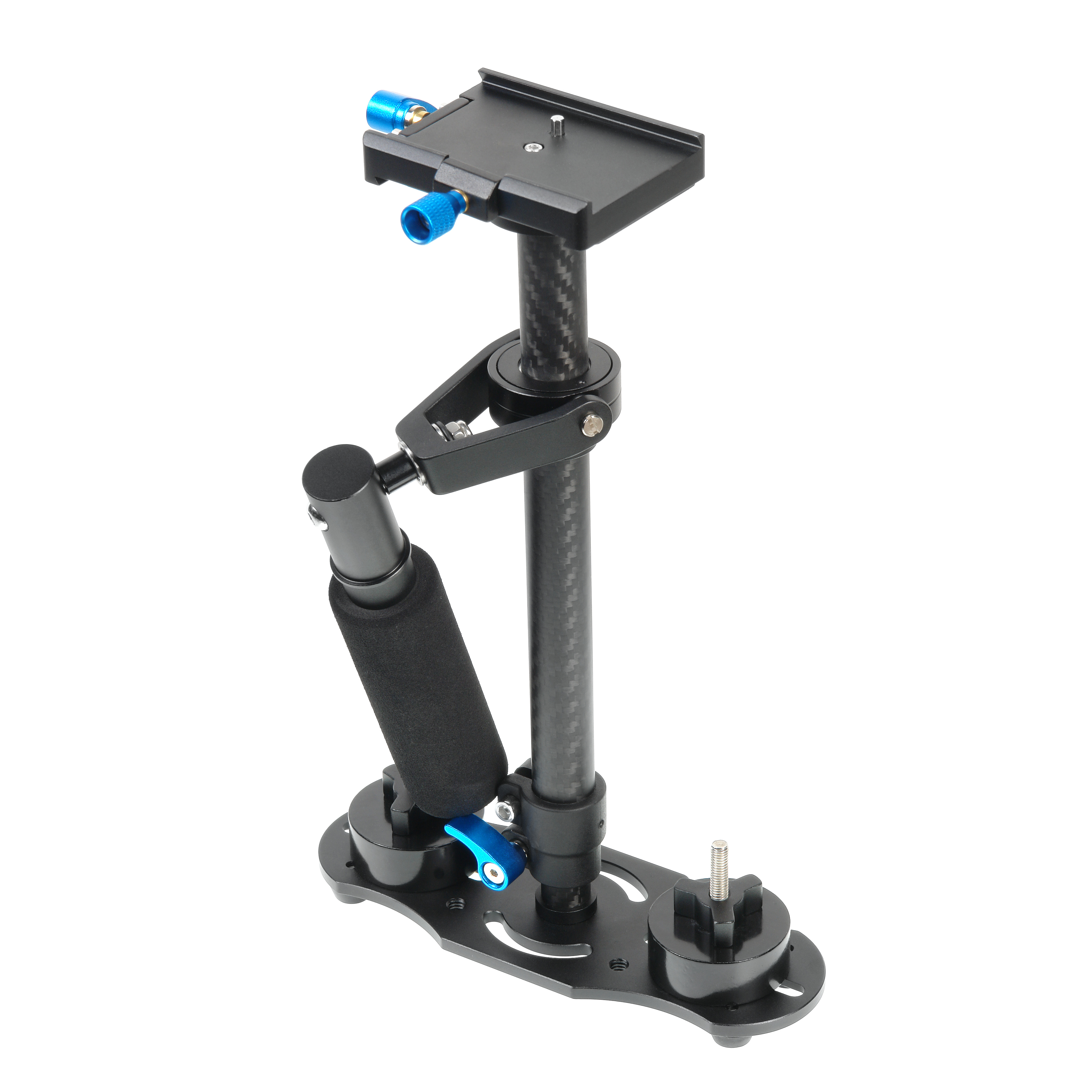 Конструкция стабилизатора на базе карданного шарнира компенсирует дрожания и смещения установленной камеры по трем осям. Камера крепится быстросъемной площадке с винтом 1/4 " или 3/8". Надежны механизм фиксации быстросъемной площадки и стопорный винт предотвратят случайное выпадение камеры. Шкала продольных смещений, нанесенная на быстросъемную площадку, поможет настроить и в дальнейшем применять положение динамического баланса для различных камер. Для компенсации заваливания вбок используется микровинт под основанием площадки.