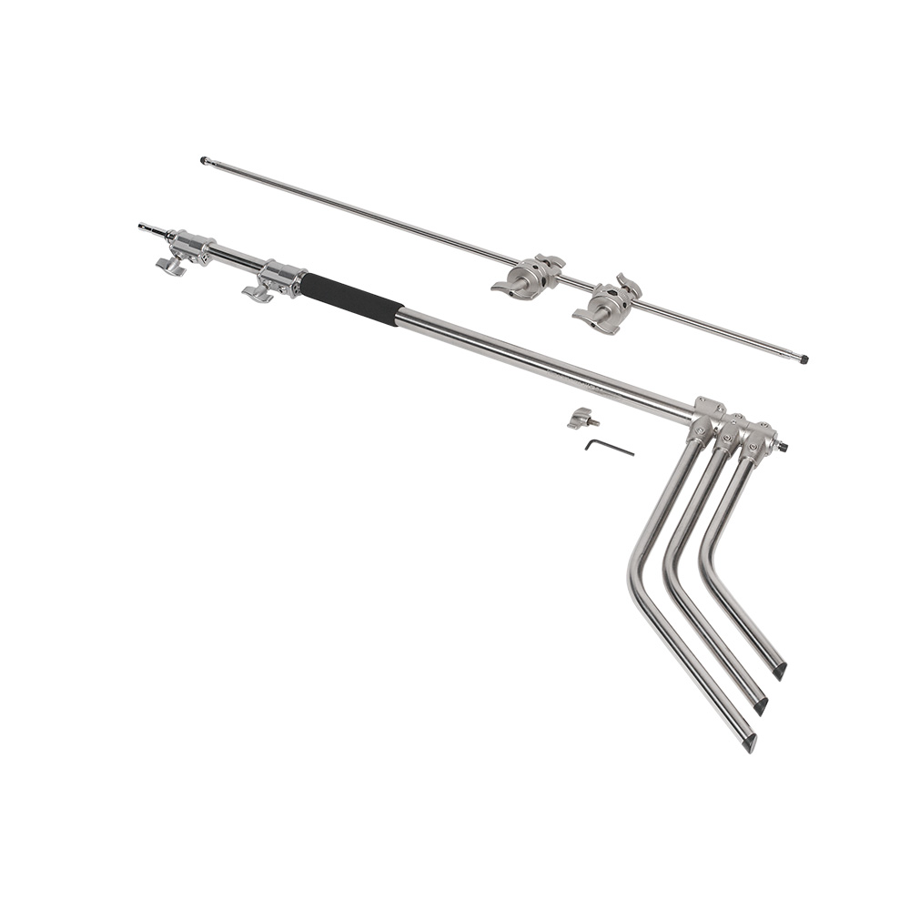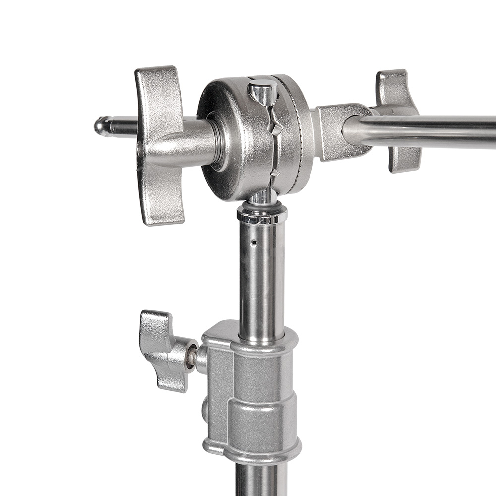 Секции стойки оборудованы пружинными амортизаторами. Диаметр секций стойки - 35, 30, 25 мм. Верхняя секция снабжена пальцем диаметром 5/8“, на который, с помощью комплектной муфты, можно установить перекладину(экстеншн) или другое оборудование весом до 10 кг. Стойки серии C-Stand хоть и являются максимально устойчивыми, тем не менее рекомендуется утяжелять их основания с помощью дополнительных грузов.