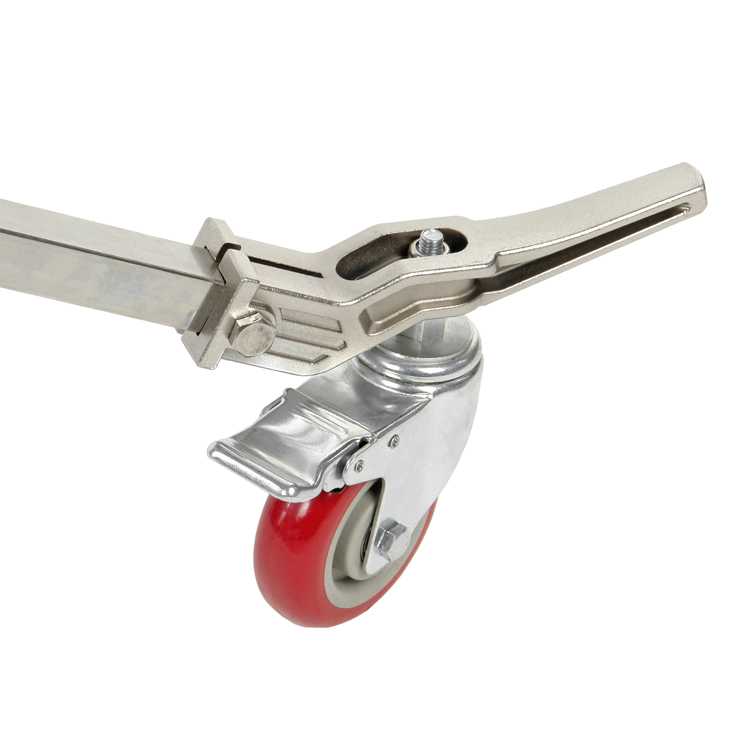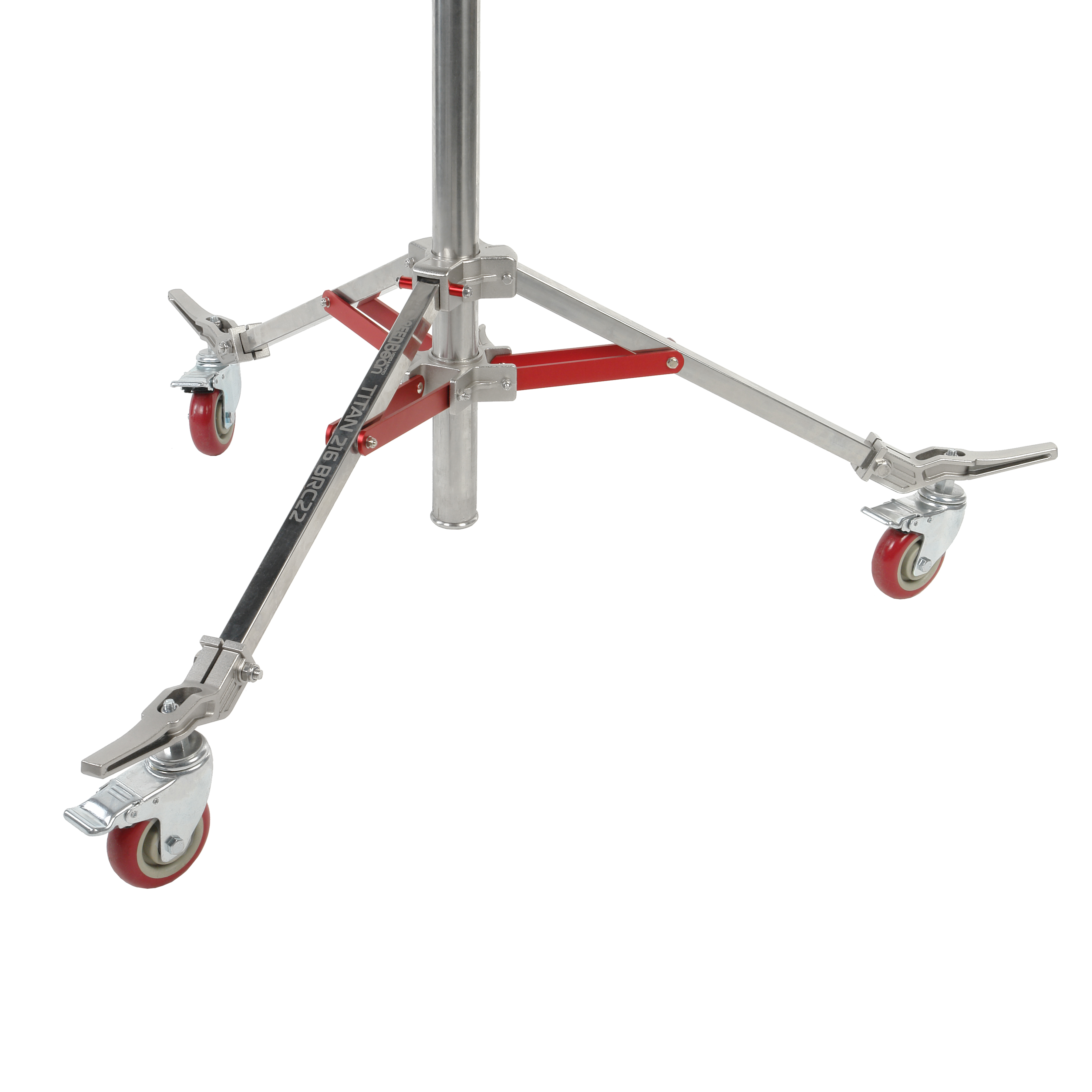 Для удобства перемещения тяжелой стойки по студии в комплект входят три колеса Ø100 мм с резиновым протектором и тормозным механизмом. Колеса с тормозом помогают легко сдвигать оборудование, установленное на стойку, а затем фиксировать его местоположение. Перед транспортировкой или длительным хранением стойки, колеса можно снять, а ножки сложить так, чтобы они занимали как можно меньше места.