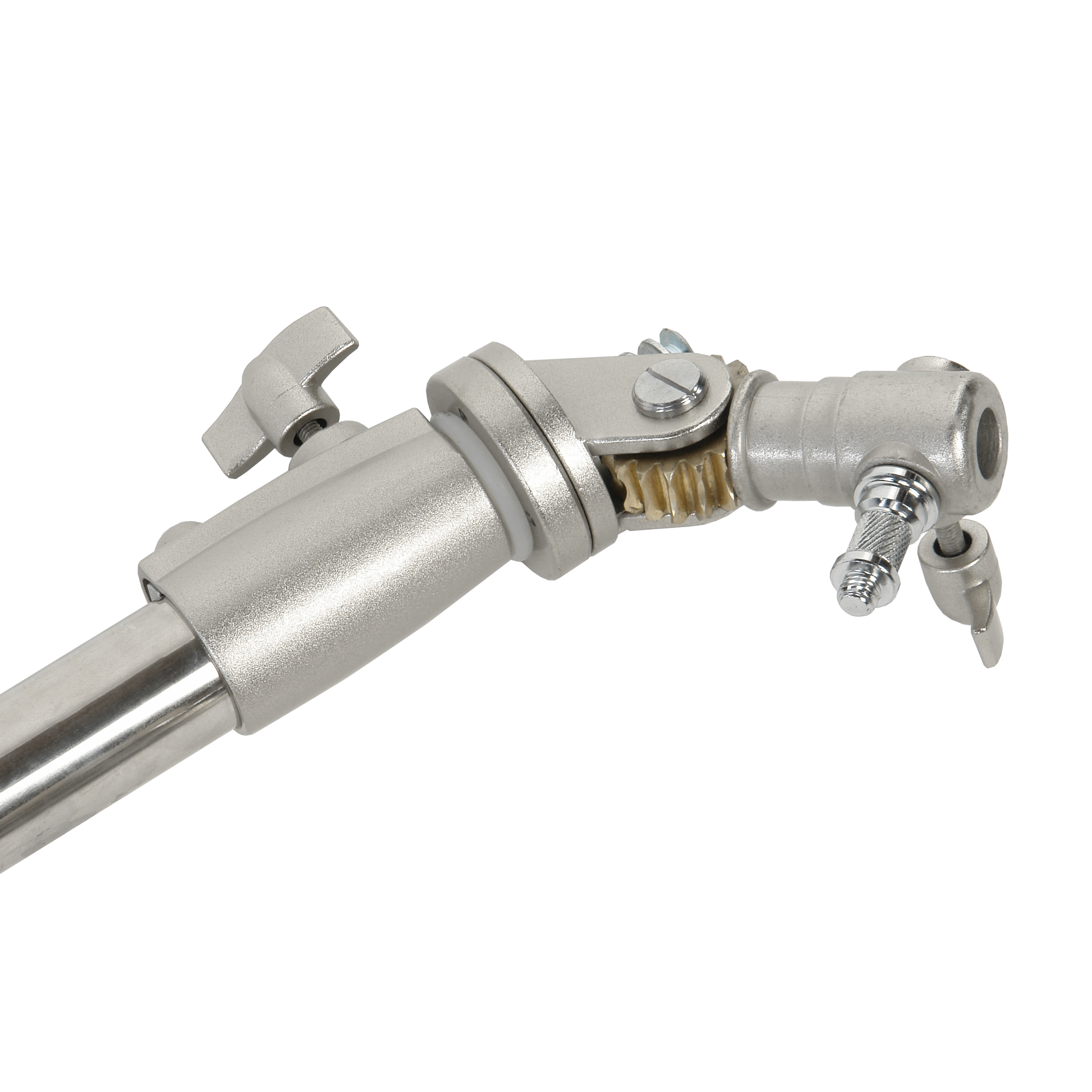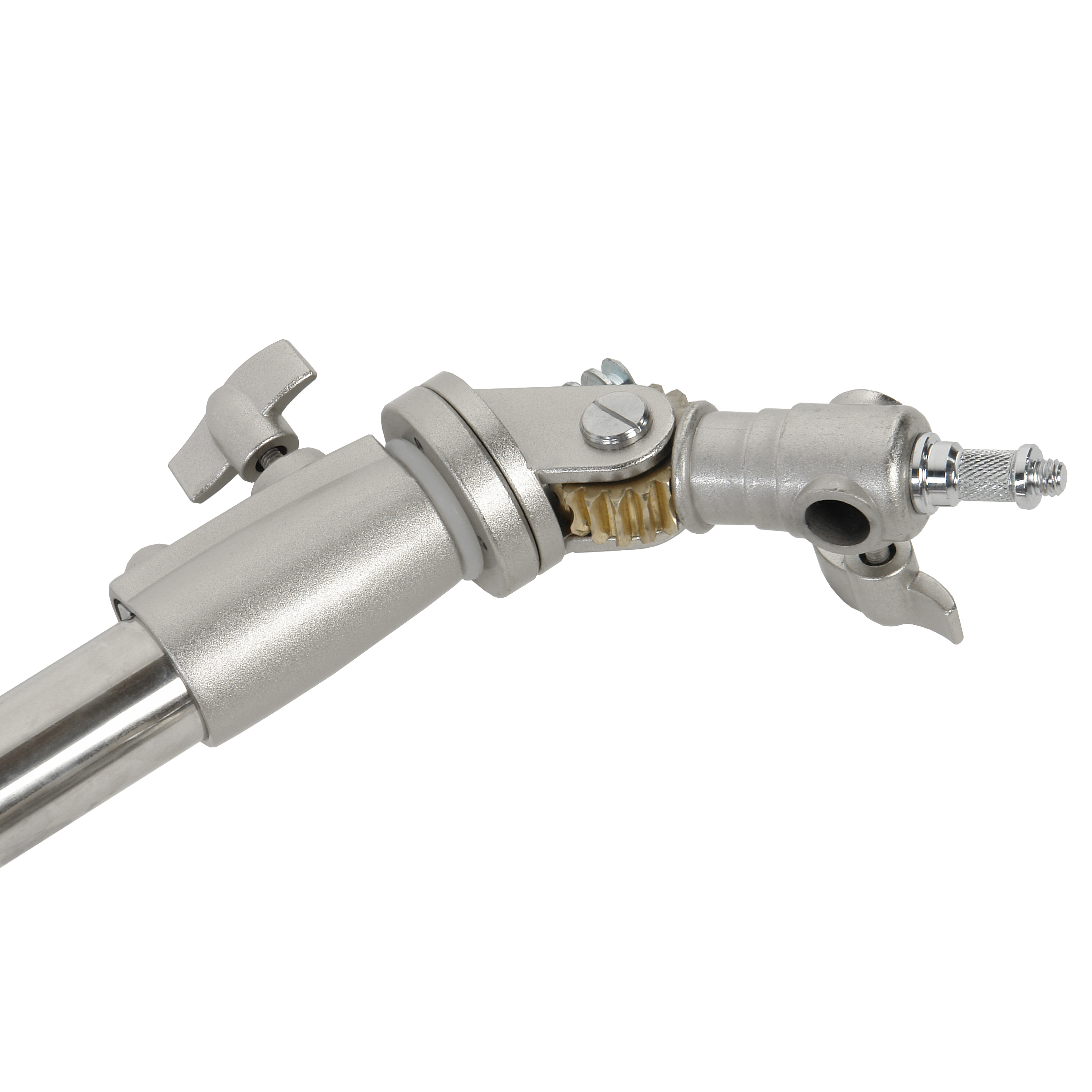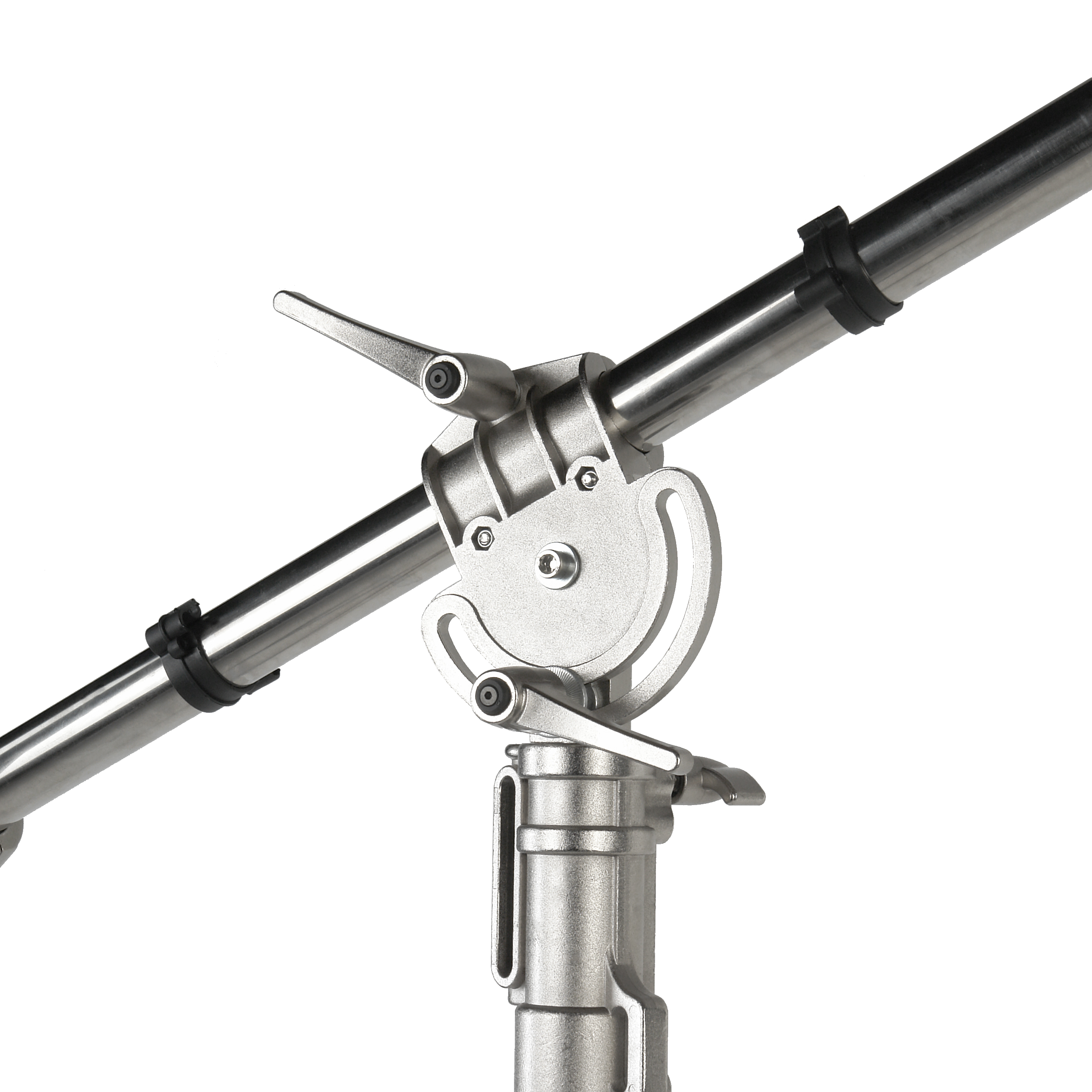Длина стальной телескопической перекладины составляет 140–250 см. Крепежный адаптер на конце перекладины – съемный стандартный шпигот 5/8" с винтовой резьбой 3/8'' и 1/4''. На перекладину можно установить источники постоянного света, светомодификаторы и дополнительные аксессуары с соответствующими креплениями.