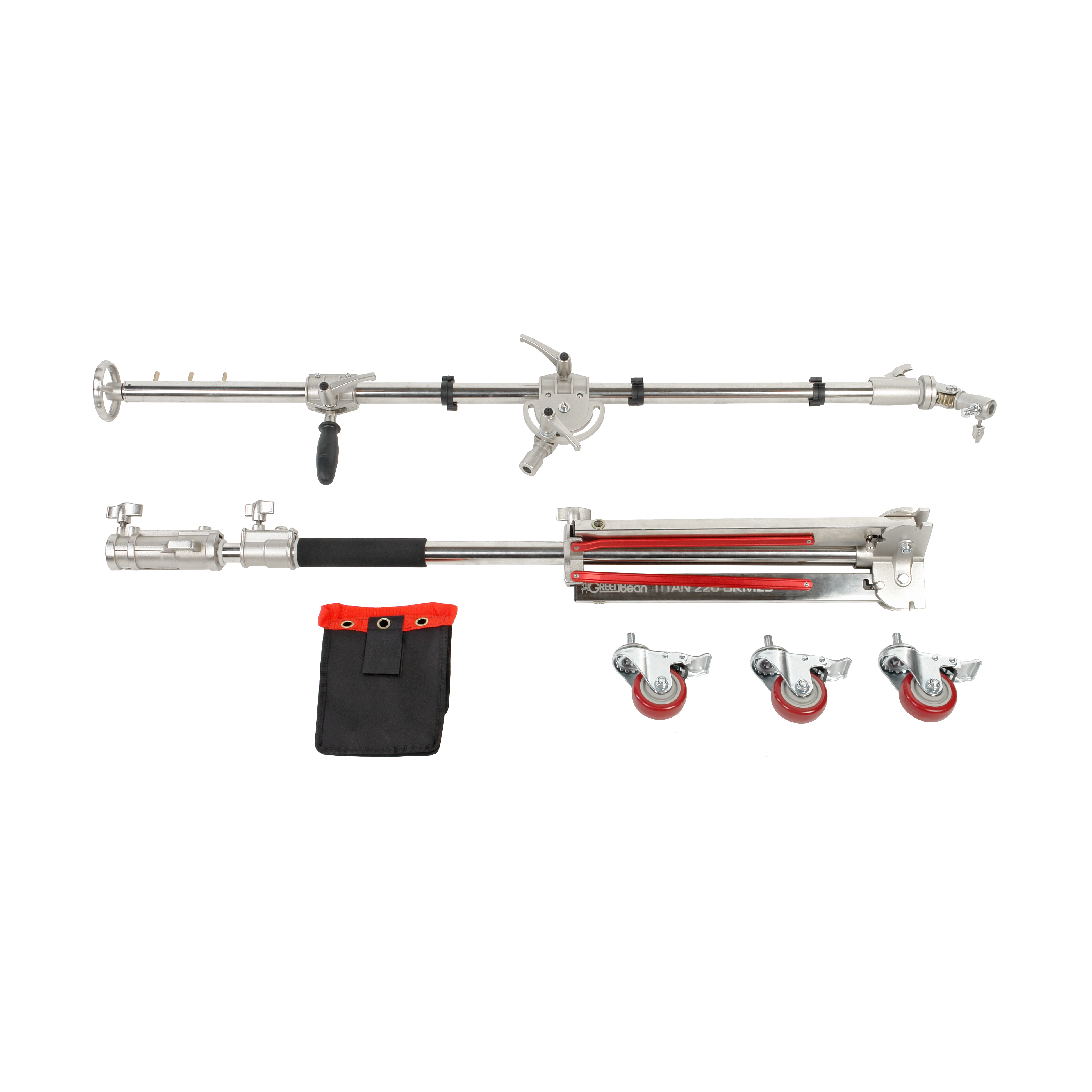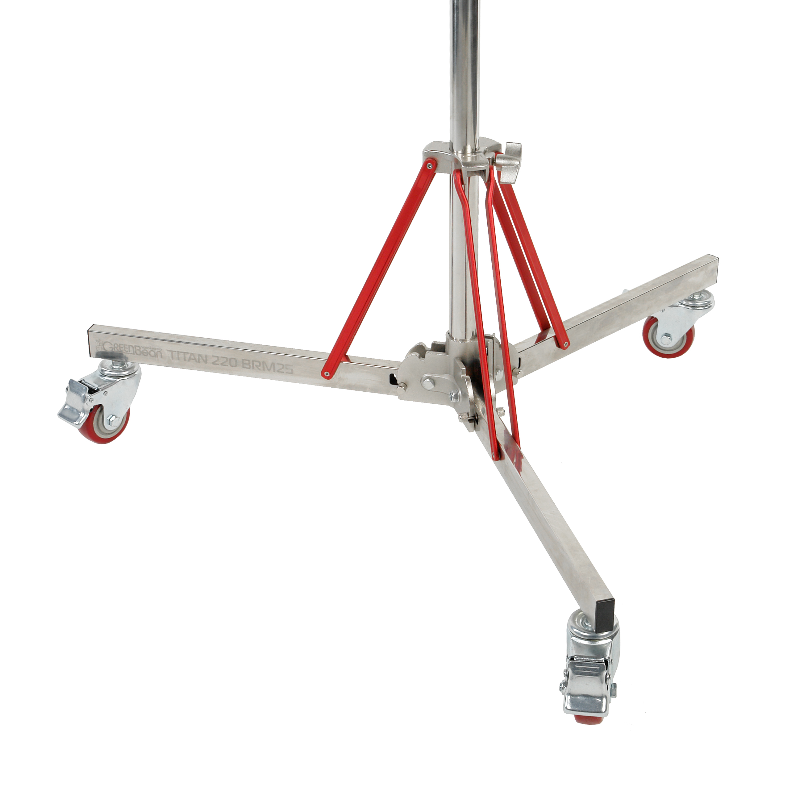 GreenBean Titan 220 BRM25 – стальная стойка на складной тележке с телескопической перекладиной (журавль), предназначена для установки тяжелого оборудования с креплением 5/8". Особенно удобна для размещения на большой высоте крупных осветительных приборов, так как механизм изменения наклона адаптера штанги позволяет установить и направлять (без демонтажа) осветитель на высоте до 4.2 метров.