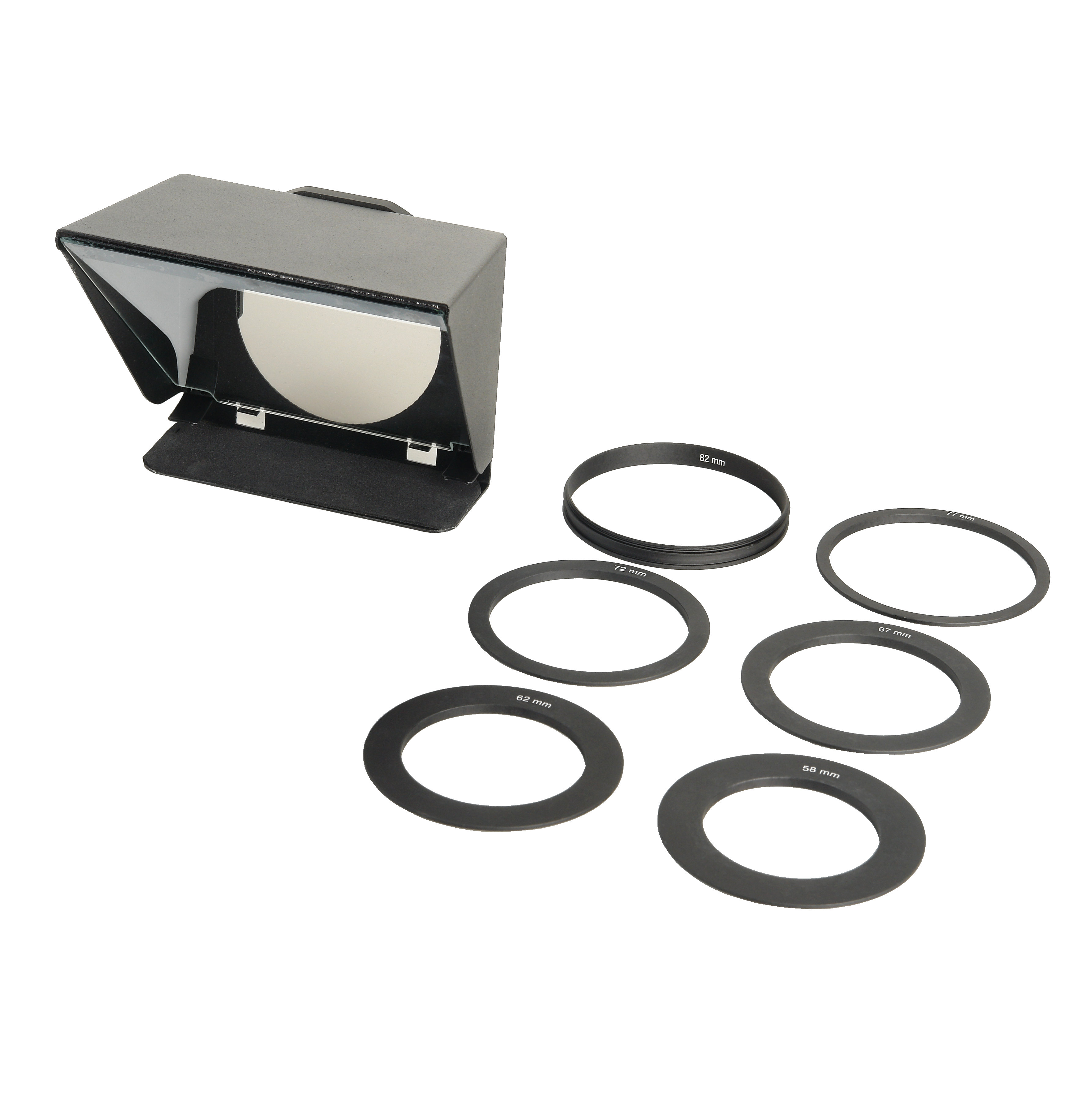 Телесуфлер устанавливается на цифровые DLSR камеры с объективами Ø58, 62, 67, 72, 77, 82мм (съемные переходные кольца в комплекте). Переходное кольцо накручивается на резьбу объектива и легко защелкивается на корпусе телесуфлера. Устройство устанавливается на фотоаппарат за считанные секунды и не нуждается в дополнительных инструментах.