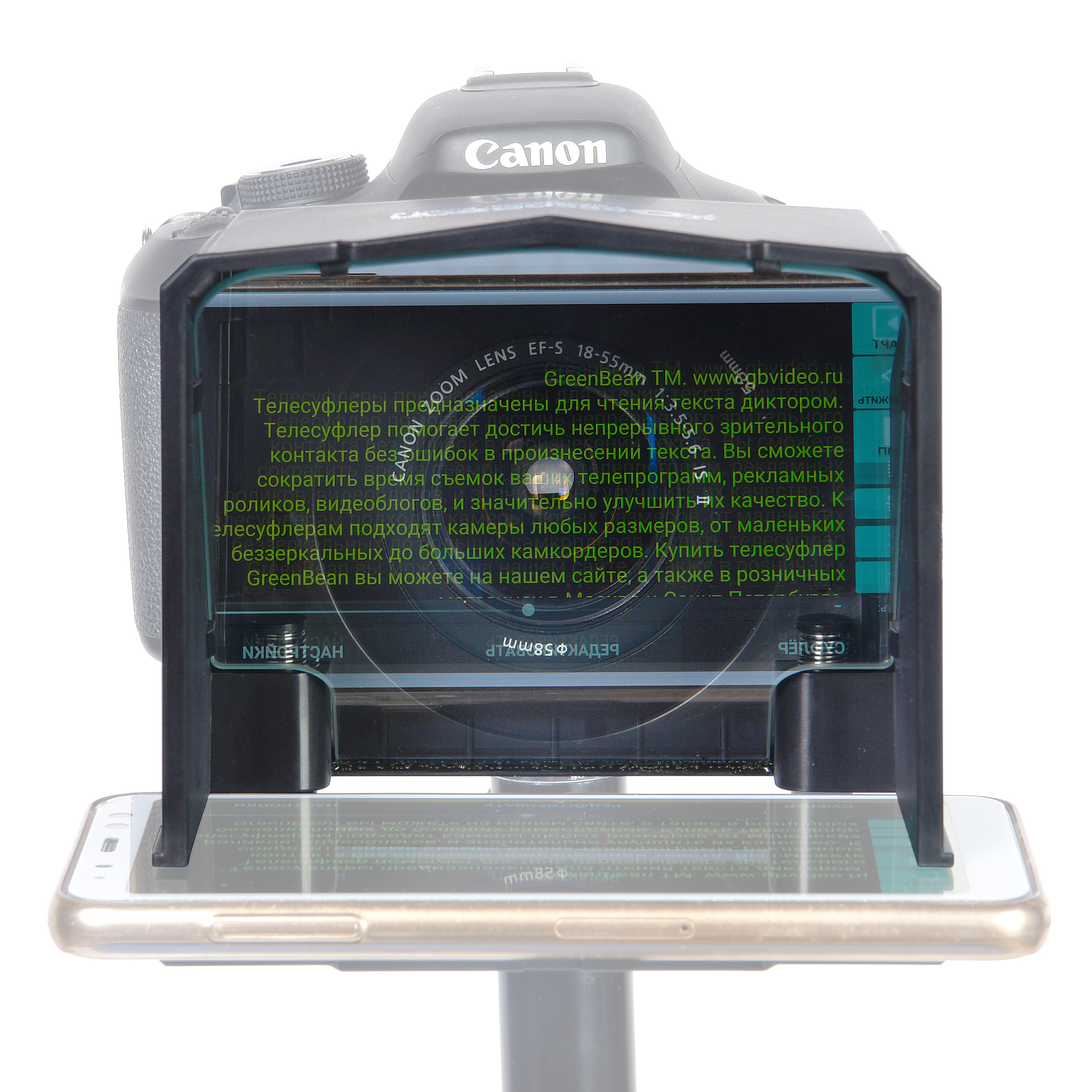 Телесуфлер GreenBean Teleprompter Smart 6 - устройство, представляющее собой пластиковый светозащитный короб с полупрозрачным стеклом внутри и слотом для смартфона. Телесуфлер устанавливается на объектив DSLR, беззеркальной или небольшой видео камеры с помощью соответствующего переходного кольца из прилагаемого комплекта. Текст, выведенный на экран смартфона, отображается на тонированном полупрозрачном стекле телесуфлера, установленного перед камерой внутри короба под определенным (около 45 град.) углом. Таким образом, взгляд диктора (блогера, актера или ведущего), читающего текст, направлен прямо в объектив камеры - у аудитории возникает «зрительное» впечатление прямого диалога с ведущим.