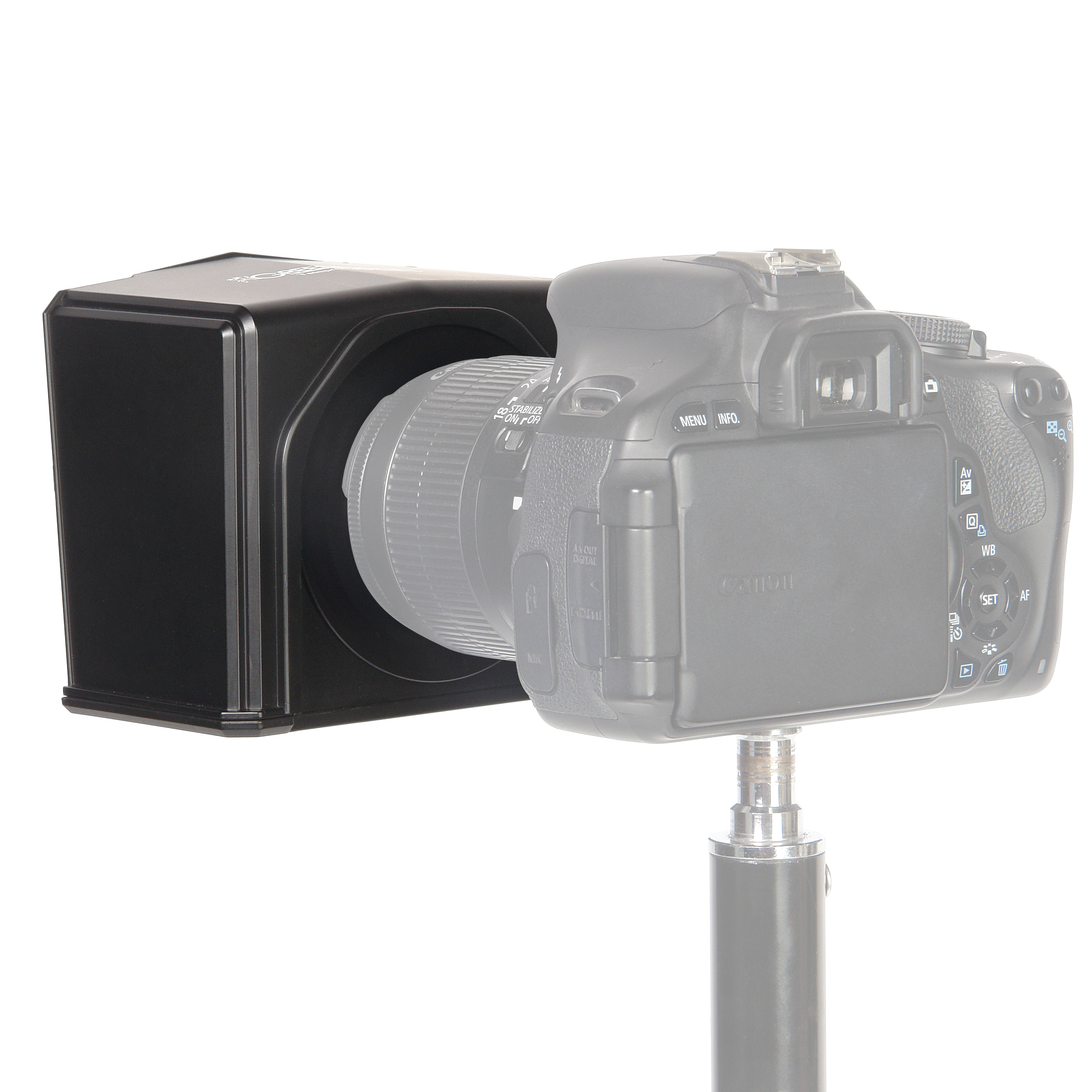 В нижней части корпуса телесуфлера предусмотрено резьбовое отверстие 1/4", позволяющее закрепить одновременно телесуфлер и фотоаппарат на штатив (через дополнительно приобретаемый кронштейн) - и необходимость крепить телесуфлер на объектив отпадет.