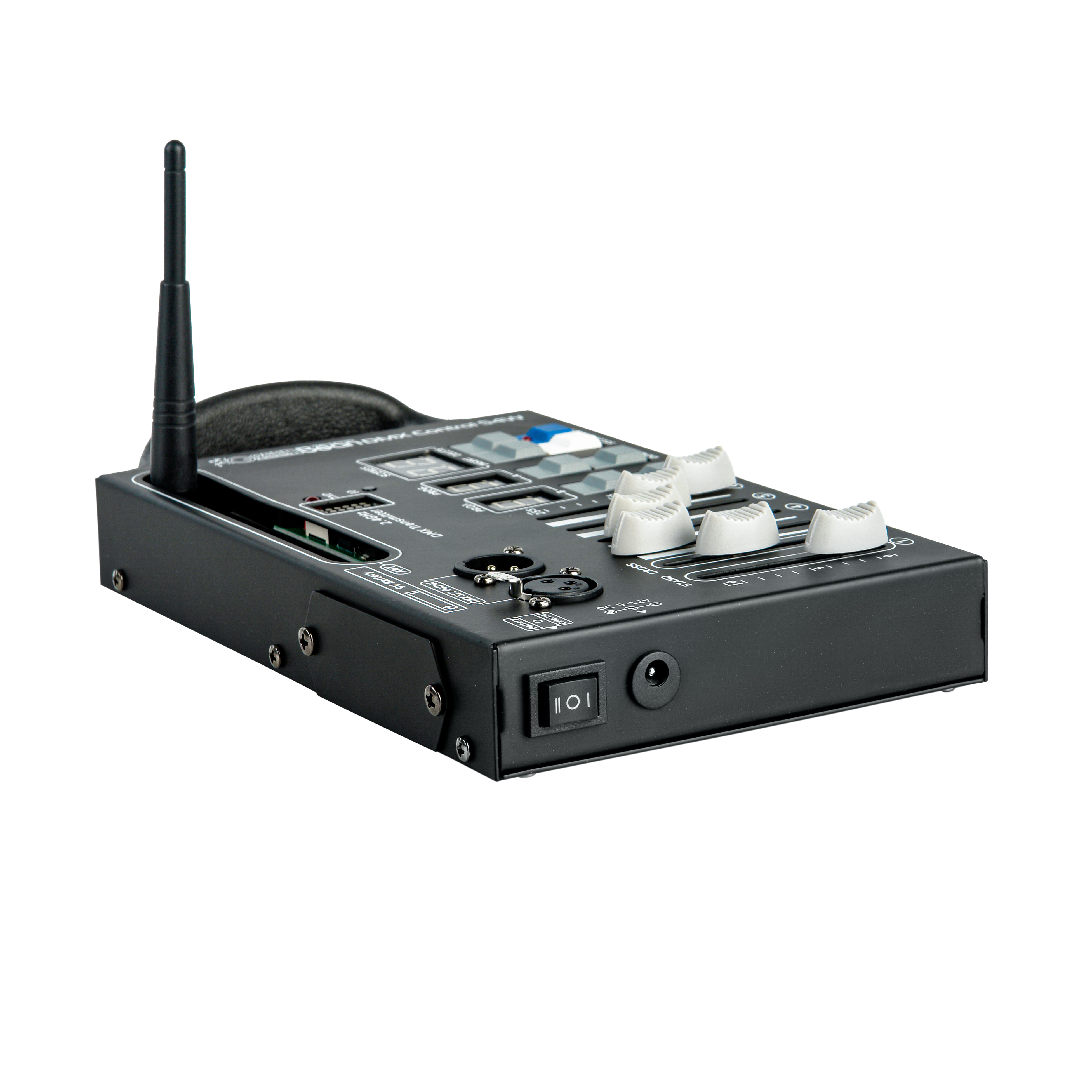 Дистанционную связь с оборудованием обеспечивает встроенный передатчик DMX Wireless 2.4 G ISM 126 с частотным диапазоном 2,4 ГГц. Для приема сигнала нужно установить на управляемые устройства приемопередатчики, например, AirDMX 512T.