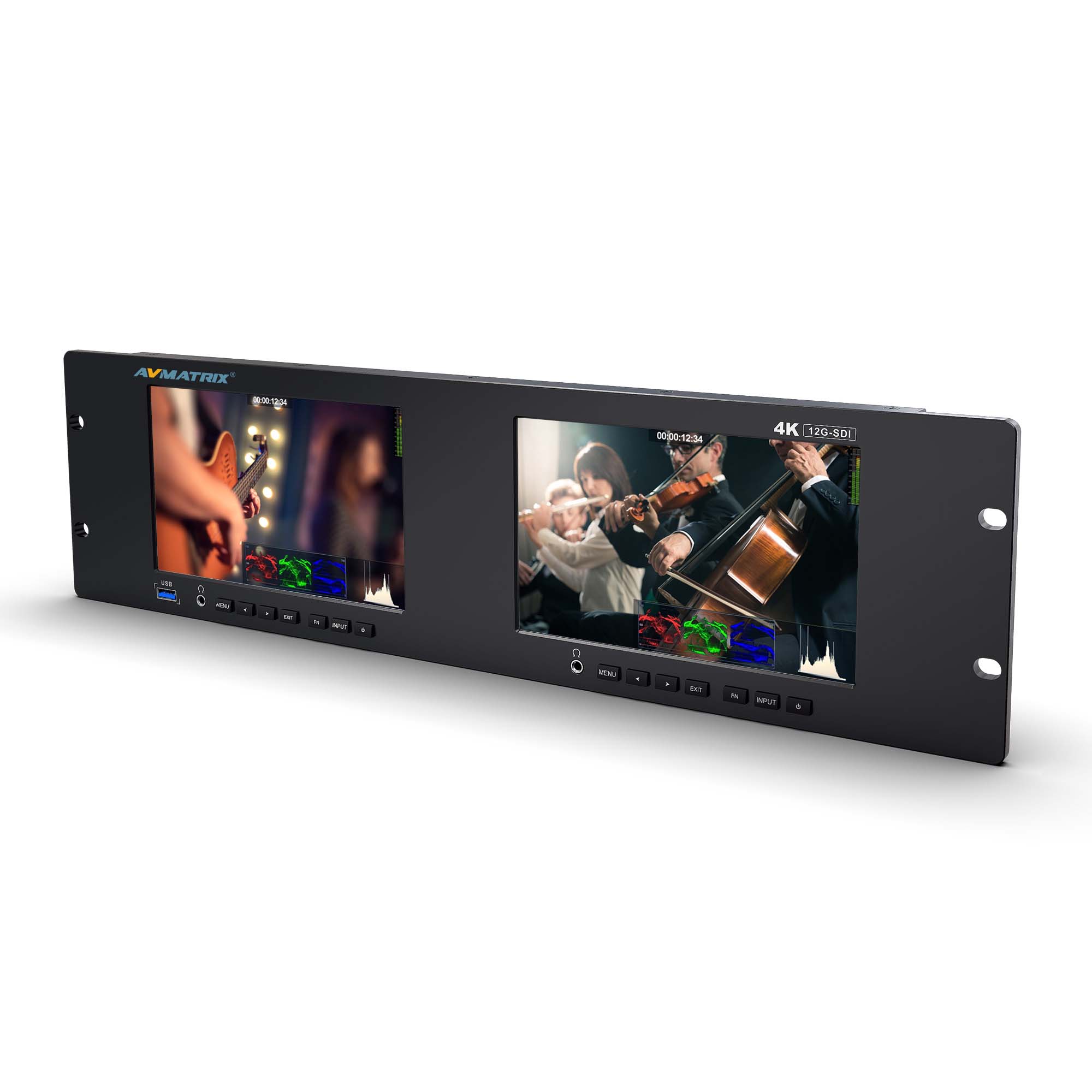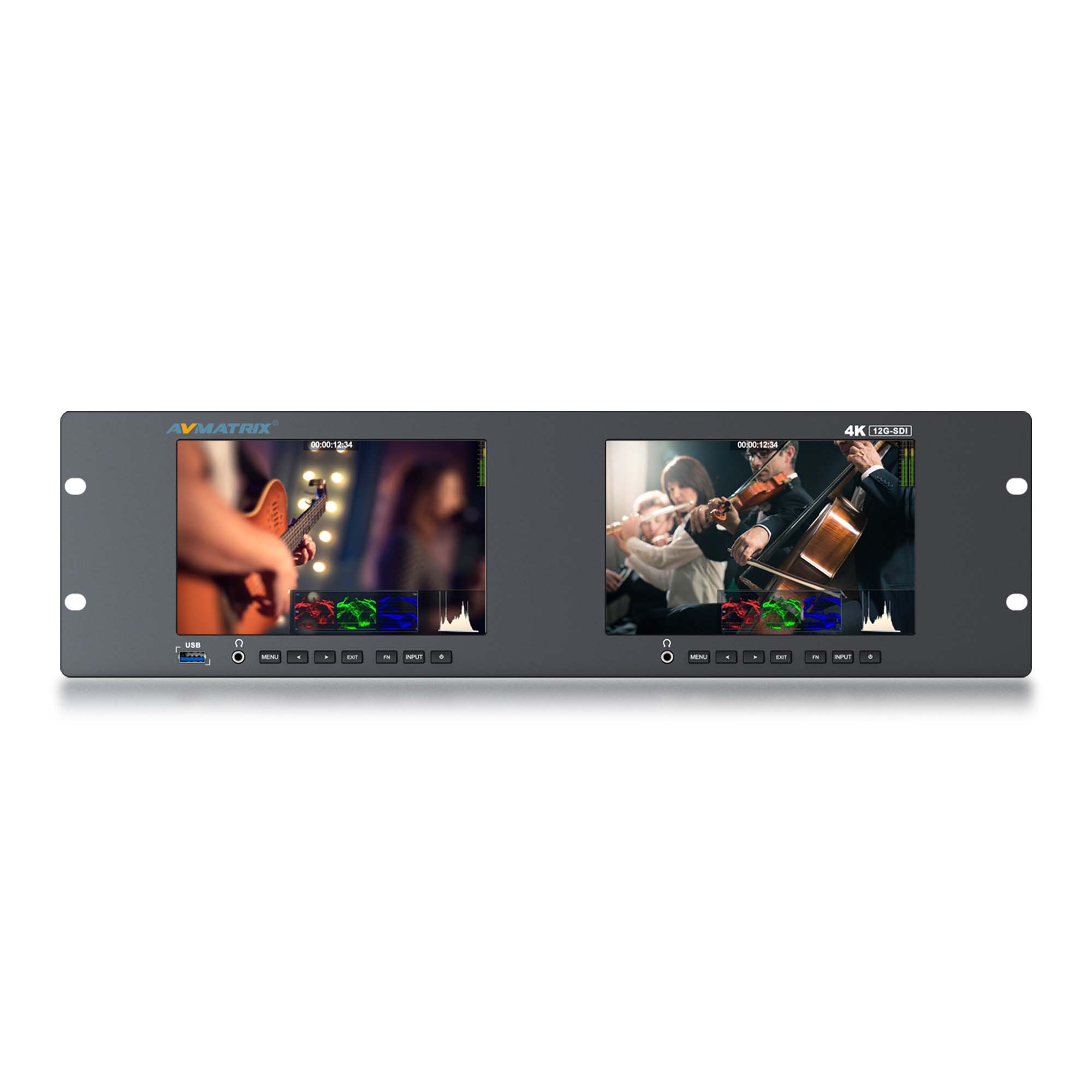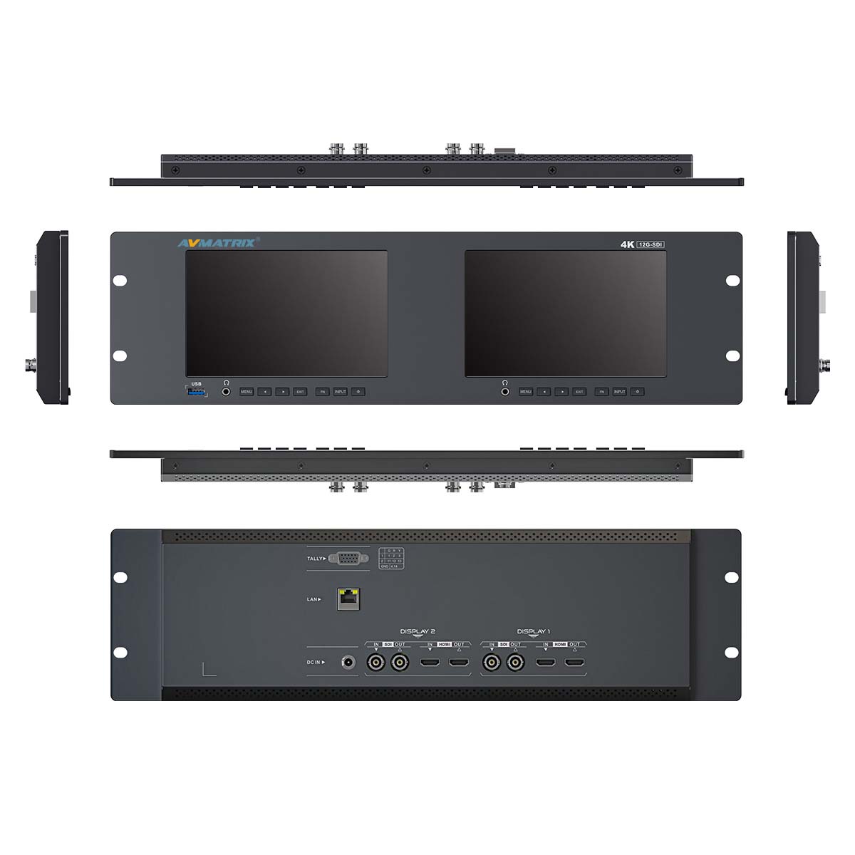 AVMATRIX RMM7026-12G — монитор 3RU для монтажа в стойку с двумя 7-дюймовыми экранами LTPS высокой яркости 1000 нит, который подходит для одновременного наблюдения двух камер. Монитор оснащен входами и выходами 12G-SDI и HDMI 2.0, которые поддерживают видео с разрешением до 2160p 60 Гц в форматах SDI и HDMI. Подключите сигнальные кабели к проходным выходам, чтобы расширить возможности отображения. Монитор поможет создать видеостену для мониторинга многих источников. Кроме того, все мониторы могут быть идеально настроены с помощью подключенного компьютера под управлением программного обеспечения.