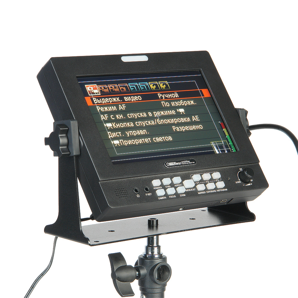 Tally-индикаторы, необходимые для взаимодействия оператора с режиссером и корреспондентом по ходу съемки, расположены на передней и задней панелях монитора.