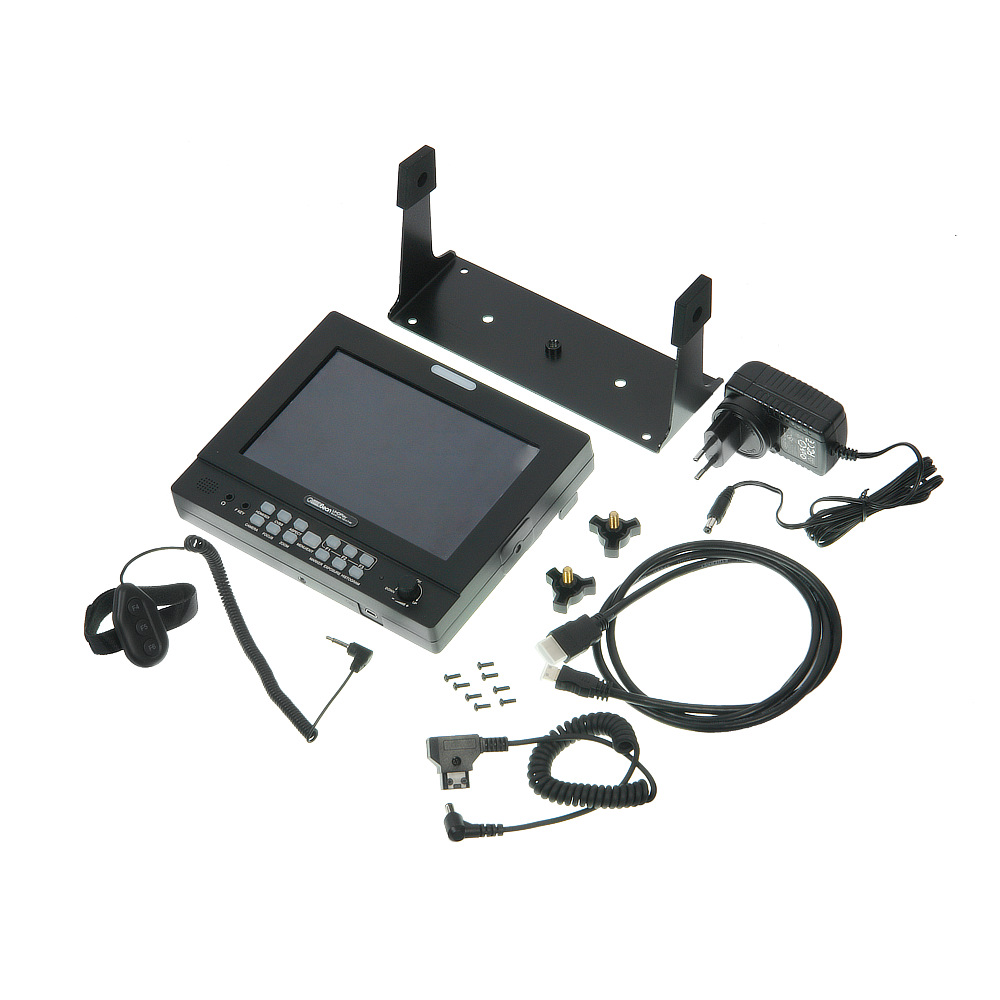 Стальной кронштейн позволяет надежно закрепить монитора и регулировать его наклон (поворот на 360°). Для установки монитора на нужной высоте не только на камеру, но и на риг, штатив, стойку или стабилизатор позволяют монтажные отверстия с резьбой 1/4” на каждой грани корпуса устройства. Для этого можно использовать держатели, кронштейны и головки из ассортимента GreenBean.