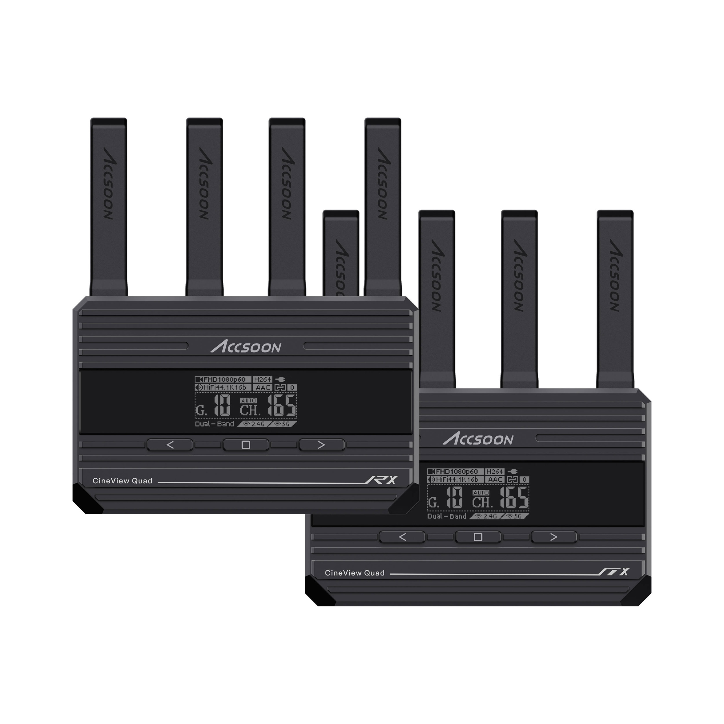 Accsoon CineView Quad — это комплект беспроводной системы передачи, состоящей из передатчика и приемника SDI и HDMI с уникальной конструкцией складных антенн. Accsoon CineView Quad может передавать HD-видео и HQ-аудио сразу на 4 разных устройства (приемник, мобильный телефон, планшет, ноутбук и т.д.) практически с нулевой задержкой с помощью запатентованной двухканальной технологии передачи Accsoon (2,4 ГГц + 5 ГГц).
