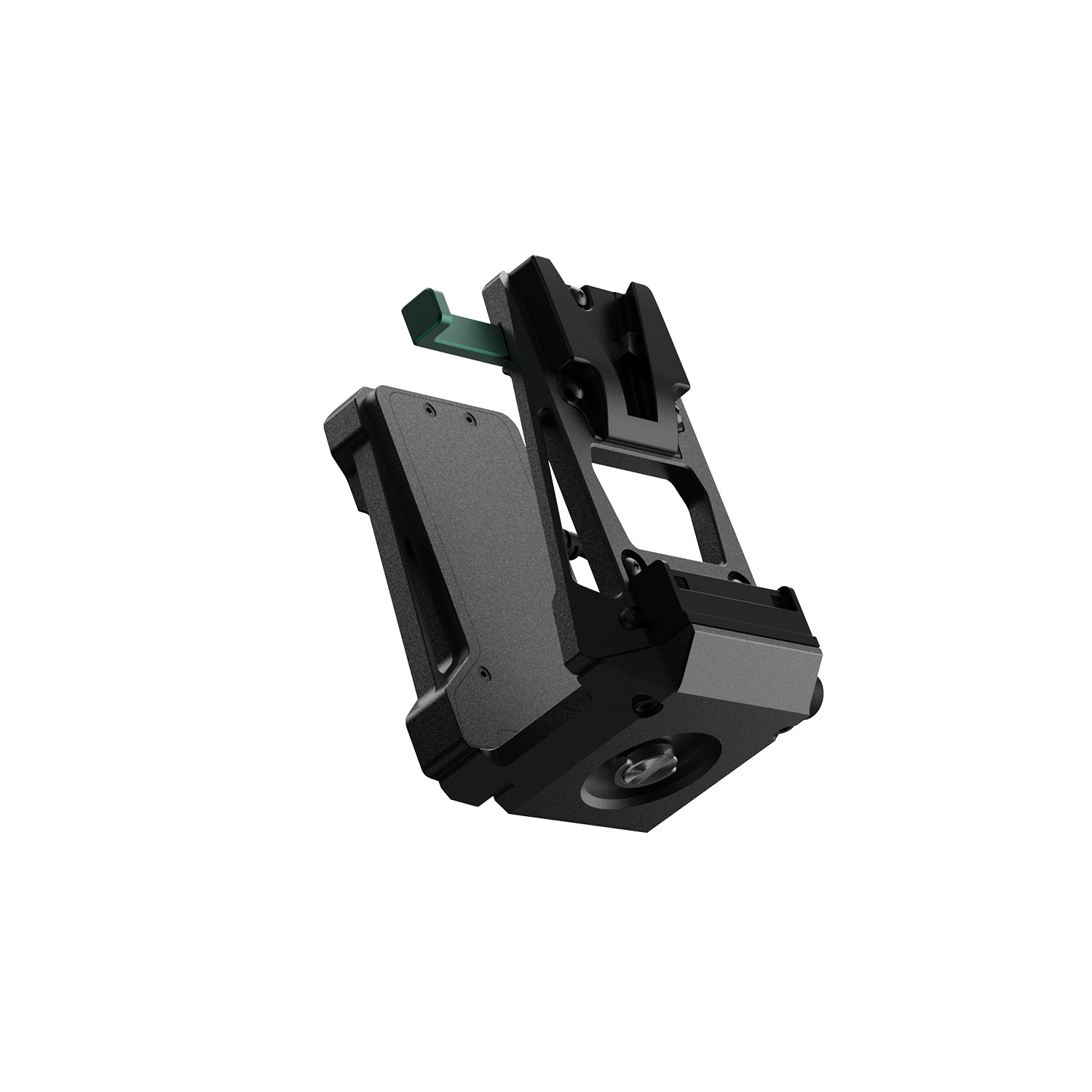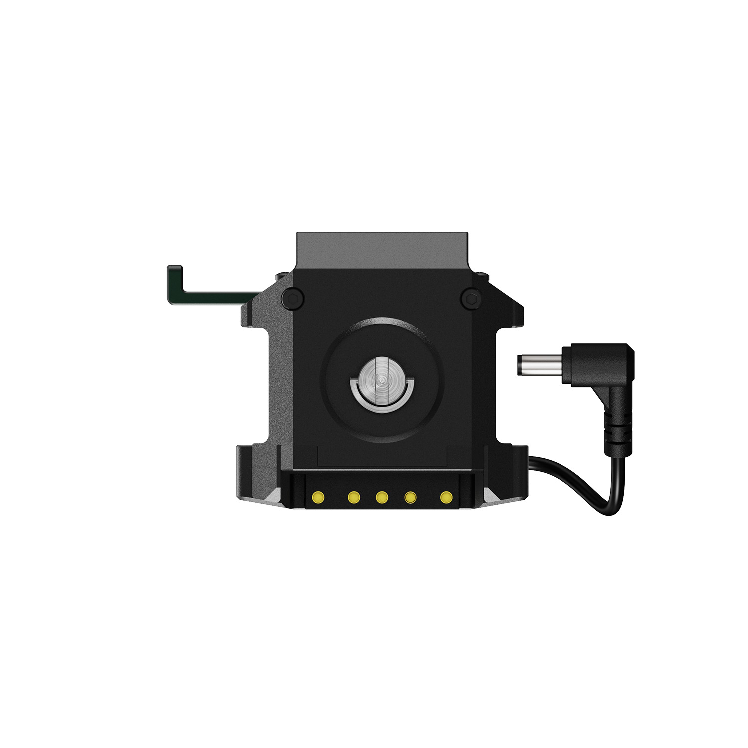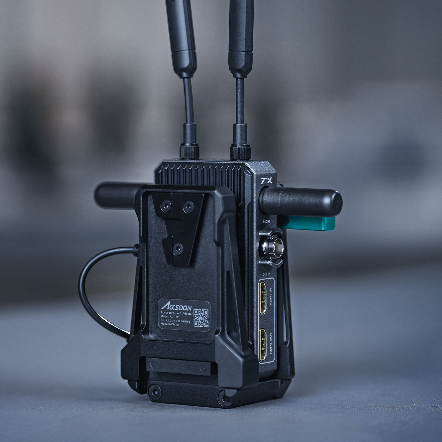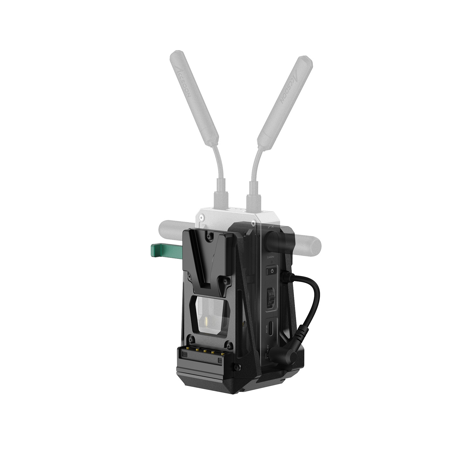 Адаптер крепится через стандартную V-Lock площадку и подключается к передатчику коротким фиксированным DC-кабелем. Питание от батареи одновременно подаётся как на камеру, так и на видеосендер. Такое решение особенно удобно для ENG-камер, зеркальных и беззеркальных камер с V-Lock креплением.