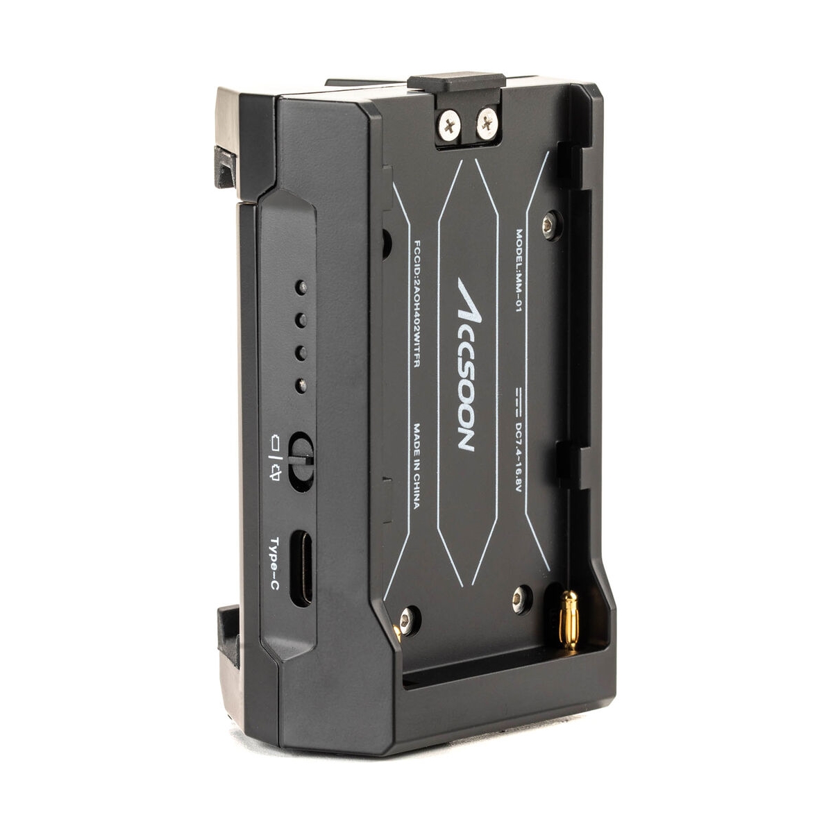 С видеоадаптером Accsoon M1 можно не беспокоиться, что кончится заряд батареи даже во время длительной съемки. Аккумуляторная площадка типа NP-F, встроенная в устройство, позволит продлить время работы, питая от аккумулятора (например, GreenBean NP-F550 PRO (3350 мАч)смартфон через комплектный кабель USB Type-C. Кроме того, на корпусе устройства расположены два выхода постоянного тока DC (7,4–16,8 В) для подзарядки камеры и дополнительное оборудования.