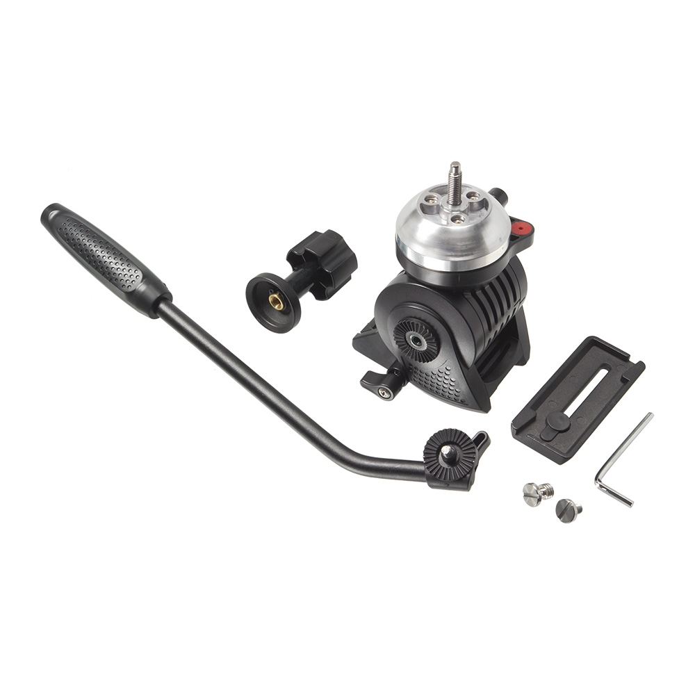 Съемная видеоголова изготовлена из ударопрочного пластика ABS и крепится к штативу с помощью чаши 75 мм. Система жидкостного демпфирования по оси наклона и панорамирования создает необходимое усилие, противостоящее нежелательным рывкам. Механизм контрбаланса обеспечивает возможность центровать угол наклона камеры и приводит голову в исходное горизонтальное положение. Быстросъемная скользящая площадка оборудована механизмом, предохраняющим камеру от случайного выскальзывания при ослаблении зажима. Для установки камеры в комплект входят винты 1/4" и 3/8". В основание головы встроен пузырьковый уровень, который поможет выставить камеру по горизонту.