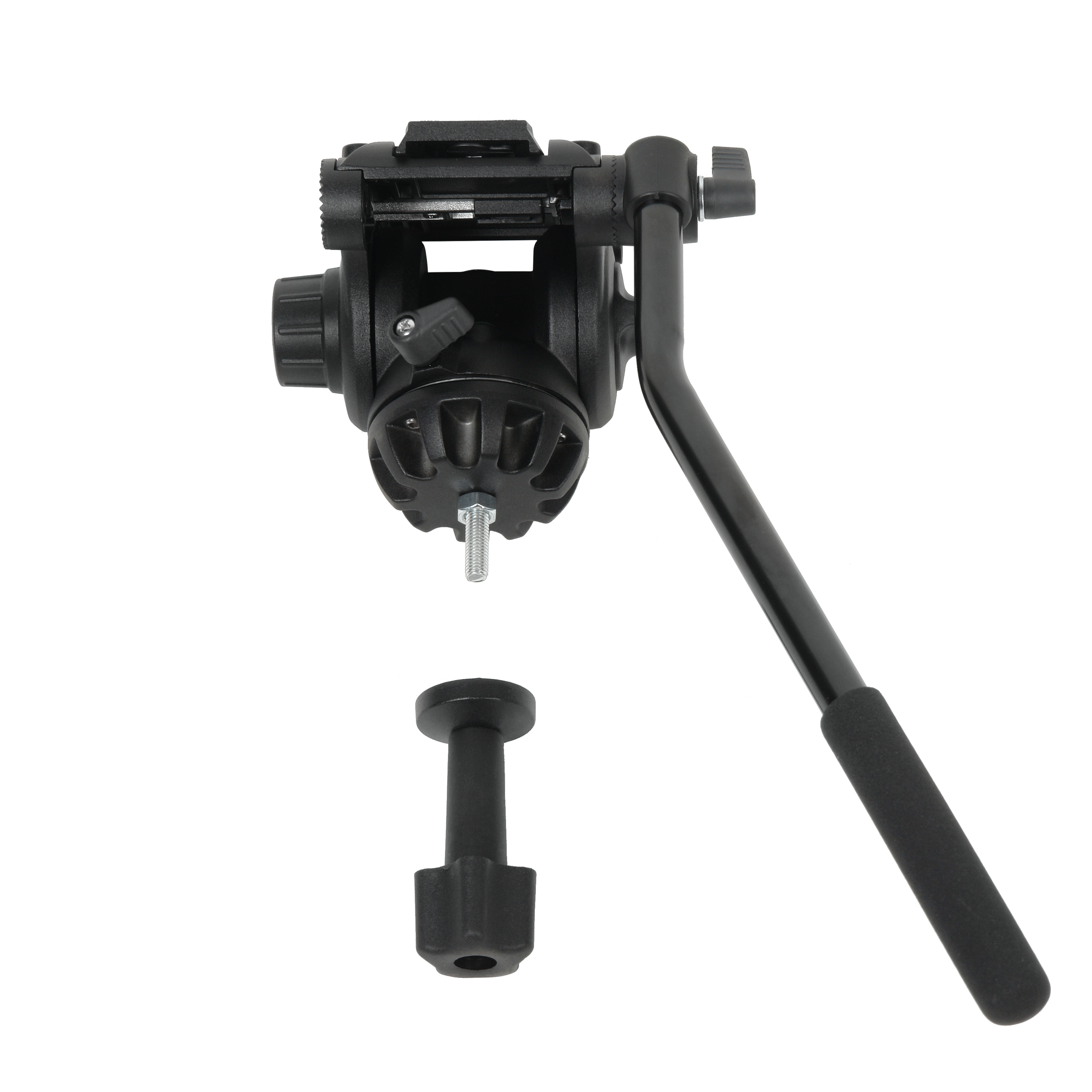 Штатив оснащен жидкостной 2D-видеоголовкой с механизмом контрбаланса и регулируемым демпфированием наклона. Видеоголова со стандартным шаровым креплением установлена в чашу Ø75 мм. Это дает возможность быстро настроить горизонтальное положение камеры для съемки, ориентируясь по пузырьковому уровню на головке.