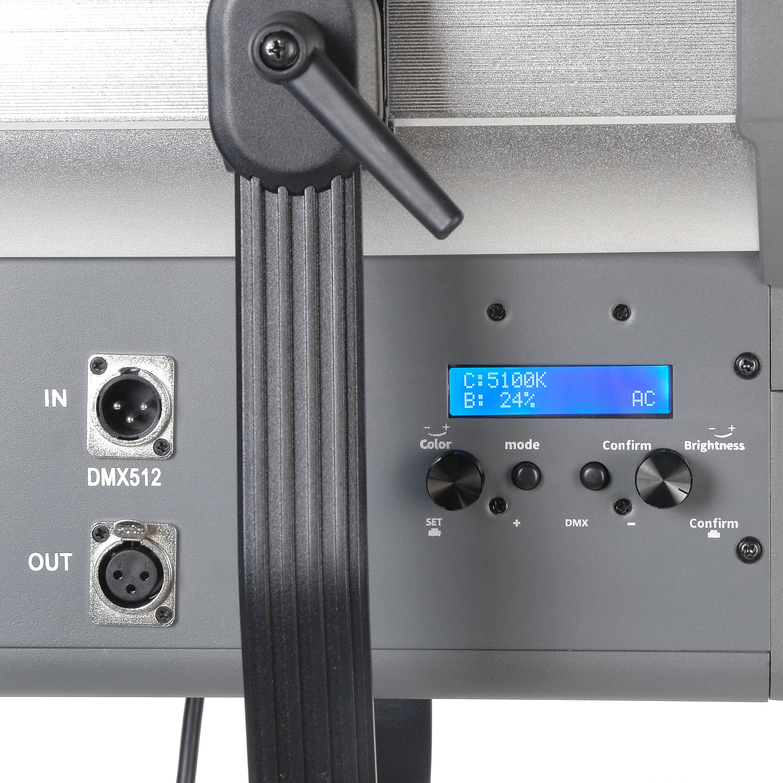 Яркий ЖК-дисплей помогает установить необходимое значение мощности, цветовой температуры, выбрать режим работы и задать номер канала DMX. Прибор позволяет плавно регулировать яркость от 5 до 100% (с шагом 1%), цветовую температуру 2800 до 6500К (с шагом 100К). Цифровой дисплей поможет точно выставить параметры осветителя и быстро вернуться к необходимым настройкам.