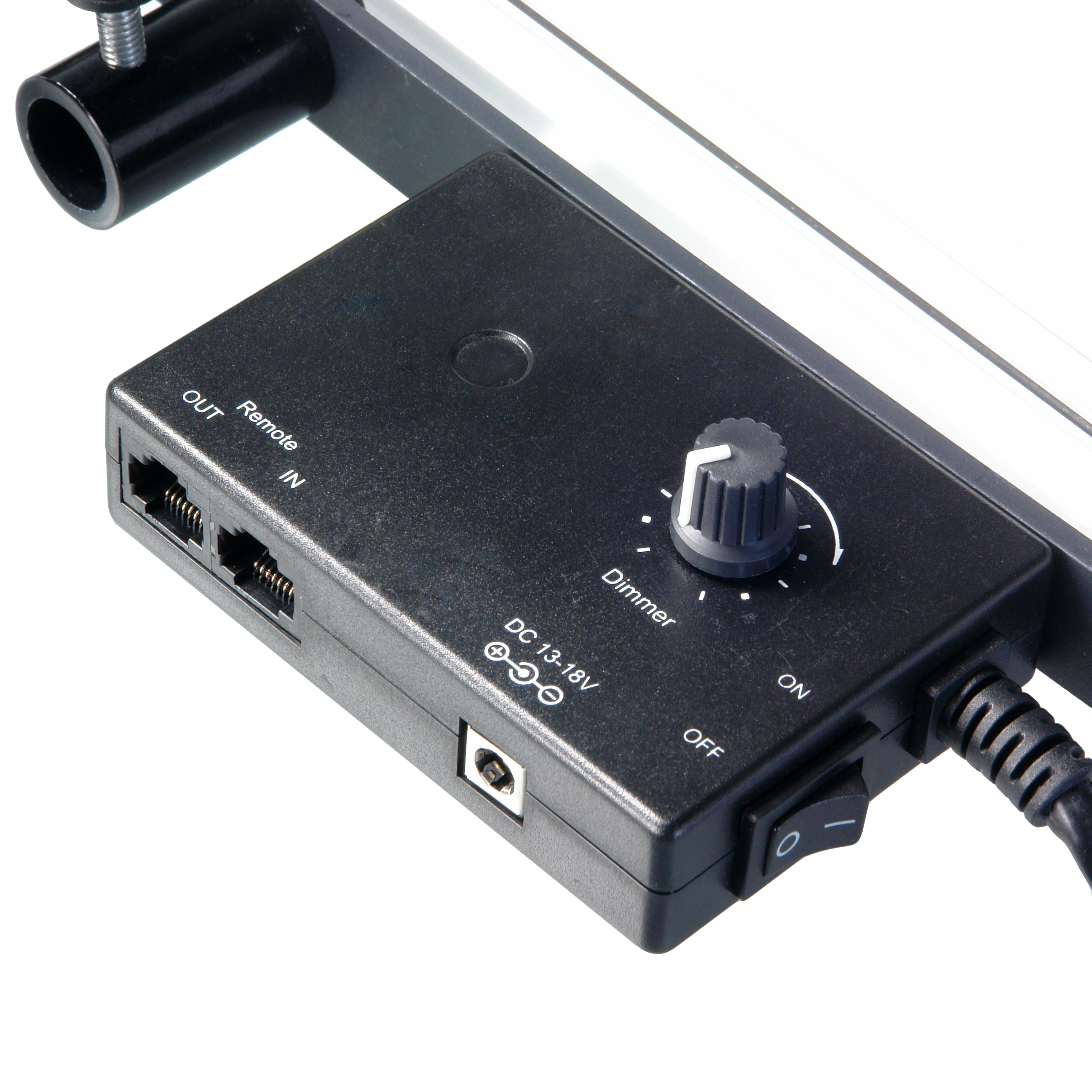 Пульт управления подключается к модулю управления с помощью кабеля (Cat 5e) и позволяет дистанционно регулировать мощность осветителя или группы осветителей, для этого в модуле управления предусмотрен дополнительный выходной разъем связывающий осветители в группу. Пульт и два кабеля включены в стандартный комплект поставки.