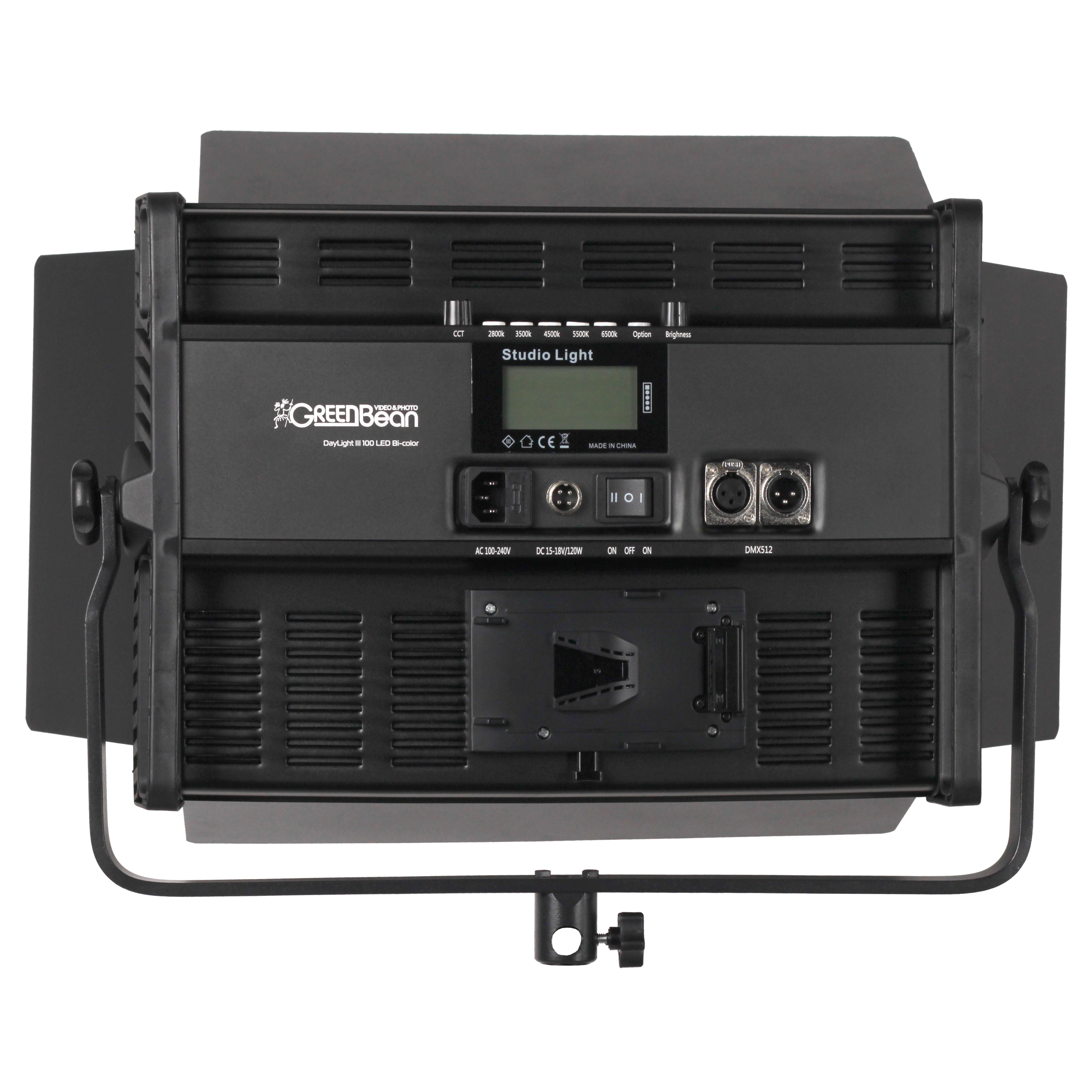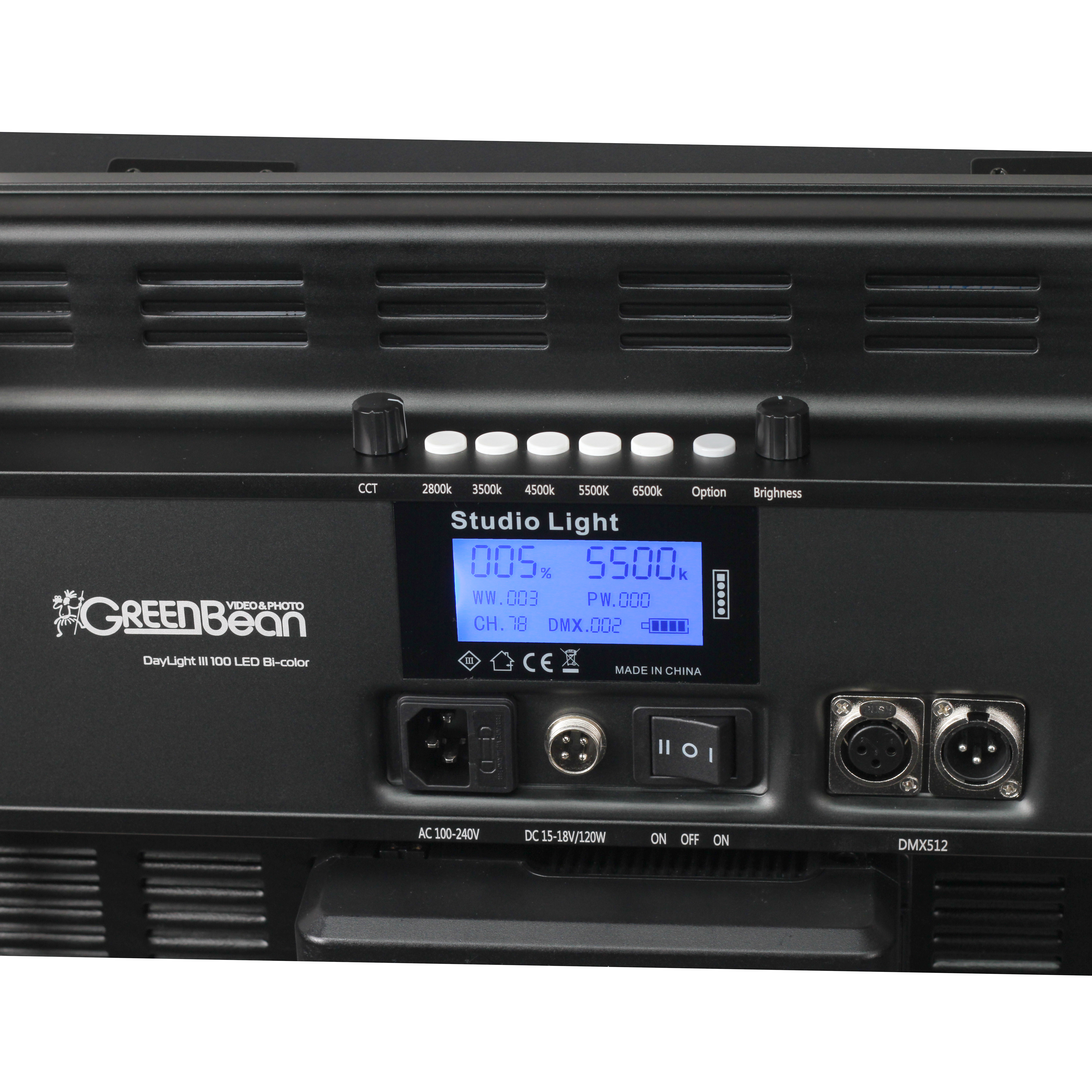 GreenBean DayLight III 100 LED Bi-color – осветитель нового поколения серии DayLight со сверхъяркими SMD-светодиодами и возможностью дистанционного управления со смартфона по Bluetooth или по протоколу DMX512. Предназначен для создания яркого «дневного» освещения в кино-, видео- или фотосъемке, может использоваться в офисе, профессиональной студии или на телевидении.