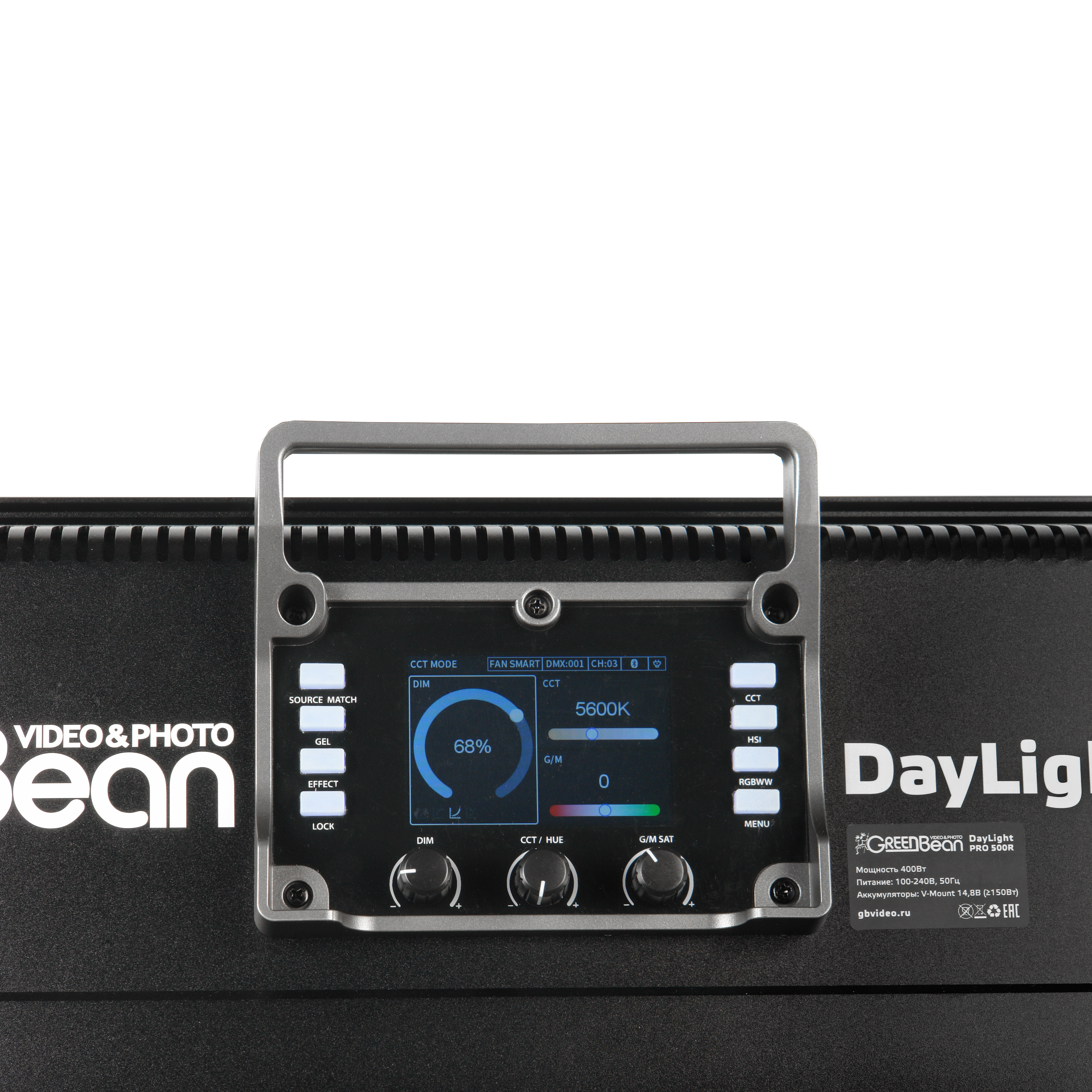GreenBean DayLight PRO 500R – мощная RGB светодиодная панель с современными яркими SMD светодиодами с высоким уровнем цветопередачи CRI более 95. Регулировка цветовой температуры в широком диапазоне от 2700K до 10000K, включая тонкую настройку баланса Green/Magenta, позволит согласовать параметры освещения с другими источниками света на площадке. Цветные режимы освещения предоставляют полный контроль: работа в HSI, управление каналами RGBCW и библиотека виртуальных гелей (GEL). Встроенные динамические спецэффекты будут полезны для различных сценариев освещения в кино- или видеосъемке.