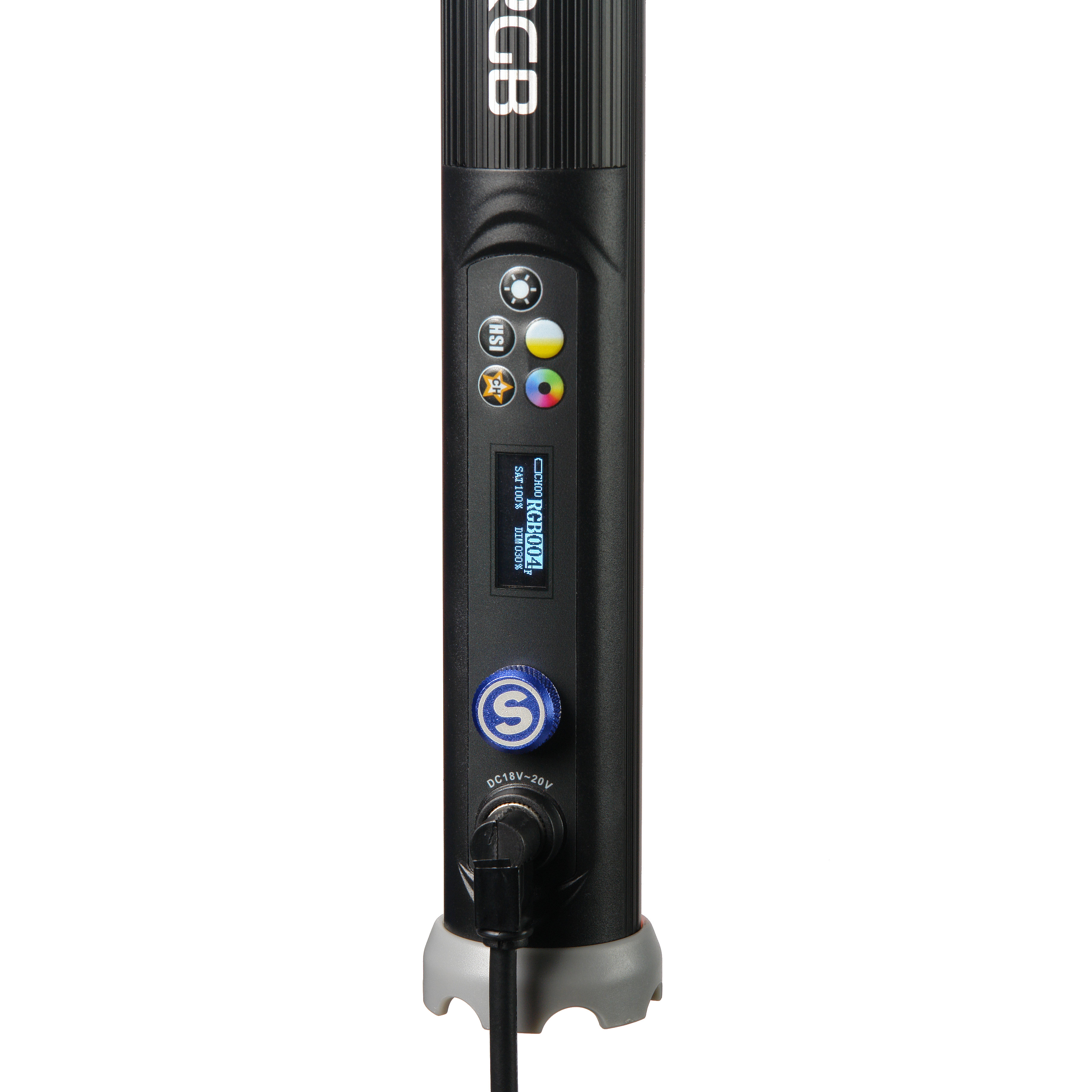 Панель управления, расположенная на корпусе осветителя, позволяет менять такие параметры как яркость осветителя, цветовая температура; оттенок, насыщенность и интенсивность цветного освещения; выбор и управление предустановленными светоцветовыми эффектами ; номера радиоканала.