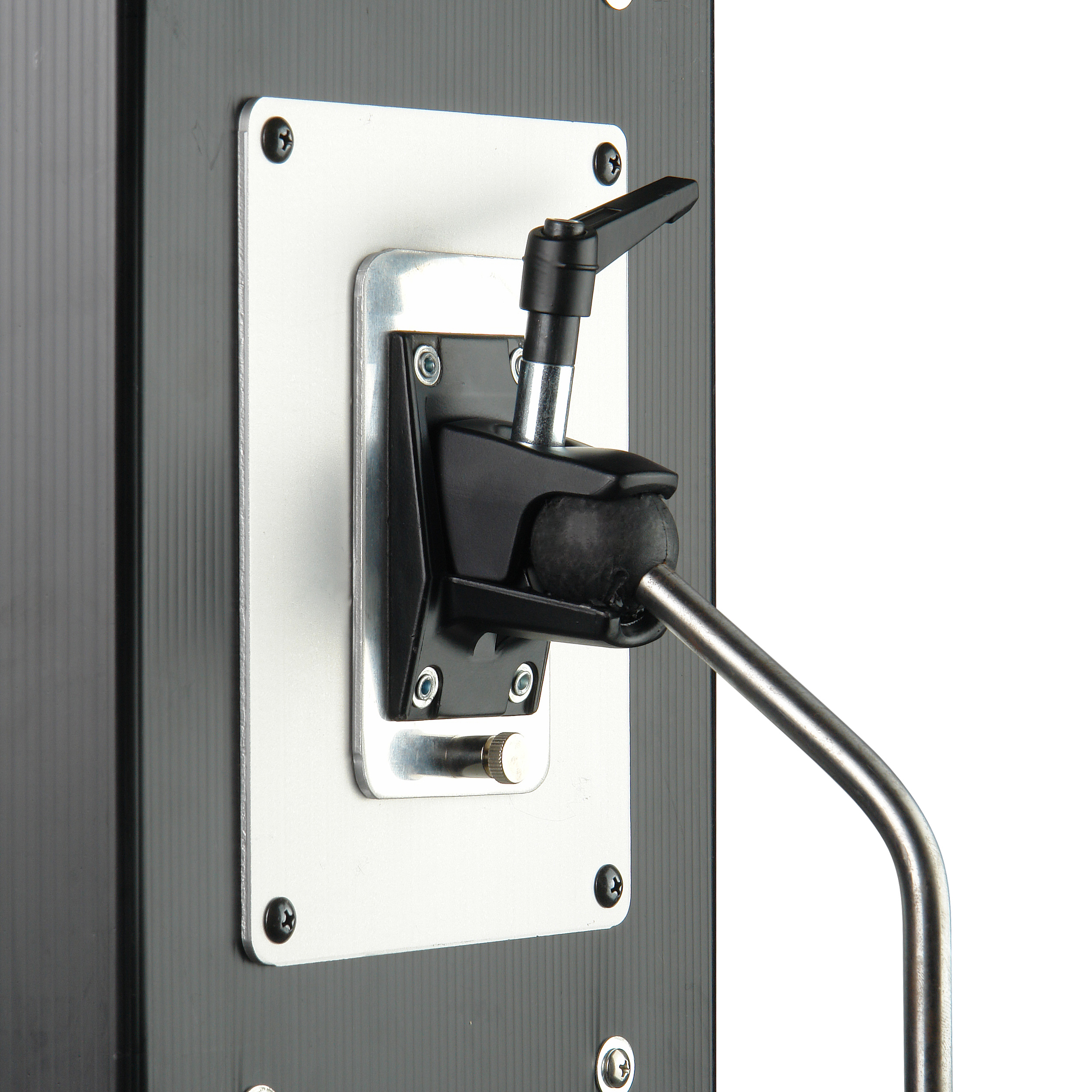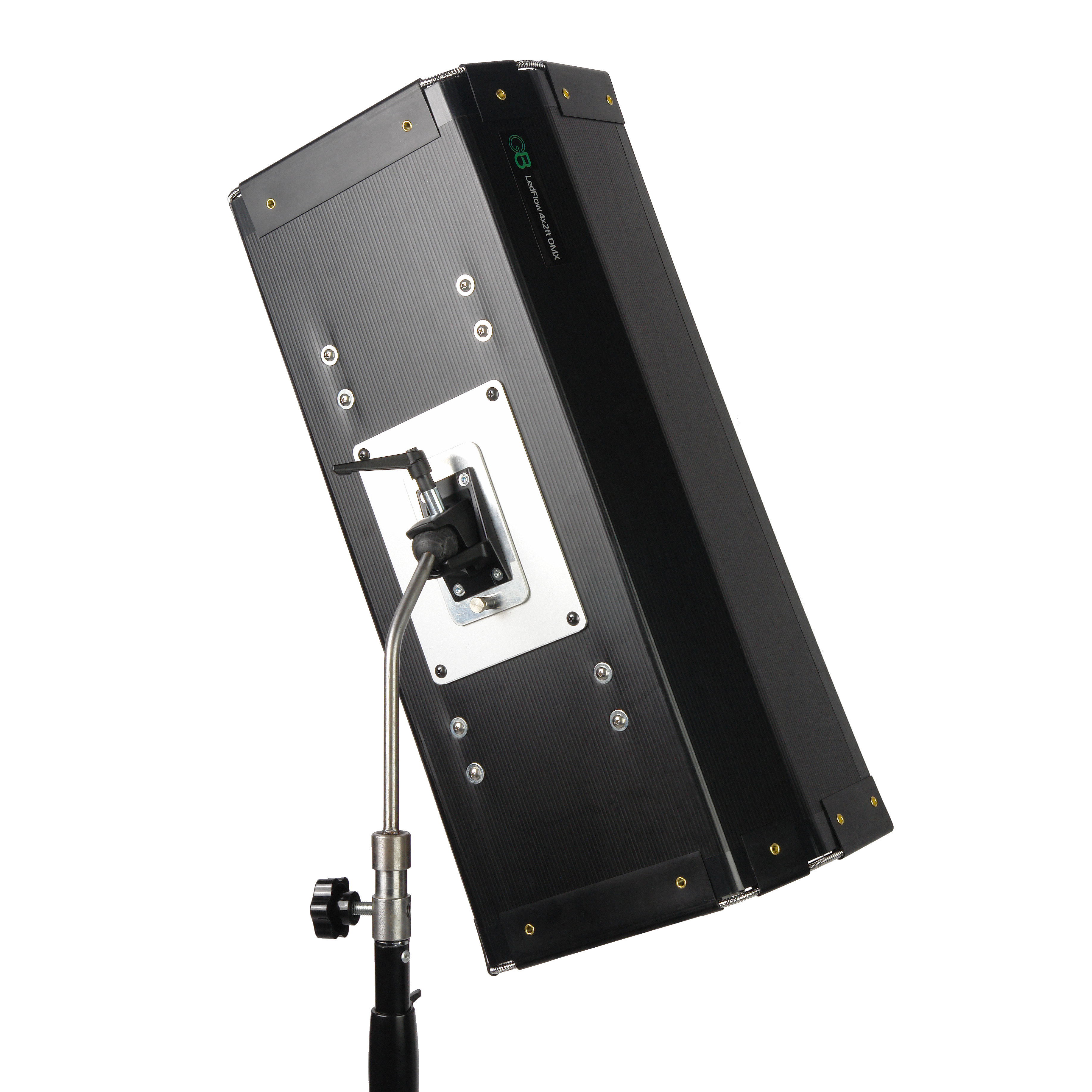 Осветитель LedFlow Bi-color DMX, вынутый из каркаса, может закрепляться на осветительной стойке, устанавливаясь в дополнительно приобретаемый держатель GreenBean LedFlow Clamp X2. Осветитель можно держать в руке или закрепить, например на кинотейп.