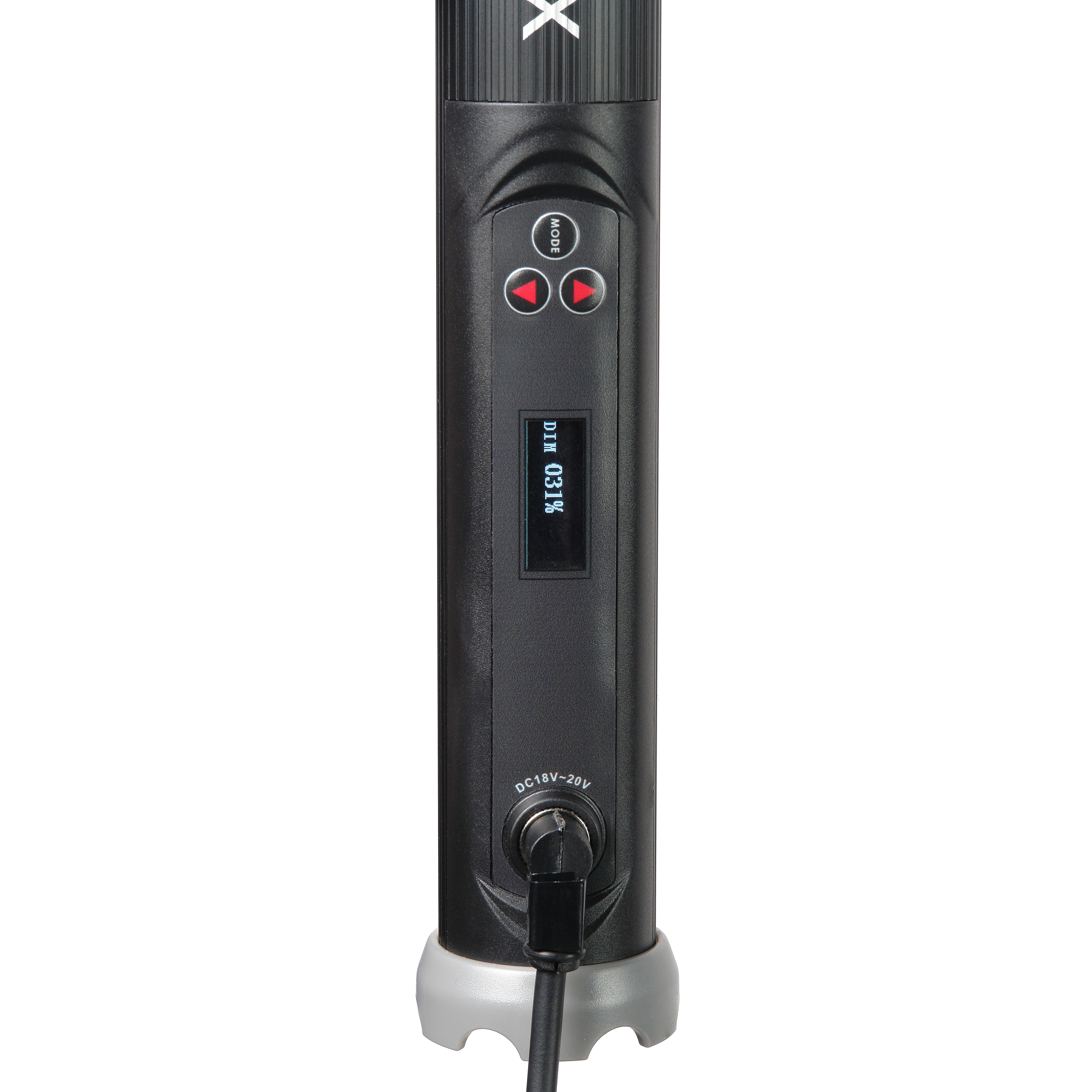 Управление каждого параметра осветителя независимое - цветовая температура каждого осветителя изменяется от 2700 до 6500К с шагом 50 К при помощи регулирования 56 сдвоенных светодиодов теплого и холодного белого света. Яркость освещения меняется от 0 до 100% с шагом 1%. Параметры осветителя устанавливаются при помощи 3 пыле-влагозащищенных кнопок, расположенных на корпусе осветителя с обратной стороны. Интуитивно-понятный интерфейс дает возможность быстро сменить режим освещения. Над клавиатурой расположен OLED-дисплей с высоким разрешением размером 2.5х1 см - достаточно крупный с четкими символами, отображающий установленные параметры.