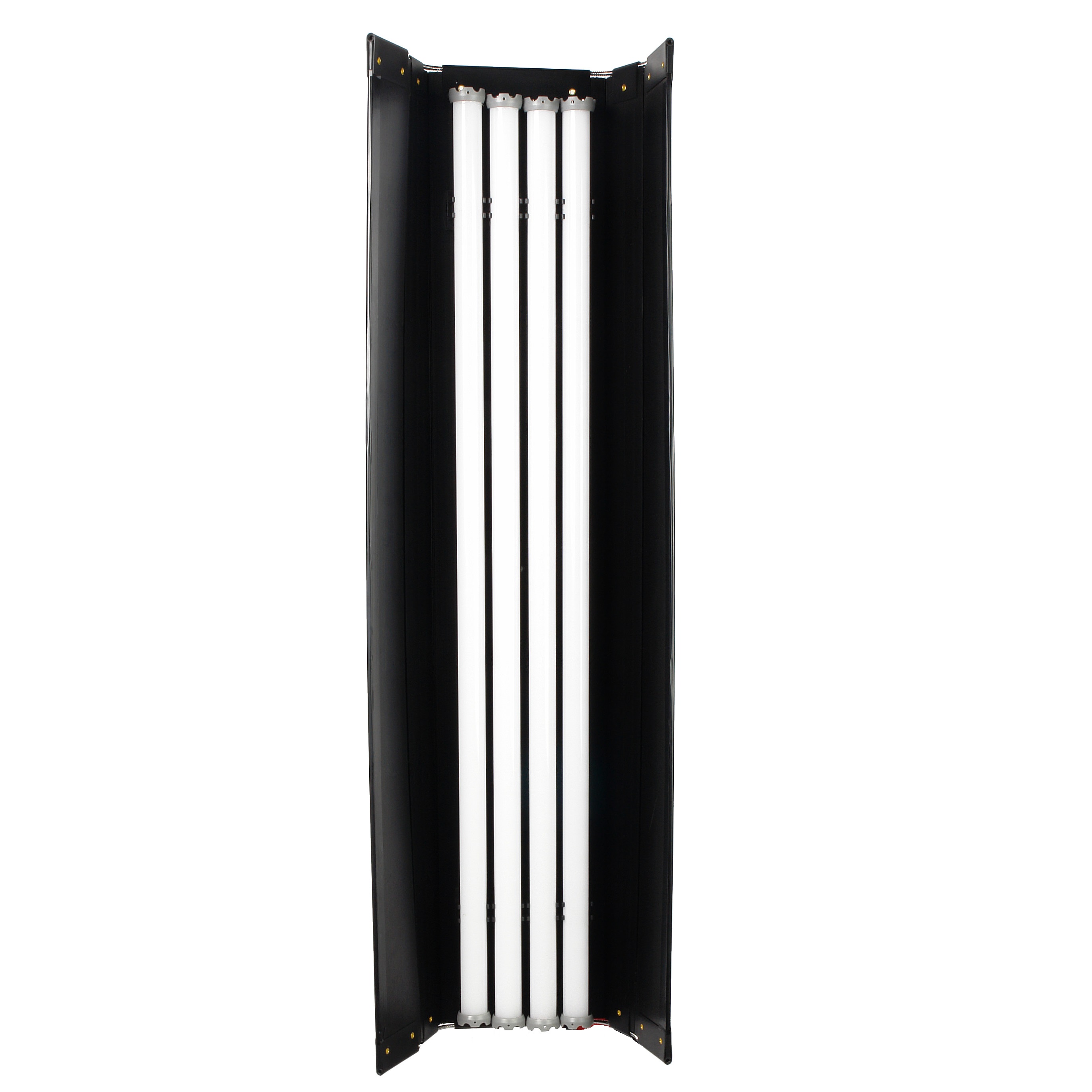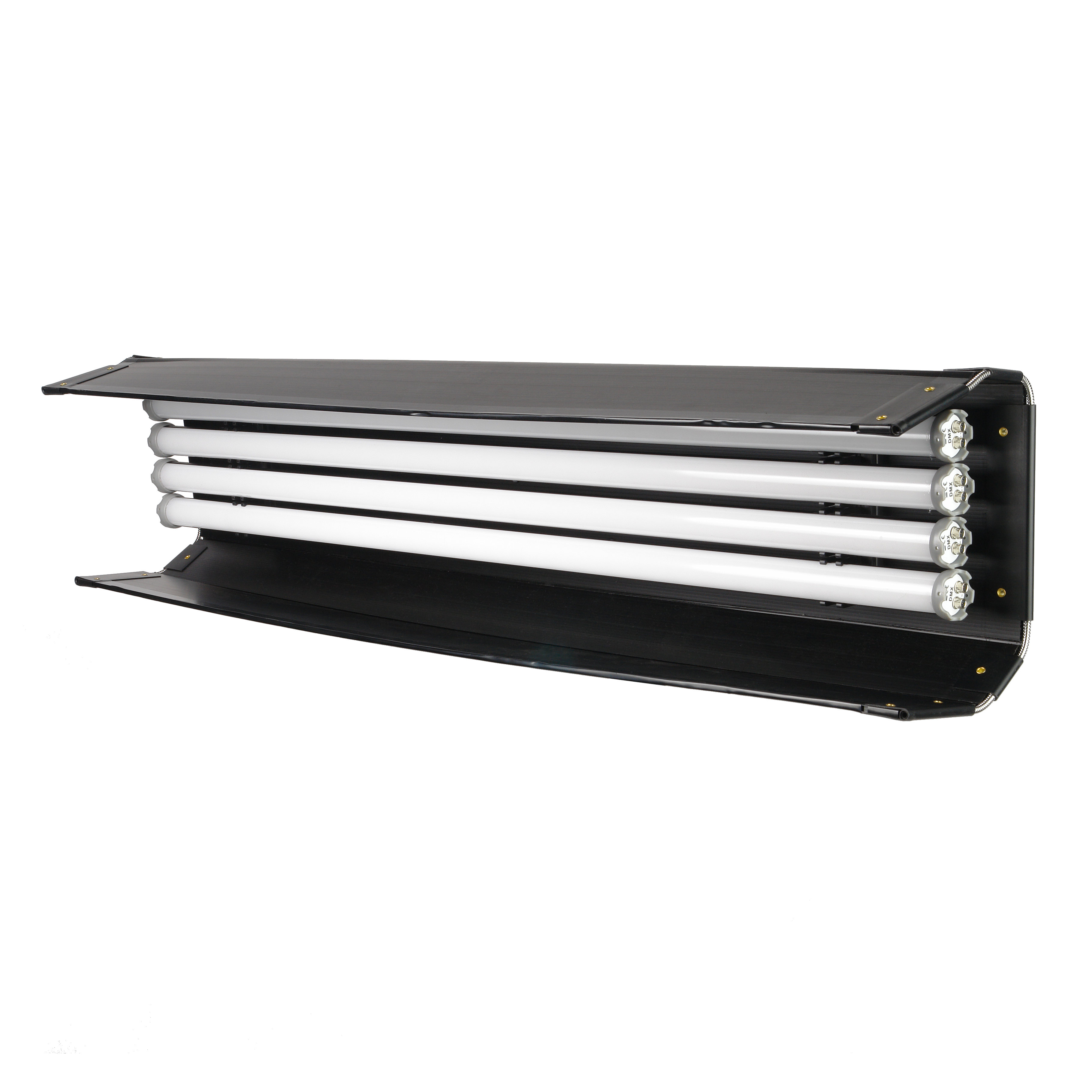 В сложенном виде каркас очень компактный - 126х23.5х10 см, а сложенные шторки предохраняют осветители от повреждений во время транспортировки. Вес осветителя 4.8 кг.