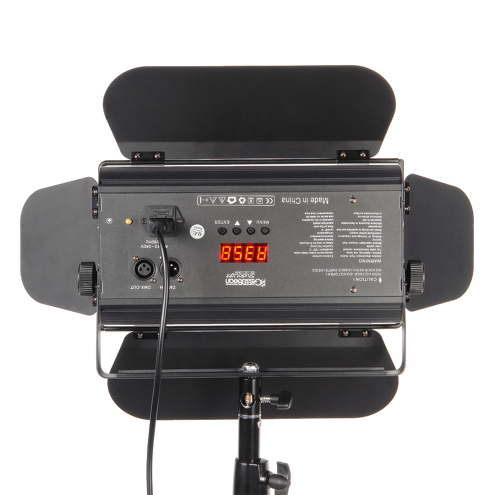 Выбор режимов освещения осуществляется при помощи 4-х кнопок на панели управления. Текущие значения параметров отображаются на четырехзначном цифровом дисплее с подсветкой размером 50х20 мм. Выбор каналов осуществляется от 1 до 512. Яркость прибора регулируется плавно от 0 до 100% в режиме «постоянного света». В режиме «стробоскоп» осветитель выдает импульсы света с регулируемой частотой и яркостью.