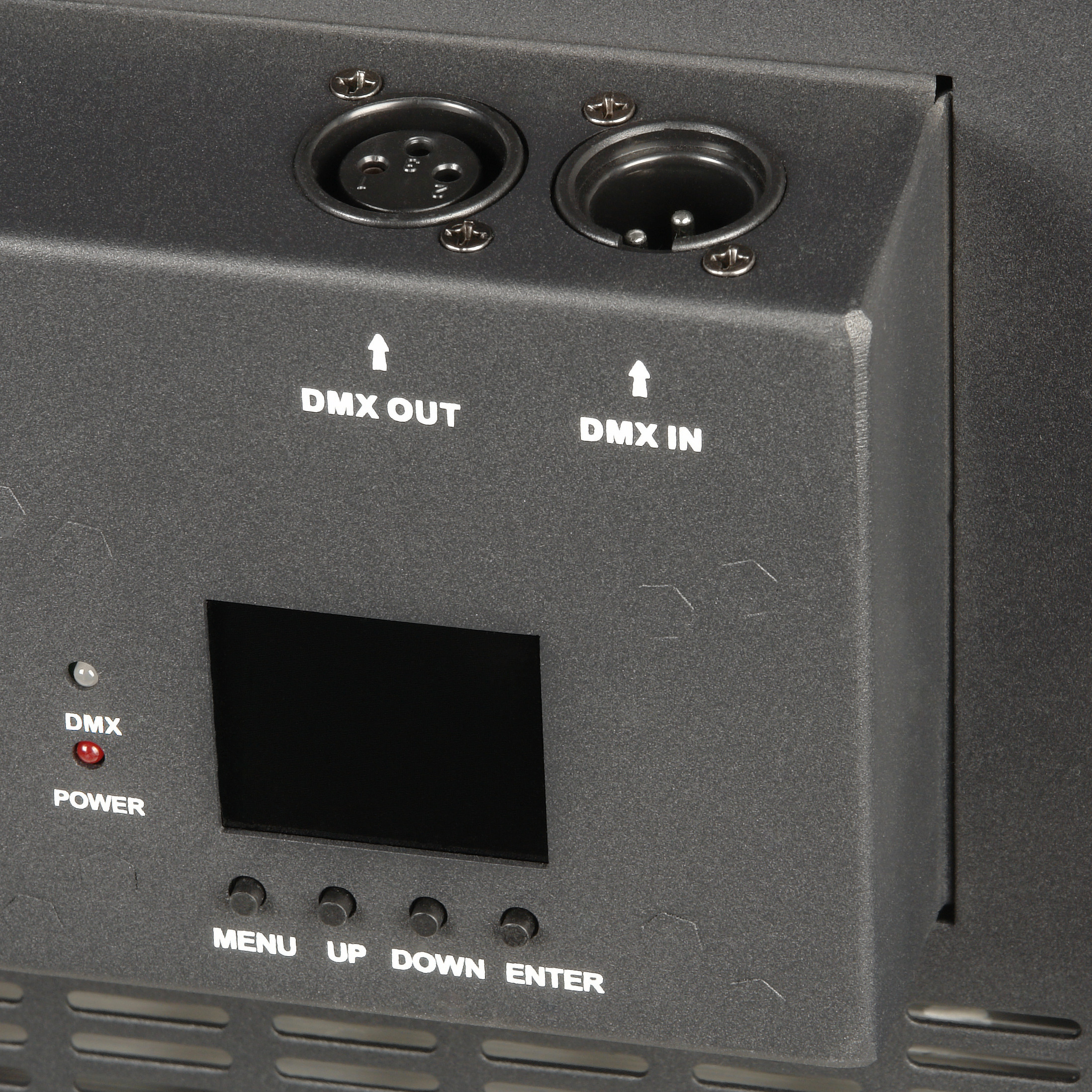 Экранное меню осветителя предоставляет следующие режимы на выбор: устанавливать адрес DMX-канала, задавать «ведущий» или «ведомый» режим работы, управлять в ручном режиме яркостью при помощи регуляторов вращения или кнопок, вызывать и настраивать режим «стробоскоп» и многое другое.