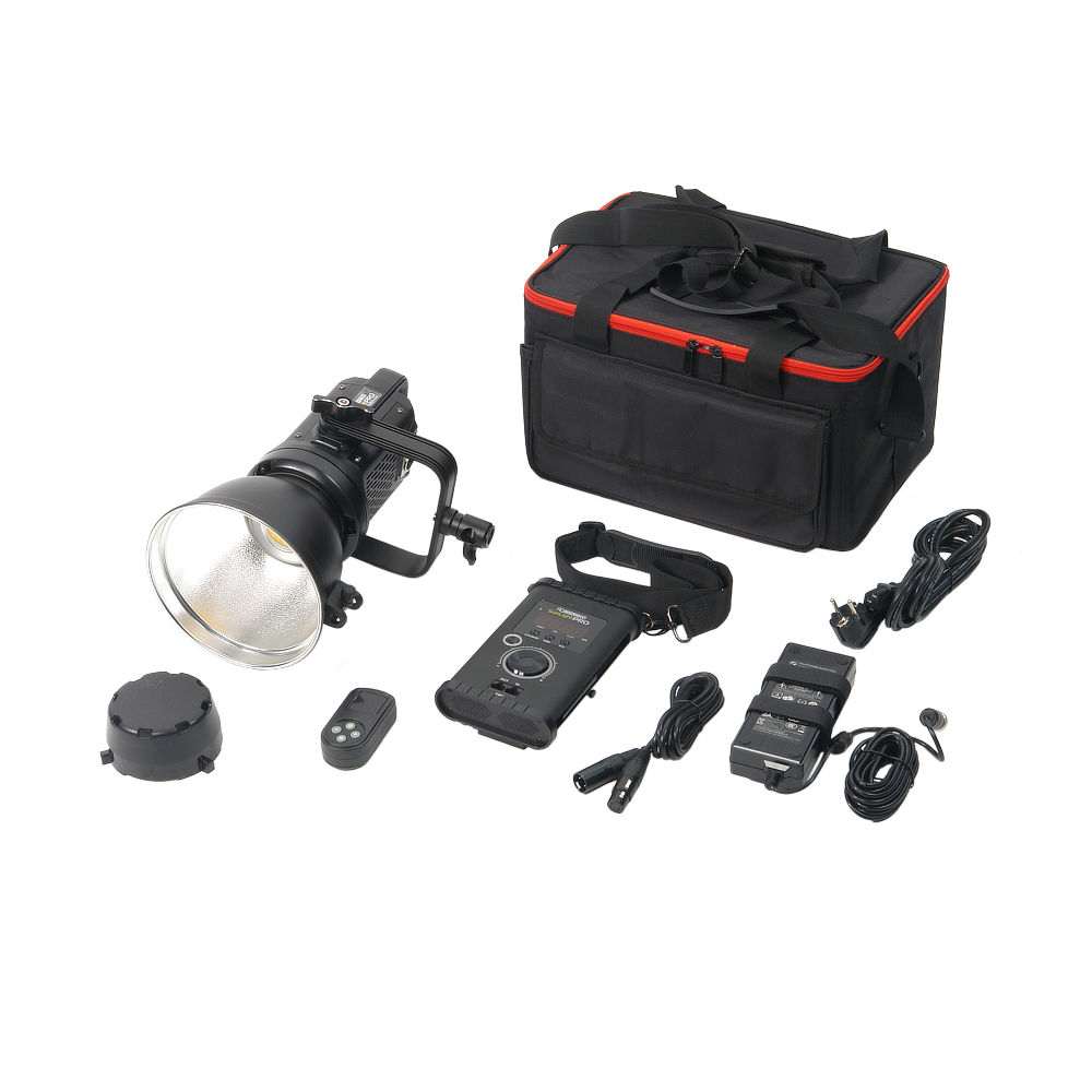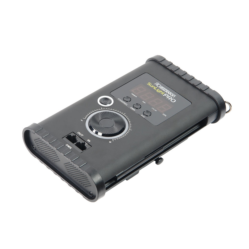 Блок управления с валкодером и цифровым дисплеем снабжен ремнем для переноски или подвешивания на стойке. Длина кабеля для соединения блока с осветителем – 1,9 м. Для питания блока и осветителя используется сетевой DC-адаптер или аккумуляторная батарея V-mount (приобретается отдельно).