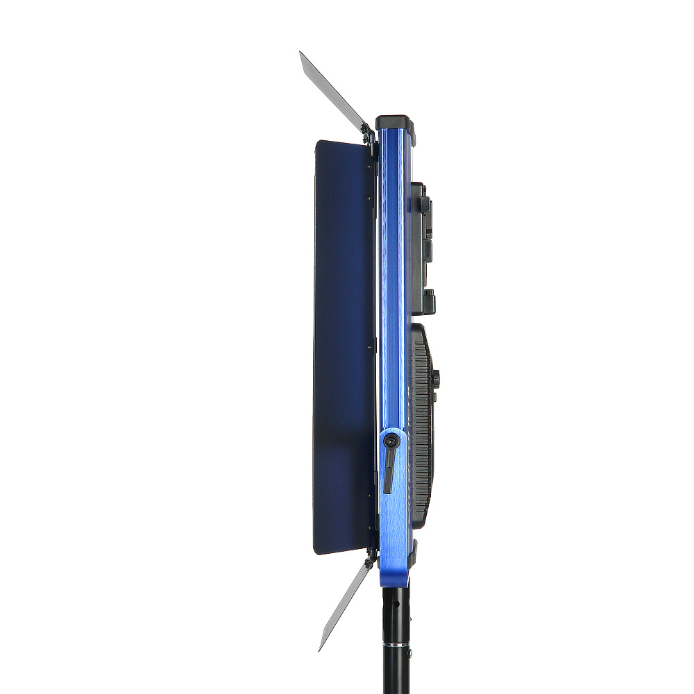 Прочность конструкции обеспечивает корпус из алюминиевого сплава. Благодаря современному дизайну легкие синие панели не затеряются среди другого оборудования на площадке. С помощью надежного кронштейна-лиры, который можно перемещать вдоль корпуса, осветитель устанавливается на стойки, краны, подвесные системы с посадочным местом 5/8”. В комплект входят съемные металлические шторки со стальными крепежными элементами.