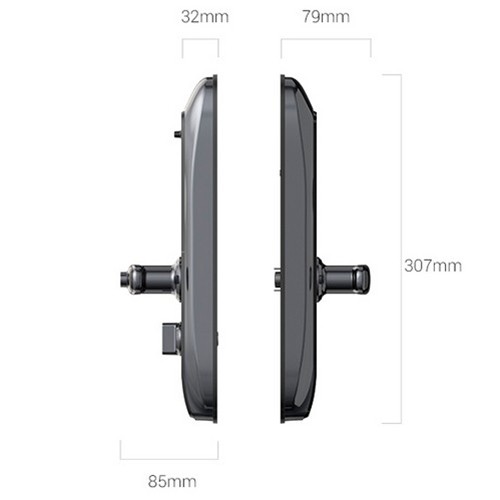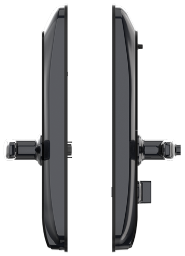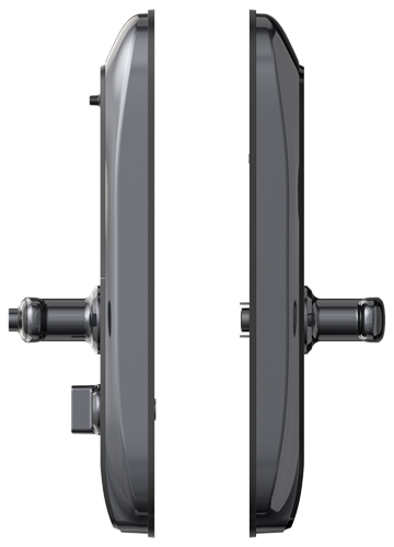 - Внешняя панель замка — оснащена биометрическим датчиком отпечатков пальцев, сенсорной клавиатурой, замочной скважиной и разъёмом для аварийной подзарядки (microUSB).