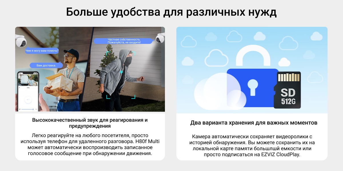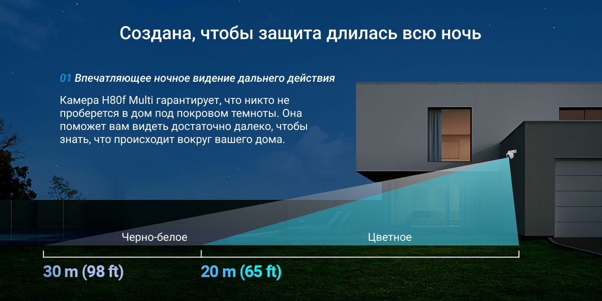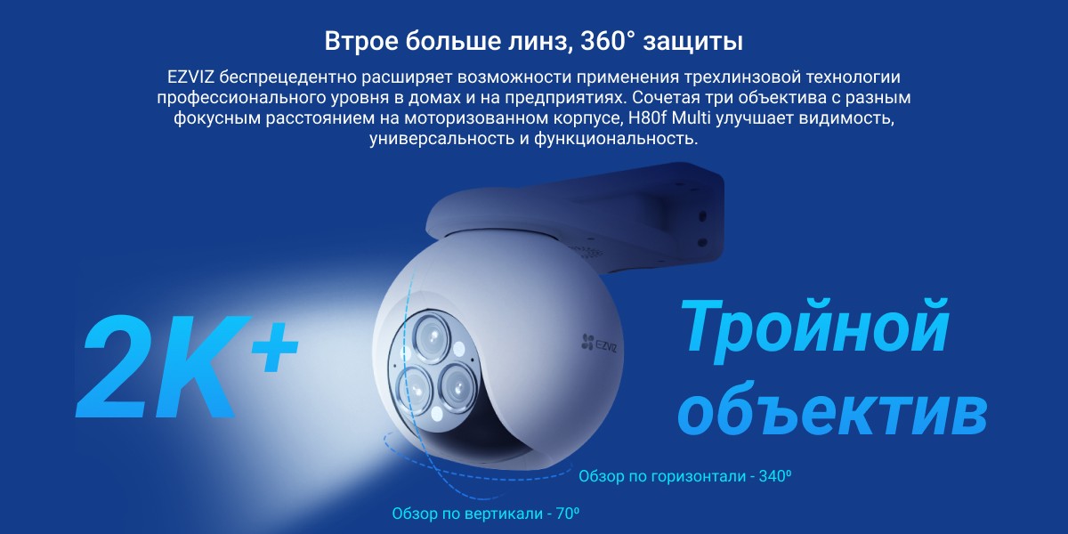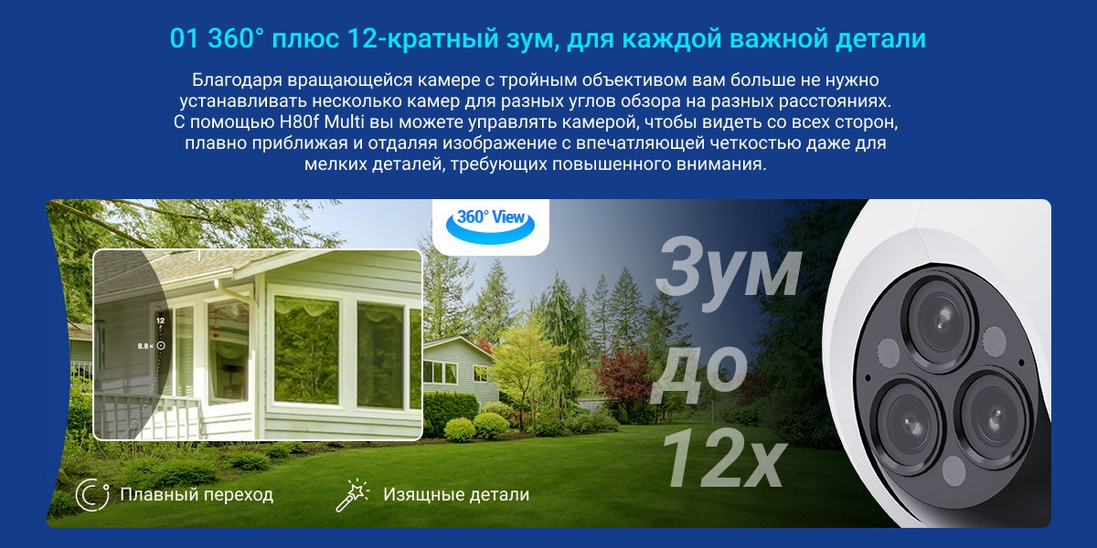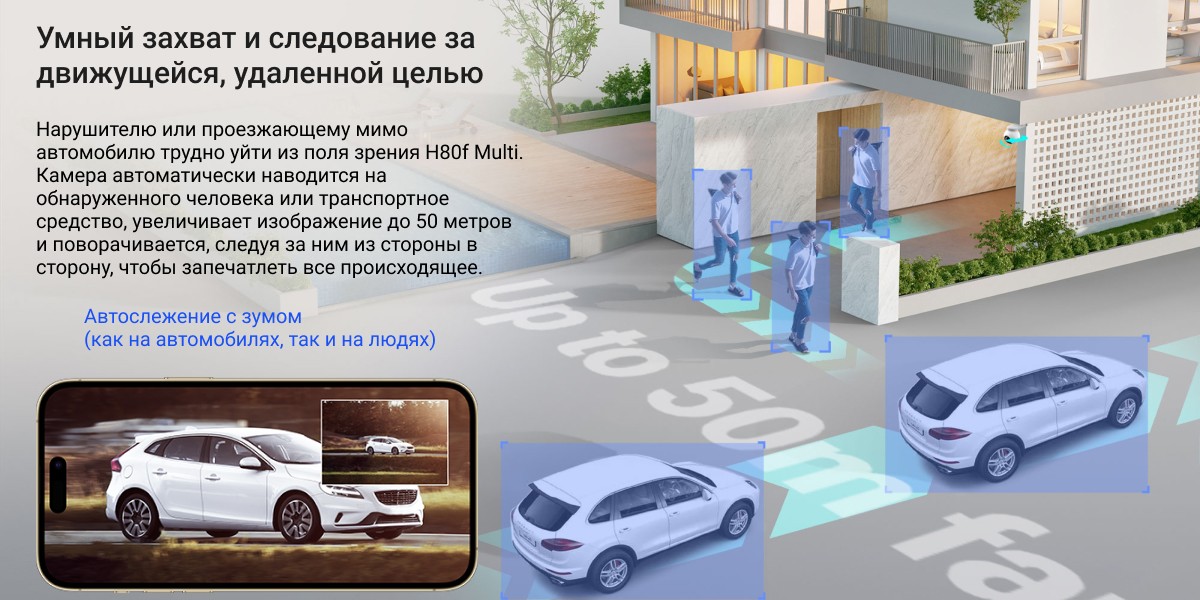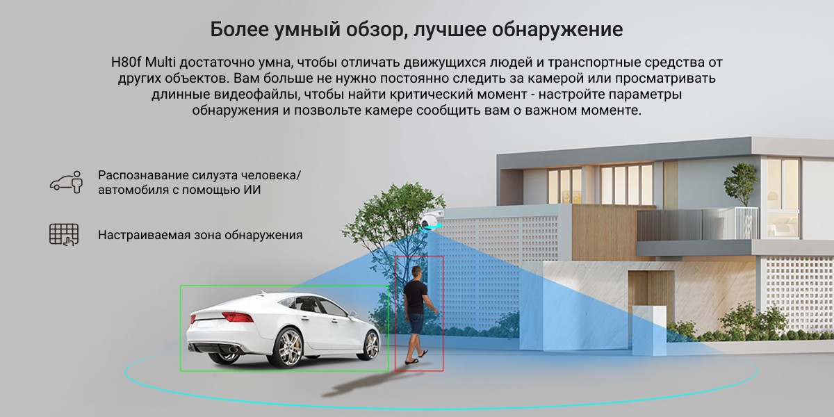 Видит, масштабирует и защищает, как никогда раньше. H80f Multi, первая уличная камера EZVIZ с тремя объективами, предназначена для обеспечения исключительной безопасности на улице с невиданным профессионализмом. Интегрированные возможности трех мощных объективов 2K+ позволяют камере одновременно захватывать широкий обзор и детали крупным планом, поддерживаемые невероятным, не размытым 12-кратным зумом. Встроенный искусственный интеллект может эффективно обнаруживать и фиксировать как людей, так и транспортные средства, записывая происходящее слева направо, а вы получаете более информативные мобильные оповещения, сопровождаемые двойными снимками как посетителя, так и автомобиля.
