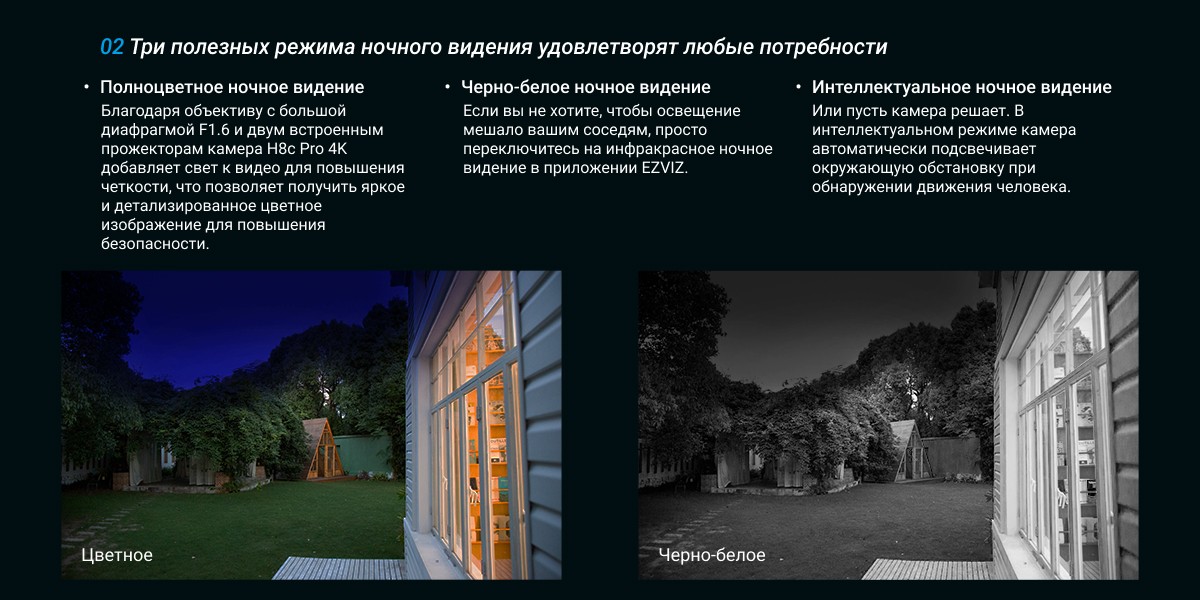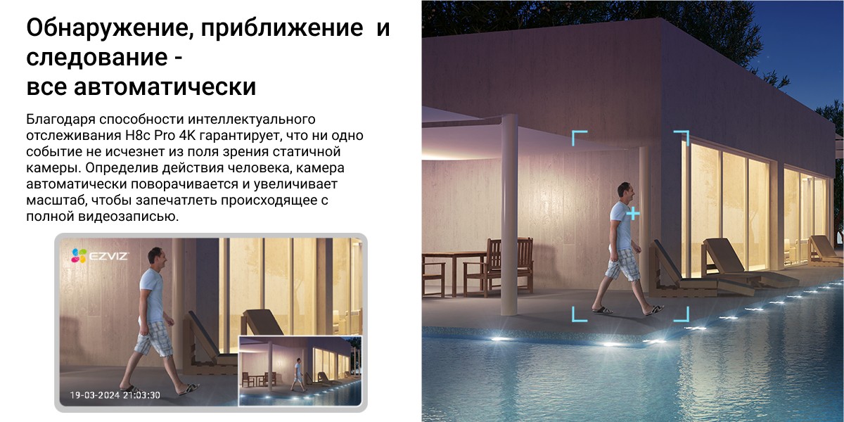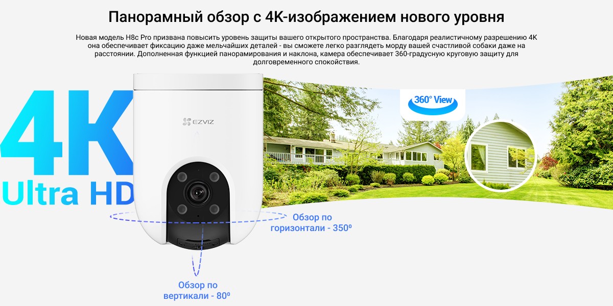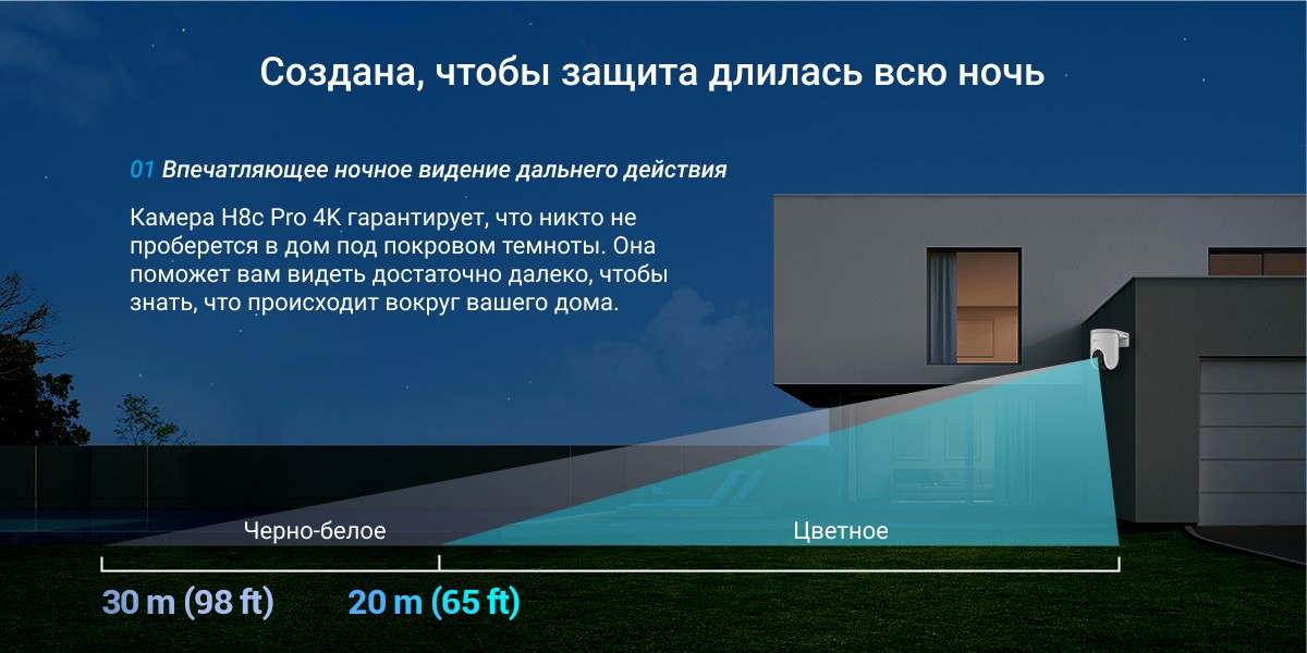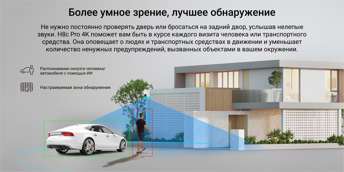 Умная безопасность с изысканным 4K. Пора обновить систему наружного наблюдения до четкости 4K Ultra HD. Эта камера, ставшая последним дополнением к бестселлеру H8c Pro, обеспечивает потрясающую детализацию на 360 градусов и значительно сокращает «слепые зоны», обеспечивая душевное спокойствие. Будучи многофункциональной камерой, H8c Pro не только улучшает визуальное восприятие, но и позволяет лучше защитить окружающее пространство благодаря своим универсальным функциям обнаружения. Видеть, обнаруживать, сдерживать и взаимодействовать можно с помощью всего одной камеры H8c Pro.