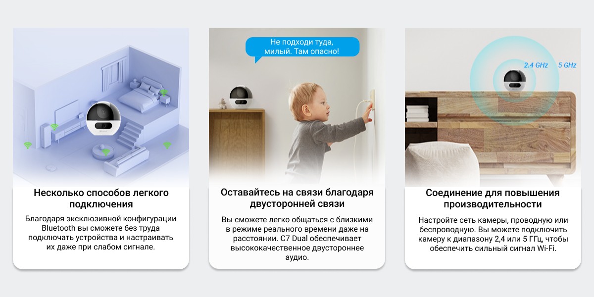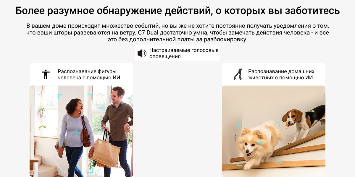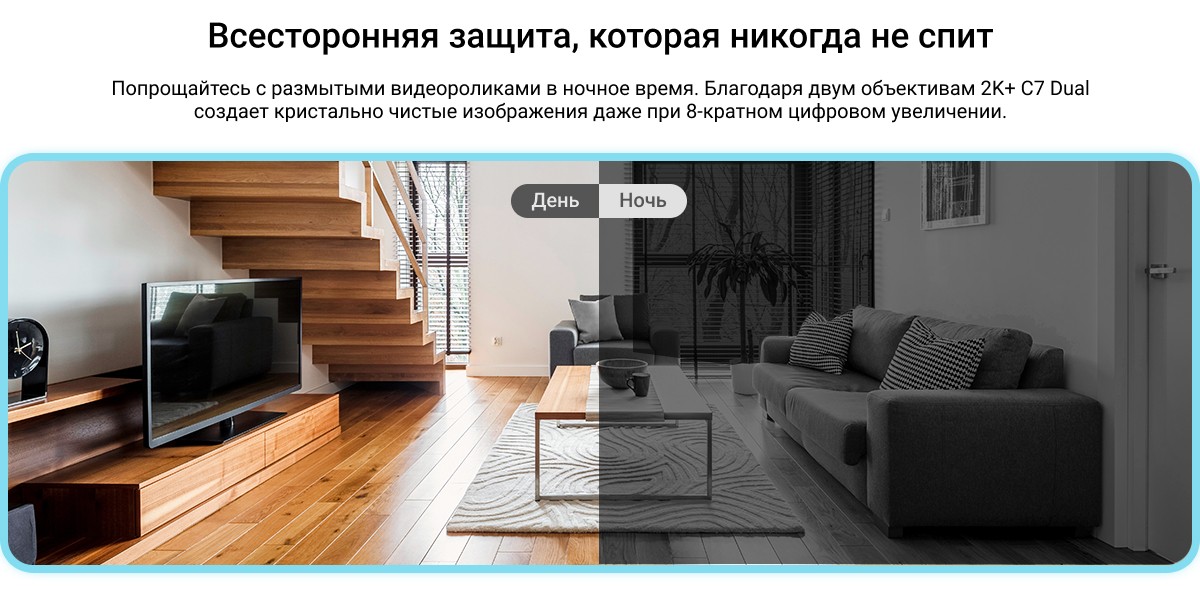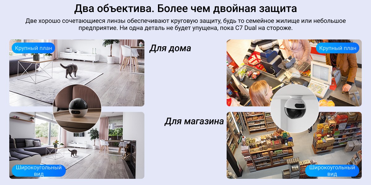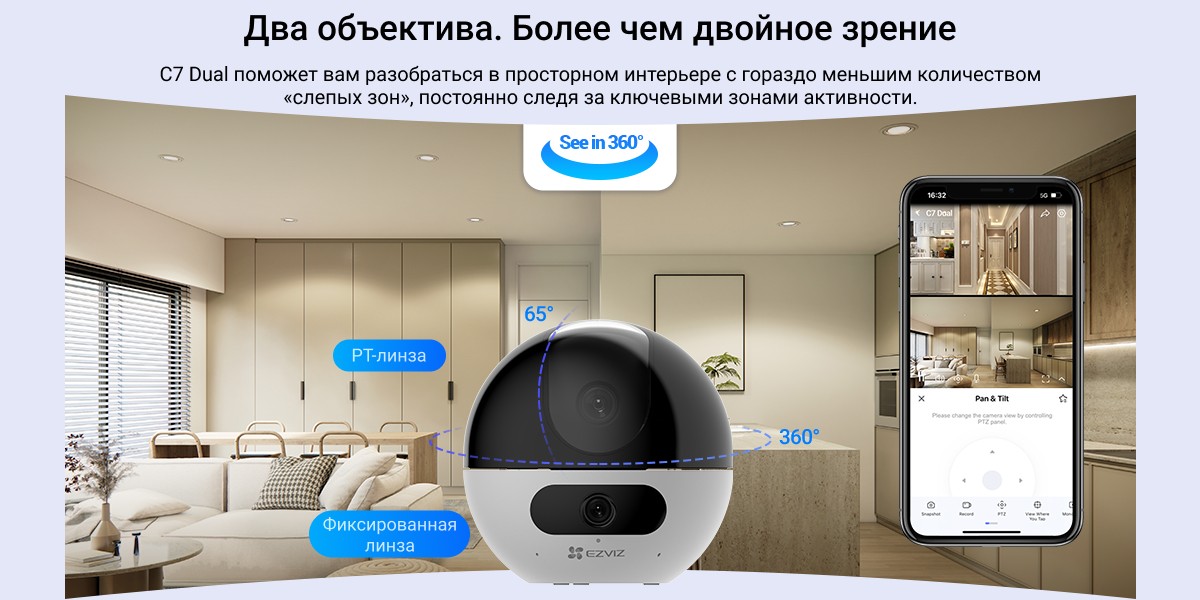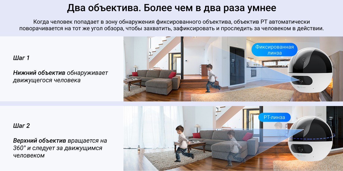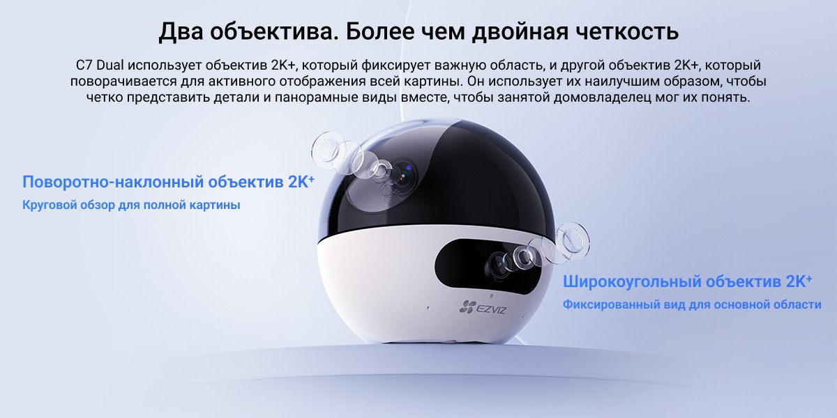 Четкое и полное покрытие с двумя объективами. Намного более продвинутая, чем ваши обычные камеры, C7 Dual в форме шара использует два интеллектуальных объектива 2K+ для обеспечения защиты, которая может быть лучше, чем у комплекта из двух камер. Благодаря уникальной технологии совместного обнаружения EZVIZ два объектива могут снимать под двумя разными углами или работать бесперебойно, чтобы записывать весь процесс одного и того же действия. Она фиксирует действия, вызванные людьми, домашними животными и громкими звуками, и поддерживает эмоциональную близость вашей семьи друг к другу с помощью простых вызовов камеры.
